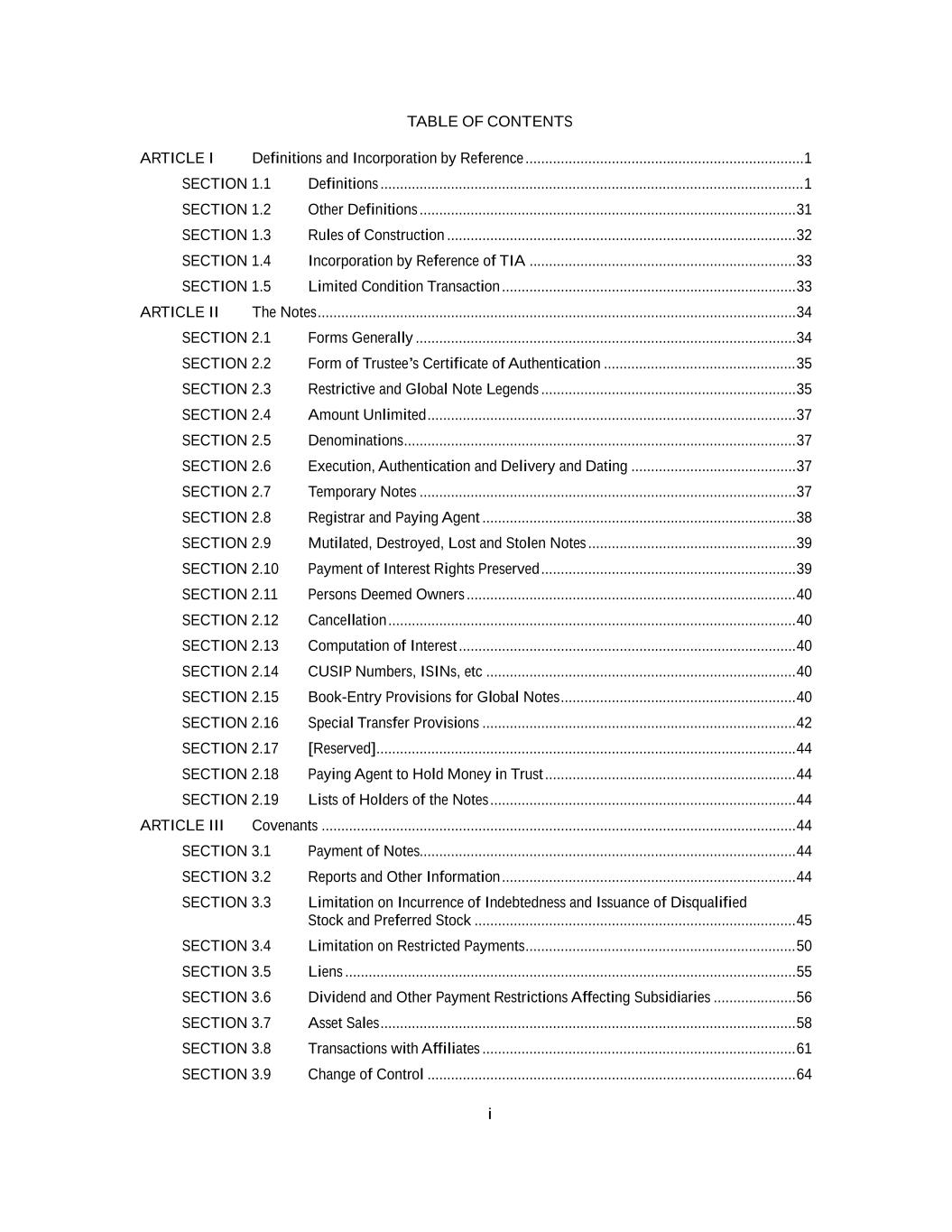 i TABLE OF CONTENTS ARTICLE I Definitions and Incorporation by Reference ....................................................................... 1 SECTION 1.1 Definitions ............................................................................................................ 1 SECTION 1.2 Other Definitions ................................................................................................ 31 SECTION 1.3 Rules of Construction ......................................................................................... 32 SECTION 1.4 Incorporation by Reference of TIA .................................................................... 33 SECTION 1.5 Limited Condition Transaction ........................................................................... 33 ARTICLE II The Notes .......................................................................................................................... 34 SECTION 2.1 Forms Generally ................................................................................................. 34 SECTION 2.2 Form of Trustee’s Certificate of Authentication ................................................. 35 SECTION 2.3 Restrictive and Global Note Legends ................................................................. 35 SECTION 2.4 Amount Unlimited .............................................................................................. 37 SECTION 2.5 Denominations .................................................................................................... 37 SECTION 2.6 Execution, Authentication and Delivery and Dating .......................................... 37 SECTION 2.7 Temporary Notes ................................................................................................ 37 SECTION 2.8 Registrar and Paying Agent ................................................................................ 38 SECTION 2.9 Mutilated, Destroyed, Lost and Stolen Notes ..................................................... 39 SECTION 2.10 Payment of Interest Rights Preserved ................................................................. 39 SECTION 2.11 Persons Deemed Owners .................................................................................... 40 SECTION 2.12 Cancellation ........................................................................................................ 40 SECTION 2.13 Computation of Interest ...................................................................................... 40 SECTION 2.14 CUSIP Numbers, ISINs, etc ............................................................................... 40 SECTION 2.15 Book-Entry Provisions for Global Notes ............................................................ 40 SECTION 2.16 Special Transfer Provisions ................................................................................ 42 SECTION 2.17 [Reserved]........................................................................................................... 44 SECTION 2.18 Paying Agent to Hold Money in Trust ................................................................ 44 SECTION 2.19 Lists of Holders of the Notes .............................................................................. 44 ARTICLE III Covenants ......................................................................................................................... 44 SECTION 3.1 Payment of Notes................................................................................................ 44 SECTION 3.2 Reports and Other Information ........................................................................... 44 SECTION 3.3 Limitation on Incurrence of Indebtedness and Issuance of Disqualified Stock and Preferred Stock .................................................................................. 45 SECTION 3.4 Limitation on Restricted Payments ..................................................................... 50 SECTION 3.5 Liens ................................................................................................................... 55 SECTION 3.6 Dividend and Other Payment Restrictions Affecting Subsidiaries ..................... 56 SECTION 3.7 Asset Sales .......................................................................................................... 58 SECTION 3.8 Transactions with Affiliates ................................................................................ 61 SECTION 3.9 Change of Control .............................................................................................. 64