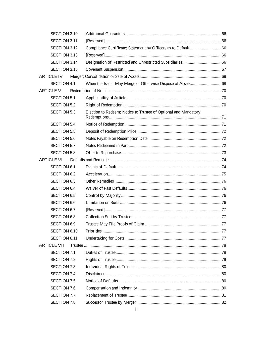 ii SECTION 3.10 Additional Guarantors ........................................................................................ 66 SECTION 3.11 [Reserved]........................................................................................................... 66 SECTION 3.12 Compliance Certificate; Statement by Officers as to Default ............................. 66 SECTION 3.13 [Reserved]........................................................................................................... 66 SECTION 3.14 Designation of Restricted and Unrestricted Subsidiaries .................................... 66 SECTION 3.15 Covenant Suspension .......................................................................................... 67 ARTICLE IV Merger; Consolidation or Sale of Assets ........................................................................... 68 SECTION 4.1 When the Issuer May Merge or Otherwise Dispose of Assets ............................ 68 ARTICLE V Redemption of Notes ........................................................................................................ 70 SECTION 5.1 Applicability of Article ....................................................................................... 70 SECTION 5.2 Right of Redemption .......................................................................................... 70 SECTION 5.3 Election to Redeem; Notice to Trustee of Optional and Mandatory Redemptions ....................................................................................................... 71 SECTION 5.4 Notice of Redemption ......................................................................................... 71 SECTION 5.5 Deposit of Redemption Price .............................................................................. 72 SECTION 5.6 Notes Payable on Redemption Date ................................................................... 72 SECTION 5.7 Notes Redeemed in Part ..................................................................................... 72 SECTION 5.8 Offer to Repurchase ............................................................................................ 73 ARTICLE VI Defaults and Remedies ..................................................................................................... 74 SECTION 6.1 Events of Default ................................................................................................ 74 SECTION 6.2 Acceleration ........................................................................................................ 75 SECTION 6.3 Other Remedies .................................................................................................. 76 SECTION 6.4 Waiver of Past Defaults ...................................................................................... 76 SECTION 6.5 Control by Majority ............................................................................................ 76 SECTION 6.6 Limitation on Suits ............................................................................................. 76 SECTION 6.7 [Reserved]........................................................................................................... 77 SECTION 6.8 Collection Suit by Trustee .................................................................................. 77 SECTION 6.9 Trustee May File Proofs of Claim ...................................................................... 77 SECTION 6.10 Priorities ............................................................................................................. 77 SECTION 6.11 Undertaking for Costs ......................................................................................... 77 ARTICLE VII Trustee .............................................................................................................................. 78 SECTION 7.1 Duties of Trustee ................................................................................................. 78 SECTION 7.2 Rights of Trustee ................................................................................................. 79 SECTION 7.3 Individual Rights of Trustee ............................................................................... 80 SECTION 7.4 Disclaimer........................................................................................................... 80 SECTION 7.5 Notice of Defaults ............................................................................................... 80 SECTION 7.6 Compensation and Indemnity ............................................................................. 80 SECTION 7.7 Replacement of Trustee ...................................................................................... 81 SECTION 7.8 Successor Trustee by Merger .............................................................................. 82