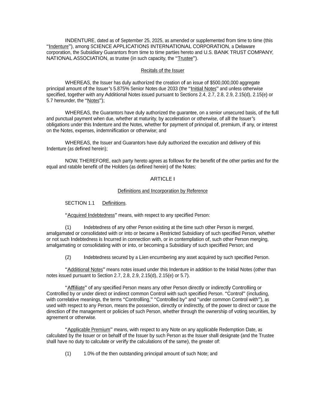 INDENTURE, dated as of September 25, 2025, as amended or supplemented from time to time (this “Indenture”), among SCIENCE APPLICATIONS INTERNATIONAL CORPORATION, a Delaware corporation, the Subsidiary Guarantors from time to time parties hereto and U.S. BANK TRUST COMPANY, NATIONAL ASSOCIATION, as trustee (in such capacity, the “Trustee”). Recitals of the Issuer WHEREAS, the Issuer has duly authorized the creation of an issue of $500,000,000 aggregate principal amount of the Issuer’s 5.875% Senior Notes due 2033 (the “Initial Notes” and unless otherwise specified, together with any Additional Notes issued pursuant to Sections 2.4, 2.7, 2.8, 2.9, 2.15(d), 2.15(e) or 5.7 hereunder, the “Notes”); WHEREAS, the Guarantors have duly authorized the guarantee, on a senior unsecured basis, of the full and punctual payment when due, whether at maturity, by acceleration or otherwise, of all the Issuer’s obligations under this Indenture and the Notes, whether for payment of principal of, premium, if any, or interest on the Notes, expenses, indemnification or otherwise; and WHEREAS, the Issuer and Guarantors have duly authorized the execution and delivery of this Indenture (as defined herein); NOW, THEREFORE, each party hereto agrees as follows for the benefit of the other parties and for the equal and ratable benefit of the Holders (as defined herein) of the Notes: ARTICLE I Definitions and Incorporation by Reference SECTION 1.1 Definitions. “Acquired Indebtedness” means, with respect to any specified Person: (1) Indebtedness of any other Person existing at the time such other Person is merged, amalgamated or consolidated with or into or became a Restricted Subsidiary of such specified Person, whether or not such Indebtedness is Incurred in connection with, or in contemplation of, such other Person merging, amalgamating or consolidating with or into, or becoming a Subsidiary of such specified Person; and (2) Indebtedness secured by a Lien encumbering any asset acquired by such specified Person. “Additional Notes” means notes issued under this Indenture in addition to the Initial Notes (other than notes issued pursuant to Section 2.7, 2.8, 2.9, 2.15(d), 2.15(e) or 5.7). “Affiliate” of any specified Person means any other Person directly or indirectly Controlling or Controlled by or under direct or indirect common Control with such specified Person. “Control” (including, with correlative meanings, the terms “Controlling,” “Controlled by” and “under common Control with”), as used with respect to any Person, means the possession, directly or indirectly, of the power to direct or cause the direction of the management or policies of such Person, whether through the ownership of voting securities, by agreement or otherwise. “Applicable Premium” means, with respect to any Note on any applicable Redemption Date, as calculated by the Issuer or on behalf of the Issuer by such Person as the Issuer shall designate (and the Trustee shall have no duty to calculate or verify the calculations of the same), the greater of: (1) 1.0% of the then outstanding principal amount of such Note; and