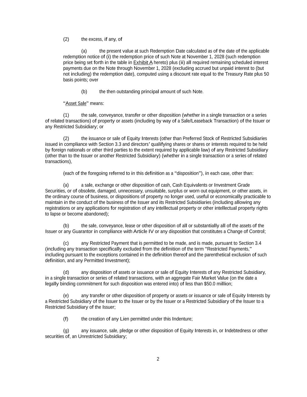 2 (2) the excess, if any, of (a) the present value at such Redemption Date calculated as of the date of the applicable redemption notice of (i) the redemption price of such Note at November 1, 2028 (such redemption price being set forth in the table in Exhibit A hereto) plus (ii) all required remaining scheduled interest payments due on the Note through November 1, 2028 (excluding accrued but unpaid interest to (but not including) the redemption date), computed using a discount rate equal to the Treasury Rate plus 50 basis points; over (b) the then outstanding principal amount of such Note. “Asset Sale” means: (1) the sale, conveyance, transfer or other disposition (whether in a single transaction or a series of related transactions) of property or assets (including by way of a Sale/Leaseback Transaction) of the Issuer or any Restricted Subsidiary; or (2) the issuance or sale of Equity Interests (other than Preferred Stock of Restricted Subsidiaries issued in compliance with Section 3.3 and directors’ qualifying shares or shares or interests required to be held by foreign nationals or other third parties to the extent required by applicable law) of any Restricted Subsidiary (other than to the Issuer or another Restricted Subsidiary) (whether in a single transaction or a series of related transactions), (each of the foregoing referred to in this definition as a “disposition”), in each case, other than: (a) a sale, exchange or other disposition of cash, Cash Equivalents or Investment Grade Securities, or of obsolete, damaged, unnecessary, unsuitable, surplus or worn out equipment, or other assets, in the ordinary course of business, or dispositions of property no longer used, useful or economically practicable to maintain in the conduct of the business of the Issuer and its Restricted Subsidiaries (including allowing any registrations or any applications for registration of any intellectual property or other intellectual property rights to lapse or become abandoned); (b) the sale, conveyance, lease or other disposition of all or substantially all of the assets of the Issuer or any Guarantor in compliance with Article IV or any disposition that constitutes a Change of Control; (c) any Restricted Payment that is permitted to be made, and is made, pursuant to Section 3.4 (including any transaction specifically excluded from the definition of the term “Restricted Payments,” including pursuant to the exceptions contained in the definition thereof and the parenthetical exclusion of such definition, and any Permitted Investment); (d) any disposition of assets or issuance or sale of Equity Interests of any Restricted Subsidiary, in a single transaction or series of related transactions, with an aggregate Fair Market Value (on the date a legally binding commitment for such disposition was entered into) of less than $50.0 million; (e) any transfer or other disposition of property or assets or issuance or sale of Equity Interests by a Restricted Subsidiary of the Issuer to the Issuer or by the Issuer or a Restricted Subsidiary of the Issuer to a Restricted Subsidiary of the Issuer; (f) the creation of any Lien permitted under this Indenture; (g) any issuance, sale, pledge or other disposition of Equity Interests in, or Indebtedness or other securities of, an Unrestricted Subsidiary;