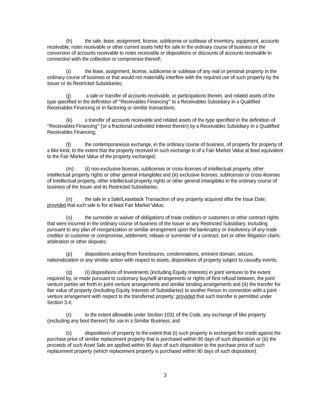3 (h) the sale, lease, assignment, license, sublicense or sublease of inventory, equipment, accounts receivable, notes receivable or other current assets held for sale in the ordinary course of business or the conversion of accounts receivable to notes receivable or dispositions or discounts of accounts receivable in connection with the collection or compromise thereof; (i) the lease, assignment, license, sublicense or sublease of any real or personal property in the ordinary course of business or that would not materially interfere with the required use of such property by the Issuer or its Restricted Subsidiaries; (j) a sale or transfer of accounts receivable, or participations therein, and related assets of the type specified in the definition of “Receivables Financing” to a Receivables Subsidiary in a Qualified Receivables Financing or in factoring or similar transactions; (k) a transfer of accounts receivable and related assets of the type specified in the definition of “Receivables Financing” (or a fractional undivided interest therein) by a Receivables Subsidiary in a Qualified Receivables Financing; (l) the contemporaneous exchange, in the ordinary course of business, of property for property of a like kind, to the extent that the property received in such exchange is of a Fair Market Value at least equivalent to the Fair Market Value of the property exchanged; (m) (i) non-exclusive licenses, sublicenses or cross-licenses of intellectual property, other intellectual property rights or other general intangibles and (ii) exclusive licenses, sublicenses or cross-licenses of intellectual property, other intellectual property rights or other general intangibles in the ordinary course of business of the Issuer and its Restricted Subsidiaries; (n) the sale in a Sale/Leaseback Transaction of any property acquired after the Issue Date; provided that such sale is for at least Fair Market Value; (o) the surrender or waiver of obligations of trade creditors or customers or other contract rights that were incurred in the ordinary course of business of the Issuer or any Restricted Subsidiary, including pursuant to any plan of reorganization or similar arrangement upon the bankruptcy or insolvency of any trade creditor or customer or compromise, settlement, release or surrender of a contract, tort or other litigation claim, arbitration or other disputes; (p) dispositions arising from foreclosures, condemnations, eminent domain, seizure, nationalization or any similar action with respect to assets, dispositions of property subject to casualty events; (q) (i) dispositions of Investments (including Equity Interests) in joint ventures to the extent required by, or made pursuant to customary buy/sell arrangements or rights of first refusal between, the joint venture parties set forth in joint venture arrangements and similar binding arrangements and (ii) the transfer for fair value of property (including Equity Interests of Subsidiaries) to another Person in connection with a joint venture arrangement with respect to the transferred property; provided that such transfer is permitted under Section 3.4; (r) to the extent allowable under Section 1031 of the Code, any exchange of like property (excluding any boot thereon) for use in a Similar Business; and (s) dispositions of property to the extent that (i) such property is exchanged for credit against the purchase price of similar replacement property that is purchased within 90 days of such disposition or (ii) the proceeds of such Asset Sale are applied within 90 days of such disposition to the purchase price of such replacement property (which replacement property is purchased within 90 days of such disposition).