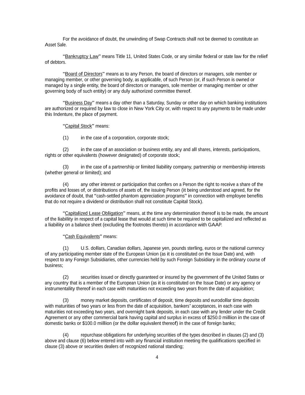 4 For the avoidance of doubt, the unwinding of Swap Contracts shall not be deemed to constitute an Asset Sale. “Bankruptcy Law” means Title 11, United States Code, or any similar federal or state law for the relief of debtors. “Board of Directors” means as to any Person, the board of directors or managers, sole member or managing member, or other governing body, as applicable, of such Person (or, if such Person is owned or managed by a single entity, the board of directors or managers, sole member or managing member or other governing body of such entity) or any duly authorized committee thereof. “Business Day” means a day other than a Saturday, Sunday or other day on which banking institutions are authorized or required by law to close in New York City or, with respect to any payments to be made under this Indenture, the place of payment. “Capital Stock” means: (1) in the case of a corporation, corporate stock; (2) in the case of an association or business entity, any and all shares, interests, participations, rights or other equivalents (however designated) of corporate stock; (3) in the case of a partnership or limited liability company, partnership or membership interests (whether general or limited); and (4) any other interest or participation that confers on a Person the right to receive a share of the profits and losses of, or distributions of assets of, the issuing Person (it being understood and agreed, for the avoidance of doubt, that “cash-settled phantom appreciation programs” in connection with employee benefits that do not require a dividend or distribution shall not constitute Capital Stock). “Capitalized Lease Obligation” means, at the time any determination thereof is to be made, the amount of the liability in respect of a capital lease that would at such time be required to be capitalized and reflected as a liability on a balance sheet (excluding the footnotes thereto) in accordance with GAAP. “Cash Equivalents” means: (1) U.S. dollars, Canadian dollars, Japanese yen, pounds sterling, euros or the national currency of any participating member state of the European Union (as it is constituted on the Issue Date) and, with respect to any Foreign Subsidiaries, other currencies held by such Foreign Subsidiary in the ordinary course of business; (2) securities issued or directly guaranteed or insured by the government of the United States or any country that is a member of the European Union (as it is constituted on the Issue Date) or any agency or instrumentality thereof in each case with maturities not exceeding two years from the date of acquisition; (3) money market deposits, certificates of deposit, time deposits and eurodollar time deposits with maturities of two years or less from the date of acquisition, bankers’ acceptances, in each case with maturities not exceeding two years, and overnight bank deposits, in each case with any lender under the Credit Agreement or any other commercial bank having capital and surplus in excess of $250.0 million in the case of domestic banks or $100.0 million (or the dollar equivalent thereof) in the case of foreign banks; (4) repurchase obligations for underlying securities of the types described in clauses (2) and (3) above and clause (6) below entered into with any financial institution meeting the qualifications specified in clause (3) above or securities dealers of recognized national standing;