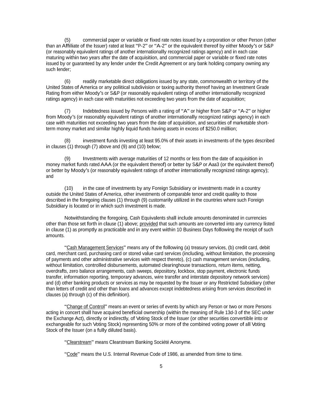 5 (5) commercial paper or variable or fixed rate notes issued by a corporation or other Person (other than an Affiliate of the Issuer) rated at least “P-2” or “A-2” or the equivalent thereof by either Moody’s or S&P (or reasonably equivalent ratings of another internationally recognized ratings agency) and in each case maturing within two years after the date of acquisition, and commercial paper or variable or fixed rate notes issued by or guaranteed by any lender under the Credit Agreement or any bank holding company owning any such lender; (6) readily marketable direct obligations issued by any state, commonwealth or territory of the United States of America or any political subdivision or taxing authority thereof having an Investment Grade Rating from either Moody’s or S&P (or reasonably equivalent ratings of another internationally recognized ratings agency) in each case with maturities not exceeding two years from the date of acquisition; (7) Indebtedness issued by Persons with a rating of “A” or higher from S&P or “A-2” or higher from Moody’s (or reasonably equivalent ratings of another internationally recognized ratings agency) in each case with maturities not exceeding two years from the date of acquisition, and securities of marketable short- term money market and similar highly liquid funds having assets in excess of $250.0 million; (8) investment funds investing at least 95.0% of their assets in investments of the types described in clauses (1) through (7) above and (9) and (10) below; (9) Investments with average maturities of 12 months or less from the date of acquisition in money market funds rated AAA (or the equivalent thereof) or better by S&P or Aaa3 (or the equivalent thereof) or better by Moody’s (or reasonably equivalent ratings of another internationally recognized ratings agency); and (10) in the case of investments by any Foreign Subsidiary or investments made in a country outside the United States of America, other investments of comparable tenor and credit quality to those described in the foregoing clauses (1) through (9) customarily utilized in the countries where such Foreign Subsidiary is located or in which such investment is made. Notwithstanding the foregoing, Cash Equivalents shall include amounts denominated in currencies other than those set forth in clause (1) above; provided that such amounts are converted into any currency listed in clause (1) as promptly as practicable and in any event within 10 Business Days following the receipt of such amounts. “Cash Management Services” means any of the following (a) treasury services, (b) credit card, debit card, merchant card, purchasing card or stored value card services (including, without limitation, the processing of payments and other administrative services with respect thereto), (c) cash management services (including, without limitation, controlled disbursements, automated clearinghouse transactions, return items, netting, overdrafts, zero balance arrangements, cash sweeps, depository, lockbox, stop payment, electronic funds transfer, information reporting, temporary advances, wire transfer and interstate depository network services) and (d) other banking products or services as may be requested by the Issuer or any Restricted Subsidiary (other than letters of credit and other than loans and advances except indebtedness arising from services described in clauses (a) through (c) of this definition). “Change of Control” means an event or series of events by which any Person or two or more Persons acting in concert shall have acquired beneficial ownership (within the meaning of Rule 13d-3 of the SEC under the Exchange Act), directly or indirectly, of Voting Stock of the Issuer (or other securities convertible into or exchangeable for such Voting Stock) representing 50% or more of the combined voting power of all Voting Stock of the Issuer (on a fully diluted basis). “Clearstream” means Clearstream Banking Société Anonyme. “Code” means the U.S. Internal Revenue Code of 1986, as amended from time to time.
