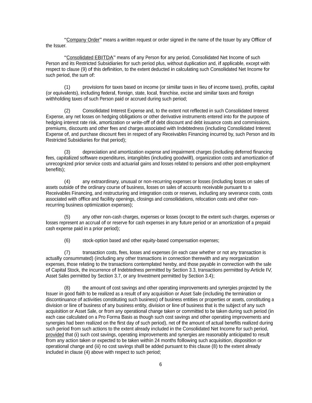 6 “Company Order” means a written request or order signed in the name of the Issuer by any Officer of the Issuer. “Consolidated EBITDA” means of any Person for any period, Consolidated Net Income of such Person and its Restricted Subsidiaries for such period plus, without duplication and, if applicable, except with respect to clause (9) of this definition, to the extent deducted in calculating such Consolidated Net Income for such period, the sum of: (1) provisions for taxes based on income (or similar taxes in lieu of income taxes), profits, capital (or equivalents), including federal, foreign, state, local, franchise, excise and similar taxes and foreign withholding taxes of such Person paid or accrued during such period; (2) Consolidated Interest Expense and, to the extent not reflected in such Consolidated Interest Expense, any net losses on hedging obligations or other derivative instruments entered into for the purpose of hedging interest rate risk, amortization or write-off of debt discount and debt issuance costs and commissions, premiums, discounts and other fees and charges associated with Indebtedness (including Consolidated Interest Expense of, and purchase discount fees in respect of any Receivables Financing incurred by, such Person and its Restricted Subsidiaries for that period); (3) depreciation and amortization expense and impairment charges (including deferred financing fees, capitalized software expenditures, intangibles (including goodwill), organization costs and amortization of unrecognized prior service costs and actuarial gains and losses related to pensions and other post-employment benefits); (4) any extraordinary, unusual or non-recurring expenses or losses (including losses on sales of assets outside of the ordinary course of business, losses on sales of accounts receivable pursuant to a Receivables Financing, and restructuring and integration costs or reserves, including any severance costs, costs associated with office and facility openings, closings and consolidations, relocation costs and other non- recurring business optimization expenses); (5) any other non-cash charges, expenses or losses (except to the extent such charges, expenses or losses represent an accrual of or reserve for cash expenses in any future period or an amortization of a prepaid cash expense paid in a prior period); (6) stock-option based and other equity-based compensation expenses; (7) transaction costs, fees, losses and expenses (in each case whether or not any transaction is actually consummated) (including any other transactions in connection therewith and any reorganization expenses, those relating to the transactions contemplated hereby, and those payable in connection with the sale of Capital Stock, the incurrence of Indebtedness permitted by Section 3.3, transactions permitted by Article IV, Asset Sales permitted by Section 3.7, or any Investment permitted by Section 3.4); (8) the amount of cost savings and other operating improvements and synergies projected by the Issuer in good faith to be realized as a result of any acquisition or Asset Sale (including the termination or discontinuance of activities constituting such business) of business entities or properties or assets, constituting a division or line of business of any business entity, division or line of business that is the subject of any such acquisition or Asset Sale, or from any operational change taken or committed to be taken during such period (in each case calculated on a Pro Forma Basis as though such cost savings and other operating improvements and synergies had been realized on the first day of such period), net of the amount of actual benefits realized during such period from such actions to the extent already included in the Consolidated Net Income for such period, provided that (i) such cost savings, operating improvements and synergies are reasonably anticipated to result from any action taken or expected to be taken within 24 months following such acquisition, disposition or operational change and (ii) no cost savings shall be added pursuant to this clause (8) to the extent already included in clause (4) above with respect to such period;