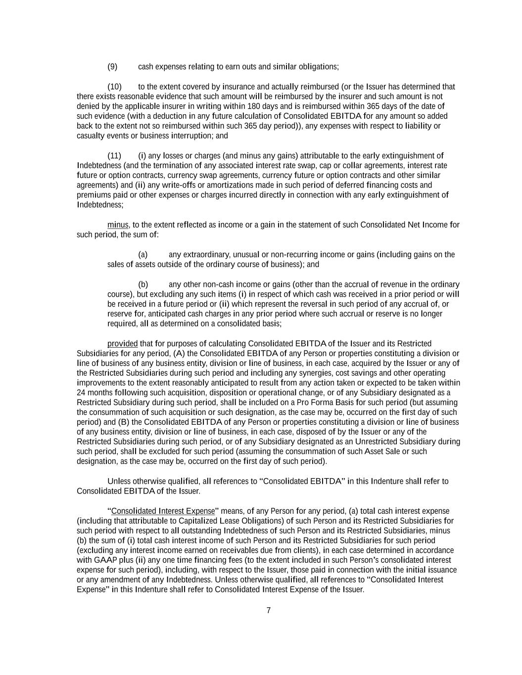 7 (9) cash expenses relating to earn outs and similar obligations; (10) to the extent covered by insurance and actually reimbursed (or the Issuer has determined that there exists reasonable evidence that such amount will be reimbursed by the insurer and such amount is not denied by the applicable insurer in writing within 180 days and is reimbursed within 365 days of the date of such evidence (with a deduction in any future calculation of Consolidated EBITDA for any amount so added back to the extent not so reimbursed within such 365 day period)), any expenses with respect to liability or casualty events or business interruption; and (11) (i) any losses or charges (and minus any gains) attributable to the early extinguishment of Indebtedness (and the termination of any associated interest rate swap, cap or collar agreements, interest rate future or option contracts, currency swap agreements, currency future or option contracts and other similar agreements) and (ii) any write-offs or amortizations made in such period of deferred financing costs and premiums paid or other expenses or charges incurred directly in connection with any early extinguishment of Indebtedness; minus, to the extent reflected as income or a gain in the statement of such Consolidated Net Income for such period, the sum of: (a) any extraordinary, unusual or non-recurring income or gains (including gains on the sales of assets outside of the ordinary course of business); and (b) any other non-cash income or gains (other than the accrual of revenue in the ordinary course), but excluding any such items (i) in respect of which cash was received in a prior period or will be received in a future period or (ii) which represent the reversal in such period of any accrual of, or reserve for, anticipated cash charges in any prior period where such accrual or reserve is no longer required, all as determined on a consolidated basis; provided that for purposes of calculating Consolidated EBITDA of the Issuer and its Restricted Subsidiaries for any period, (A) the Consolidated EBITDA of any Person or properties constituting a division or line of business of any business entity, division or line of business, in each case, acquired by the Issuer or any of the Restricted Subsidiaries during such period and including any synergies, cost savings and other operating improvements to the extent reasonably anticipated to result from any action taken or expected to be taken within 24 months following such acquisition, disposition or operational change, or of any Subsidiary designated as a Restricted Subsidiary during such period, shall be included on a Pro Forma Basis for such period (but assuming the consummation of such acquisition or such designation, as the case may be, occurred on the first day of such period) and (B) the Consolidated EBITDA of any Person or properties constituting a division or line of business of any business entity, division or line of business, in each case, disposed of by the Issuer or any of the Restricted Subsidiaries during such period, or of any Subsidiary designated as an Unrestricted Subsidiary during such period, shall be excluded for such period (assuming the consummation of such Asset Sale or such designation, as the case may be, occurred on the first day of such period). Unless otherwise qualified, all references to “Consolidated EBITDA” in this Indenture shall refer to Consolidated EBITDA of the Issuer. “Consolidated Interest Expense” means, of any Person for any period, (a) total cash interest expense (including that attributable to Capitalized Lease Obligations) of such Person and its Restricted Subsidiaries for such period with respect to all outstanding Indebtedness of such Person and its Restricted Subsidiaries, minus (b) the sum of (i) total cash interest income of such Person and its Restricted Subsidiaries for such period (excluding any interest income earned on receivables due from clients), in each case determined in accordance with GAAP plus (ii) any one time financing fees (to the extent included in such Person’s consolidated interest expense for such period), including, with respect to the Issuer, those paid in connection with the initial issuance or any amendment of any Indebtedness. Unless otherwise qualified, all references to “Consolidated Interest Expense” in this Indenture shall refer to Consolidated Interest Expense of the Issuer.