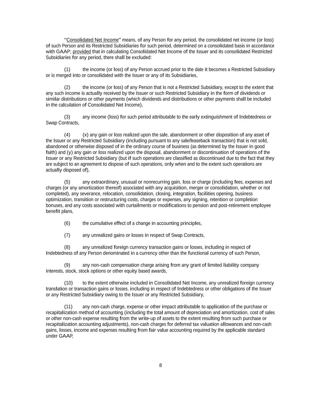 8 “Consolidated Net Income” means, of any Person for any period, the consolidated net income (or loss) of such Person and its Restricted Subsidiaries for such period, determined on a consolidated basis in accordance with GAAP; provided that in calculating Consolidated Net Income of the Issuer and its consolidated Restricted Subsidiaries for any period, there shall be excluded: (1) the income (or loss) of any Person accrued prior to the date it becomes a Restricted Subsidiary or is merged into or consolidated with the Issuer or any of its Subsidiaries, (2) the income (or loss) of any Person that is not a Restricted Subsidiary, except to the extent that any such income is actually received by the Issuer or such Restricted Subsidiary in the form of dividends or similar distributions or other payments (which dividends and distributions or other payments shall be included in the calculation of Consolidated Net Income), (3) any income (loss) for such period attributable to the early extinguishment of Indebtedness or Swap Contracts, (4) (x) any gain or loss realized upon the sale, abandonment or other disposition of any asset of the Issuer or any Restricted Subsidiary (including pursuant to any sale/leaseback transaction) that is not sold, abandoned or otherwise disposed of in the ordinary course of business (as determined by the Issuer in good faith) and (y) any gain or loss realized upon the disposal, abandonment or discontinuation of operations of the Issuer or any Restricted Subsidiary (but if such operations are classified as discontinued due to the fact that they are subject to an agreement to dispose of such operations, only when and to the extent such operations are actually disposed of), (5) any extraordinary, unusual or nonrecurring gain, loss or charge (including fees, expenses and charges (or any amortization thereof) associated with any acquisition, merger or consolidation, whether or not completed), any severance, relocation, consolidation, closing, integration, facilities opening, business optimization, transition or restructuring costs, charges or expenses, any signing, retention or completion bonuses, and any costs associated with curtailments or modifications to pension and post-retirement employee benefit plans, (6) the cumulative effect of a change in accounting principles, (7) any unrealized gains or losses in respect of Swap Contracts, (8) any unrealized foreign currency transaction gains or losses, including in respect of Indebtedness of any Person denominated in a currency other than the functional currency of such Person, (9) any non-cash compensation charge arising from any grant of limited liability company interests, stock, stock options or other equity based awards, (10) to the extent otherwise included in Consolidated Net Income, any unrealized foreign currency translation or transaction gains or losses, including in respect of Indebtedness or other obligations of the Issuer or any Restricted Subsidiary owing to the Issuer or any Restricted Subsidiary, (11) any non-cash charge, expense or other impact attributable to application of the purchase or recapitalization method of accounting (including the total amount of depreciation and amortization, cost of sales or other non-cash expense resulting from the write-up of assets to the extent resulting from such purchase or recapitalization accounting adjustments), non-cash charges for deferred tax valuation allowances and non-cash gains, losses, income and expenses resulting from fair value accounting required by the applicable standard under GAAP,