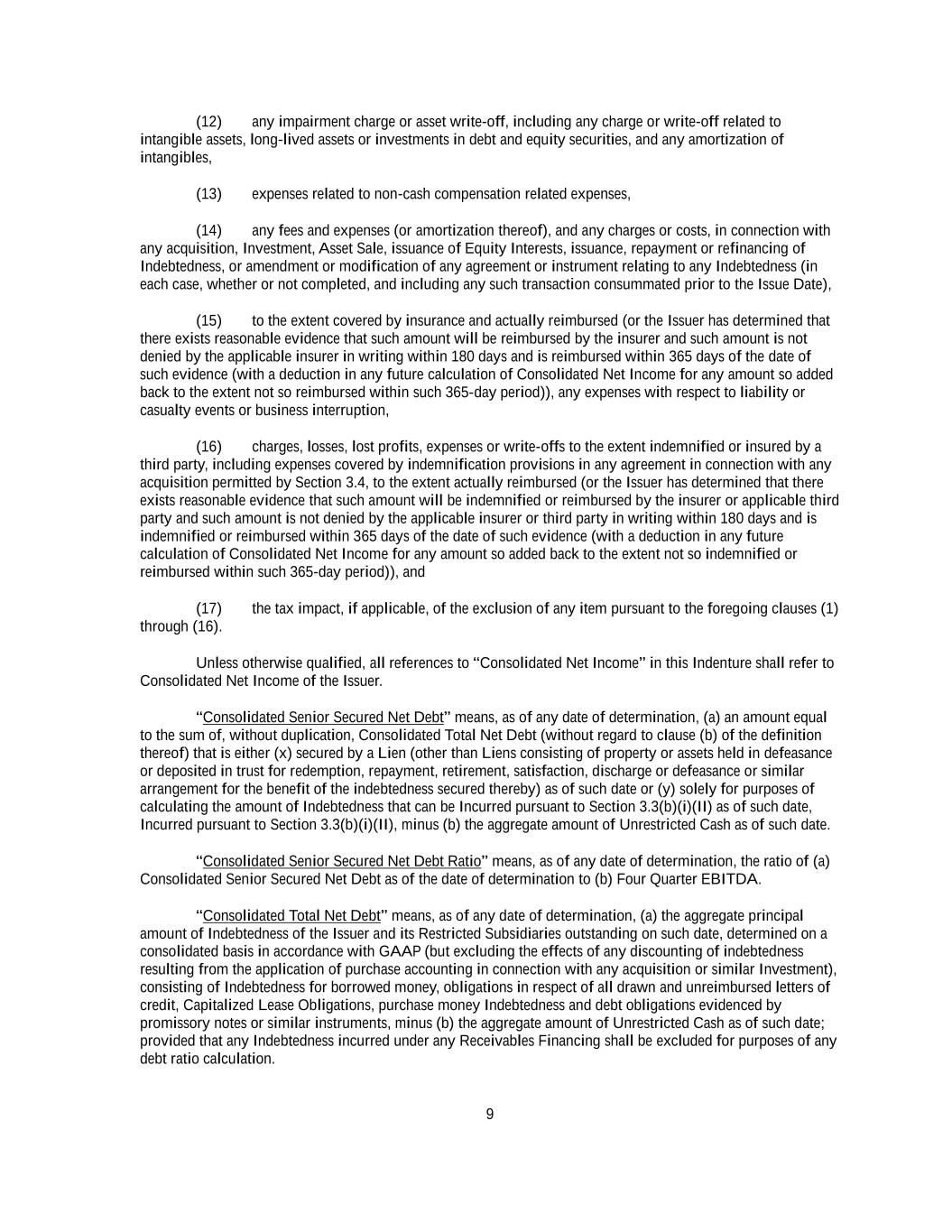 9 (12) any impairment charge or asset write-off, including any charge or write-off related to intangible assets, long-lived assets or investments in debt and equity securities, and any amortization of intangibles, (13) expenses related to non-cash compensation related expenses, (14) any fees and expenses (or amortization thereof), and any charges or costs, in connection with any acquisition, Investment, Asset Sale, issuance of Equity Interests, issuance, repayment or refinancing of Indebtedness, or amendment or modification of any agreement or instrument relating to any Indebtedness (in each case, whether or not completed, and including any such transaction consummated prior to the Issue Date), (15) to the extent covered by insurance and actually reimbursed (or the Issuer has determined that there exists reasonable evidence that such amount will be reimbursed by the insurer and such amount is not denied by the applicable insurer in writing within 180 days and is reimbursed within 365 days of the date of such evidence (with a deduction in any future calculation of Consolidated Net Income for any amount so added back to the extent not so reimbursed within such 365-day period)), any expenses with respect to liability or casualty events or business interruption, (16) charges, losses, lost profits, expenses or write-offs to the extent indemnified or insured by a third party, including expenses covered by indemnification provisions in any agreement in connection with any acquisition permitted by Section 3.4, to the extent actually reimbursed (or the Issuer has determined that there exists reasonable evidence that such amount will be indemnified or reimbursed by the insurer or applicable third party and such amount is not denied by the applicable insurer or third party in writing within 180 days and is indemnified or reimbursed within 365 days of the date of such evidence (with a deduction in any future calculation of Consolidated Net Income for any amount so added back to the extent not so indemnified or reimbursed within such 365-day period)), and (17) the tax impact, if applicable, of the exclusion of any item pursuant to the foregoing clauses (1) through (16). Unless otherwise qualified, all references to “Consolidated Net Income” in this Indenture shall refer to Consolidated Net Income of the Issuer. “Consolidated Senior Secured Net Debt” means, as of any date of determination, (a) an amount equal to the sum of, without duplication, Consolidated Total Net Debt (without regard to clause (b) of the definition thereof) that is either (x) secured by a Lien (other than Liens consisting of property or assets held in defeasance or deposited in trust for redemption, repayment, retirement, satisfaction, discharge or defeasance or similar arrangement for the benefit of the indebtedness secured thereby) as of such date or (y) solely for purposes of calculating the amount of Indebtedness that can be Incurred pursuant to Section 3.3(b)(i)(II) as of such date, Incurred pursuant to Section 3.3(b)(i)(II), minus (b) the aggregate amount of Unrestricted Cash as of such date. “Consolidated Senior Secured Net Debt Ratio” means, as of any date of determination, the ratio of (a) Consolidated Senior Secured Net Debt as of the date of determination to (b) Four Quarter EBITDA. “Consolidated Total Net Debt” means, as of any date of determination, (a) the aggregate principal amount of Indebtedness of the Issuer and its Restricted Subsidiaries outstanding on such date, determined on a consolidated basis in accordance with GAAP (but excluding the effects of any discounting of indebtedness resulting from the application of purchase accounting in connection with any acquisition or similar Investment), consisting of Indebtedness for borrowed money, obligations in respect of all drawn and unreimbursed letters of credit, Capitalized Lease Obligations, purchase money Indebtedness and debt obligations evidenced by promissory notes or similar instruments, minus (b) the aggregate amount of Unrestricted Cash as of such date; provided that any Indebtedness incurred under any Receivables Financing shall be excluded for purposes of any debt ratio calculation.
