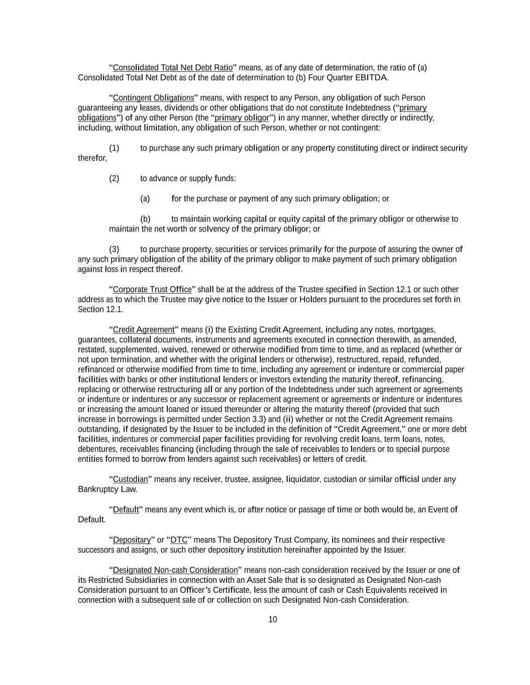 10 “Consolidated Total Net Debt Ratio” means, as of any date of determination, the ratio of (a) Consolidated Total Net Debt as of the date of determination to (b) Four Quarter EBITDA. “Contingent Obligations” means, with respect to any Person, any obligation of such Person guaranteeing any leases, dividends or other obligations that do not constitute Indebtedness (“primary obligations”) of any other Person (the “primary obligor”) in any manner, whether directly or indirectly, including, without limitation, any obligation of such Person, whether or not contingent: (1) to purchase any such primary obligation or any property constituting direct or indirect security therefor, (2) to advance or supply funds: (a) for the purchase or payment of any such primary obligation; or (b) to maintain working capital or equity capital of the primary obligor or otherwise to maintain the net worth or solvency of the primary obligor; or (3) to purchase property, securities or services primarily for the purpose of assuring the owner of any such primary obligation of the ability of the primary obligor to make payment of such primary obligation against loss in respect thereof. “Corporate Trust Office” shall be at the address of the Trustee specified in Section 12.1 or such other address as to which the Trustee may give notice to the Issuer or Holders pursuant to the procedures set forth in Section 12.1. “Credit Agreement” means (i) the Existing Credit Agreement, including any notes, mortgages, guarantees, collateral documents, instruments and agreements executed in connection therewith, as amended, restated, supplemented, waived, renewed or otherwise modified from time to time, and as replaced (whether or not upon termination, and whether with the original lenders or otherwise), restructured, repaid, refunded, refinanced or otherwise modified from time to time, including any agreement or indenture or commercial paper facilities with banks or other institutional lenders or investors extending the maturity thereof, refinancing, replacing or otherwise restructuring all or any portion of the Indebtedness under such agreement or agreements or indenture or indentures or any successor or replacement agreement or agreements or indenture or indentures or increasing the amount loaned or issued thereunder or altering the maturity thereof (provided that such increase in borrowings is permitted under Section 3.3) and (ii) whether or not the Credit Agreement remains outstanding, if designated by the Issuer to be included in the definition of “Credit Agreement,” one or more debt facilities, indentures or commercial paper facilities providing for revolving credit loans, term loans, notes, debentures, receivables financing (including through the sale of receivables to lenders or to special purpose entities formed to borrow from lenders against such receivables) or letters of credit. “Custodian” means any receiver, trustee, assignee, liquidator, custodian or similar official under any Bankruptcy Law. “Default” means any event which is, or after notice or passage of time or both would be, an Event of Default. “Depositary” or “DTC” means The Depository Trust Company, its nominees and their respective successors and assigns, or such other depository institution hereinafter appointed by the Issuer. “Designated Non-cash Consideration” means non-cash consideration received by the Issuer or one of its Restricted Subsidiaries in connection with an Asset Sale that is so designated as Designated Non-cash Consideration pursuant to an Officer’s Certificate, less the amount of cash or Cash Equivalents received in connection with a subsequent sale of or collection on such Designated Non-cash Consideration.