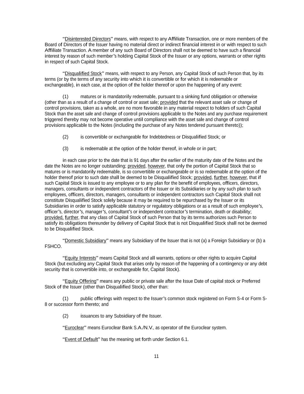 11 “Disinterested Directors” means, with respect to any Affiliate Transaction, one or more members of the Board of Directors of the Issuer having no material direct or indirect financial interest in or with respect to such Affiliate Transaction. A member of any such Board of Directors shall not be deemed to have such a financial interest by reason of such member’s holding Capital Stock of the Issuer or any options, warrants or other rights in respect of such Capital Stock. “Disqualified Stock” means, with respect to any Person, any Capital Stock of such Person that, by its terms (or by the terms of any security into which it is convertible or for which it is redeemable or exchangeable), in each case, at the option of the holder thereof or upon the happening of any event: (1) matures or is mandatorily redeemable, pursuant to a sinking fund obligation or otherwise (other than as a result of a change of control or asset sale; provided that the relevant asset sale or change of control provisions, taken as a whole, are no more favorable in any material respect to holders of such Capital Stock than the asset sale and change of control provisions applicable to the Notes and any purchase requirement triggered thereby may not become operative until compliance with the asset sale and change of control provisions applicable to the Notes (including the purchase of any Notes tendered pursuant thereto)); (2) is convertible or exchangeable for Indebtedness or Disqualified Stock; or (3) is redeemable at the option of the holder thereof, in whole or in part; in each case prior to the date that is 91 days after the earlier of the maturity date of the Notes and the date the Notes are no longer outstanding; provided, however, that only the portion of Capital Stock that so matures or is mandatorily redeemable, is so convertible or exchangeable or is so redeemable at the option of the holder thereof prior to such date shall be deemed to be Disqualified Stock; provided, further, however, that if such Capital Stock is issued to any employee or to any plan for the benefit of employees, officers, directors, managers, consultants or independent contractors of the Issuer or its Subsidiaries or by any such plan to such employees, officers, directors, managers, consultants or independent contractors such Capital Stock shall not constitute Disqualified Stock solely because it may be required to be repurchased by the Issuer or its Subsidiaries in order to satisfy applicable statutory or regulatory obligations or as a result of such employee’s, officer’s, director’s, manager’s, consultant’s or independent contractor’s termination, death or disability; provided, further, that any class of Capital Stock of such Person that by its terms authorizes such Person to satisfy its obligations thereunder by delivery of Capital Stock that is not Disqualified Stock shall not be deemed to be Disqualified Stock. “Domestic Subsidiary” means any Subsidiary of the Issuer that is not (a) a Foreign Subsidiary or (b) a FSHCO. “Equity Interests” means Capital Stock and all warrants, options or other rights to acquire Capital Stock (but excluding any Capital Stock that arises only by reason of the happening of a contingency or any debt security that is convertible into, or exchangeable for, Capital Stock). “Equity Offering” means any public or private sale after the Issue Date of capital stock or Preferred Stock of the Issuer (other than Disqualified Stock), other than: (1) public offerings with respect to the Issuer’s common stock registered on Form S-4 or Form S- 8 or successor form thereto; and (2) issuances to any Subsidiary of the Issuer. “Euroclear” means Euroclear Bank S.A./N.V., as operator of the Euroclear system. “Event of Default” has the meaning set forth under Section 6.1.