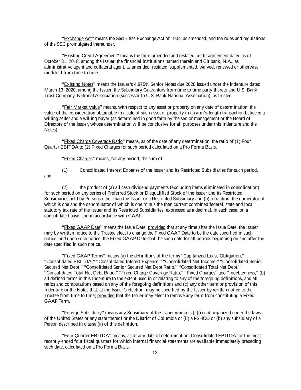 12 “Exchange Act” means the Securities Exchange Act of 1934, as amended, and the rules and regulations of the SEC promulgated thereunder. “Existing Credit Agreement” means the third amended and restated credit agreement dated as of October 31, 2018, among the Issuer, the financial institutions named therein and Citibank, N.A., as administrative agent and collateral agent, as amended, restated, supplemented, waived, renewed or otherwise modified from time to time. “Existing Notes” means the Issuer’s 4.875% Senior Notes due 2028 issued under the indenture dated March 13, 2020, among the Issuer, the Subsidiary Guarantors from time to time party thereto and U.S. Bank Trust Company, National Association (successor to U.S. Bank National Association), as trustee. “Fair Market Value” means, with respect to any asset or property on any date of determination, the value of the consideration obtainable in a sale of such asset or property in an arm’s-length transaction between a willing seller and a willing buyer (as determined in good faith by the senior management or the Board of Directors of the Issuer, whose determination will be conclusive for all purposes under this Indenture and the Notes). “Fixed Charge Coverage Ratio” means, as of the date of any determination, the ratio of (1) Four Quarter EBITDA to (2) Fixed Charges for such period calculated on a Pro Forma Basis. “Fixed Charges” means, for any period, the sum of: (1) Consolidated Interest Expense of the Issuer and its Restricted Subsidiaries for such period, and (2) the product of (a) all cash dividend payments (excluding items eliminated in consolidation) for such period on any series of Preferred Stock or Disqualified Stock of the Issuer and its Restricted Subsidiaries held by Persons other than the Issuer or a Restricted Subsidiary and (b) a fraction, the numerator of which is one and the denominator of which is one minus the then current combined federal, state and local statutory tax rate of the Issuer and its Restricted Subsidiaries, expressed as a decimal, in each case, on a consolidated basis and in accordance with GAAP. “Fixed GAAP Date” means the Issue Date; provided that at any time after the Issue Date, the Issuer may by written notice to the Trustee elect to change the Fixed GAAP Date to be the date specified in such notice, and upon such notice, the Fixed GAAP Date shall be such date for all periods beginning on and after the date specified in such notice. “Fixed GAAP Terms” means (a) the definitions of the terms “Capitalized Lease Obligation,” “Consolidated EBITDA,” “Consolidated Interest Expense,” “Consolidated Net Income,” “Consolidated Senior Secured Net Debt,” “Consolidated Senior Secured Net Debt Ratio,” “Consolidated Total Net Debt,” “Consolidated Total Net Debt Ratio,” “Fixed Charge Coverage Ratio,” “Fixed Charges” and “Indebtedness,” (b) all defined terms in this Indenture to the extent used in or relating to any of the foregoing definitions, and all ratios and computations based on any of the foregoing definitions and (c) any other term or provision of this Indenture or the Notes that, at the Issuer’s election, may be specified by the Issuer by written notice to the Trustee from time to time; provided that the Issuer may elect to remove any term from constituting a Fixed GAAP Term. “Foreign Subsidiary” means any Subsidiary of the Issuer which is (a)(i) not organized under the laws of the United States or any state thereof or the District of Columbia or (ii) a FSHCO or (b) any subsidiary of a Person described in clause (a) of this definition. “Four Quarter EBITDA” means, as of any date of determination, Consolidated EBITDA for the most recently ended four fiscal quarters for which internal financial statements are available immediately preceding such date, calculated on a Pro Forma Basis.
