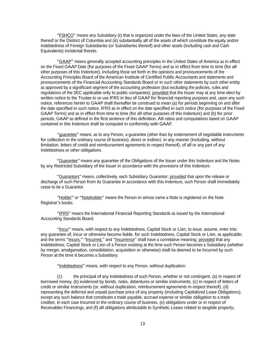 13 “FSHCO” means any Subsidiary (i) that is organized under the laws of the United States, any state thereof or the District of Columbia and (ii) substantially all of the assets of which constitute the equity and/or indebtedness of Foreign Subsidiaries (or Subsidiaries thereof) and other assets (including cash and Cash Equivalents) incidental thereto. “GAAP” means generally accepted accounting principles in the United States of America as in effect on the Fixed GAAP Date (for purposes of the Fixed GAAP Terms) and as in effect from time to time (for all other purposes of this Indenture), including those set forth in the opinions and pronouncements of the Accounting Principles Board of the American Institute of Certified Public Accountants and statements and pronouncements of the Financial Accounting Standards Board or in such other statements by such other entity as approved by a significant segment of the accounting profession (but excluding the policies, rules and regulations of the SEC applicable only to public companies); provided that the Issuer may at any time elect by written notice to the Trustee to so use IFRS in lieu of GAAP for financial reporting purposes and, upon any such notice, references herein to GAAP shall thereafter be construed to mean (a) for periods beginning on and after the date specified in such notice, IFRS as in effect on the date specified in such notice (for purposes of the Fixed GAAP Terms) and as in effect from time to time (for all other purposes of this Indenture) and (b) for prior periods, GAAP as defined in the first sentence of this definition. All ratios and computations based on GAAP contained in this Indenture shall be computed in conformity with GAAP. “guarantee” means, as to any Person, a guarantee (other than by endorsement of negotiable instruments for collection in the ordinary course of business), direct or indirect, in any manner (including, without limitation, letters of credit and reimbursement agreements in respect thereof), of all or any part of any Indebtedness or other obligations. “Guarantee” means any guarantee of the Obligations of the Issuer under this Indenture and the Notes by any Restricted Subsidiary of the Issuer in accordance with the provisions of this Indenture. “Guarantors” means, collectively, each Subsidiary Guarantor; provided that upon the release or discharge of such Person from its Guarantee in accordance with this Indenture, such Person shall immediately cease to be a Guarantor. “Holder” or “Noteholder” means the Person in whose name a Note is registered on the Note Registrar’s books. “IFRS” means the International Financial Reporting Standards as issued by the International Accounting Standards Board. “Incur” means, with respect to any Indebtedness, Capital Stock or Lien, to issue, assume, enter into any guarantee of, incur or otherwise become liable, for such Indebtedness, Capital Stock or Lien, as applicable; and the terms “Incurs,” “Incurred,” and “Incurrence” shall have a correlative meaning; provided that any Indebtedness, Capital Stock or Lien of a Person existing at the time such Person becomes a Subsidiary (whether by merger, amalgamation, consolidation, acquisition or otherwise) shall be deemed to be Incurred by such Person at the time it becomes a Subsidiary. “Indebtedness” means, with respect to any Person, without duplication: (1) the principal of any indebtedness of such Person, whether or not contingent, (a) in respect of borrowed money, (b) evidenced by bonds, notes, debentures or similar instruments, (c) in respect of letters of credit or similar instruments (or, without duplication, reimbursement agreements in respect thereof), (d) representing the deferred and unpaid purchase price of any property (including Capitalized Lease Obligations), except any such balance that constitutes a trade payable, accrued expense or similar obligation to a trade creditor, in each case Incurred in the ordinary course of business, (e) obligations under or in respect of Receivables Financings, and (f) all obligations attributable to Synthetic Leases related to tangible property;