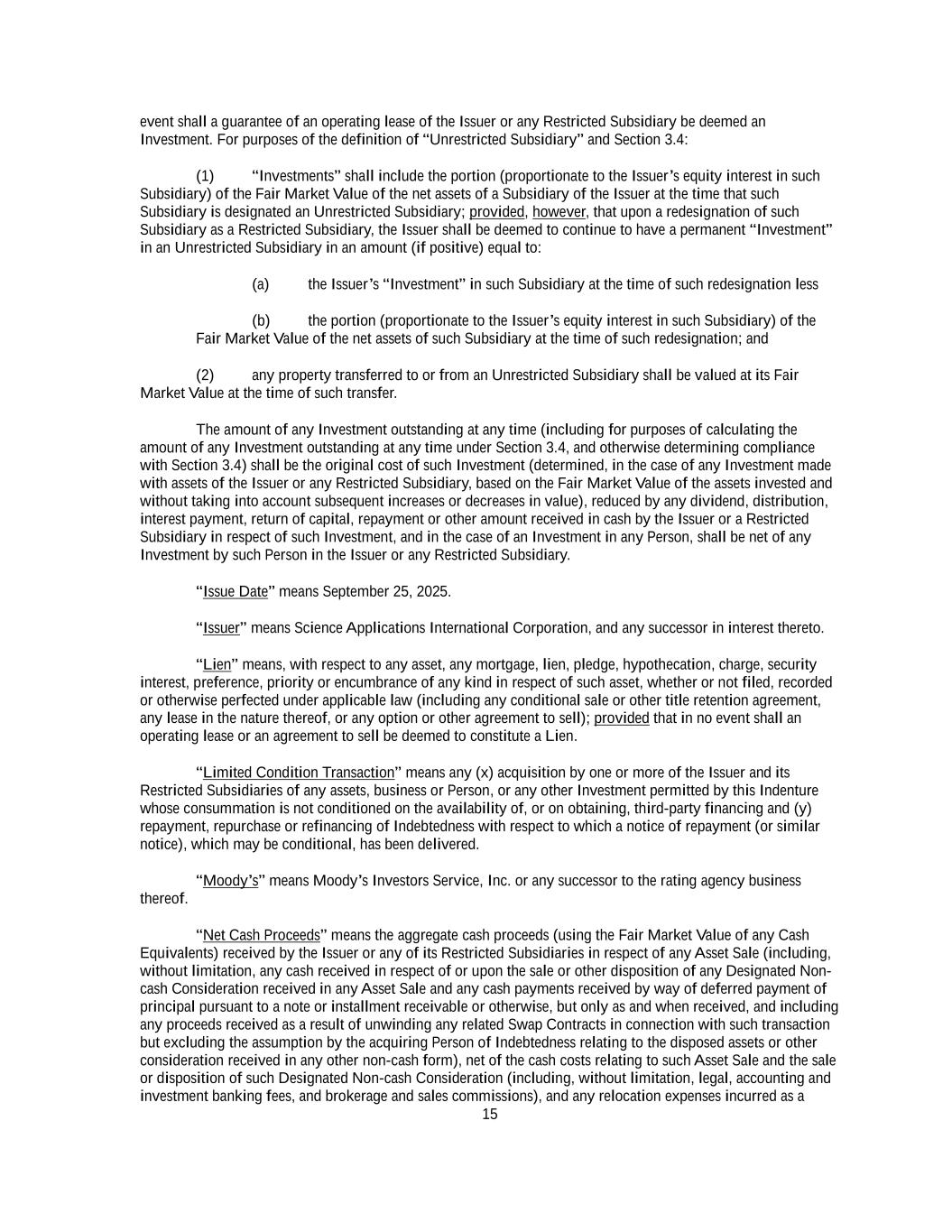 15 event shall a guarantee of an operating lease of the Issuer or any Restricted Subsidiary be deemed an Investment. For purposes of the definition of “Unrestricted Subsidiary” and Section 3.4: (1) “Investments” shall include the portion (proportionate to the Issuer’s equity interest in such Subsidiary) of the Fair Market Value of the net assets of a Subsidiary of the Issuer at the time that such Subsidiary is designated an Unrestricted Subsidiary; provided, however, that upon a redesignation of such Subsidiary as a Restricted Subsidiary, the Issuer shall be deemed to continue to have a permanent “Investment” in an Unrestricted Subsidiary in an amount (if positive) equal to: (a) the Issuer’s “Investment” in such Subsidiary at the time of such redesignation less (b) the portion (proportionate to the Issuer’s equity interest in such Subsidiary) of the Fair Market Value of the net assets of such Subsidiary at the time of such redesignation; and (2) any property transferred to or from an Unrestricted Subsidiary shall be valued at its Fair Market Value at the time of such transfer. The amount of any Investment outstanding at any time (including for purposes of calculating the amount of any Investment outstanding at any time under Section 3.4, and otherwise determining compliance with Section 3.4) shall be the original cost of such Investment (determined, in the case of any Investment made with assets of the Issuer or any Restricted Subsidiary, based on the Fair Market Value of the assets invested and without taking into account subsequent increases or decreases in value), reduced by any dividend, distribution, interest payment, return of capital, repayment or other amount received in cash by the Issuer or a Restricted Subsidiary in respect of such Investment, and in the case of an Investment in any Person, shall be net of any Investment by such Person in the Issuer or any Restricted Subsidiary. “Issue Date” means September 25, 2025. “Issuer” means Science Applications International Corporation, and any successor in interest thereto. “Lien” means, with respect to any asset, any mortgage, lien, pledge, hypothecation, charge, security interest, preference, priority or encumbrance of any kind in respect of such asset, whether or not filed, recorded or otherwise perfected under applicable law (including any conditional sale or other title retention agreement, any lease in the nature thereof, or any option or other agreement to sell); provided that in no event shall an operating lease or an agreement to sell be deemed to constitute a Lien. “Limited Condition Transaction” means any (x) acquisition by one or more of the Issuer and its Restricted Subsidiaries of any assets, business or Person, or any other Investment permitted by this Indenture whose consummation is not conditioned on the availability of, or on obtaining, third-party financing and (y) repayment, repurchase or refinancing of Indebtedness with respect to which a notice of repayment (or similar notice), which may be conditional, has been delivered. “Moody’s” means Moody’s Investors Service, Inc. or any successor to the rating agency business thereof. “Net Cash Proceeds” means the aggregate cash proceeds (using the Fair Market Value of any Cash Equivalents) received by the Issuer or any of its Restricted Subsidiaries in respect of any Asset Sale (including, without limitation, any cash received in respect of or upon the sale or other disposition of any Designated Non- cash Consideration received in any Asset Sale and any cash payments received by way of deferred payment of principal pursuant to a note or installment receivable or otherwise, but only as and when received, and including any proceeds received as a result of unwinding any related Swap Contracts in connection with such transaction but excluding the assumption by the acquiring Person of Indebtedness relating to the disposed assets or other consideration received in any other non-cash form), net of the cash costs relating to such Asset Sale and the sale or disposition of such Designated Non-cash Consideration (including, without limitation, legal, accounting and investment banking fees, and brokerage and sales commissions), and any relocation expenses incurred as a