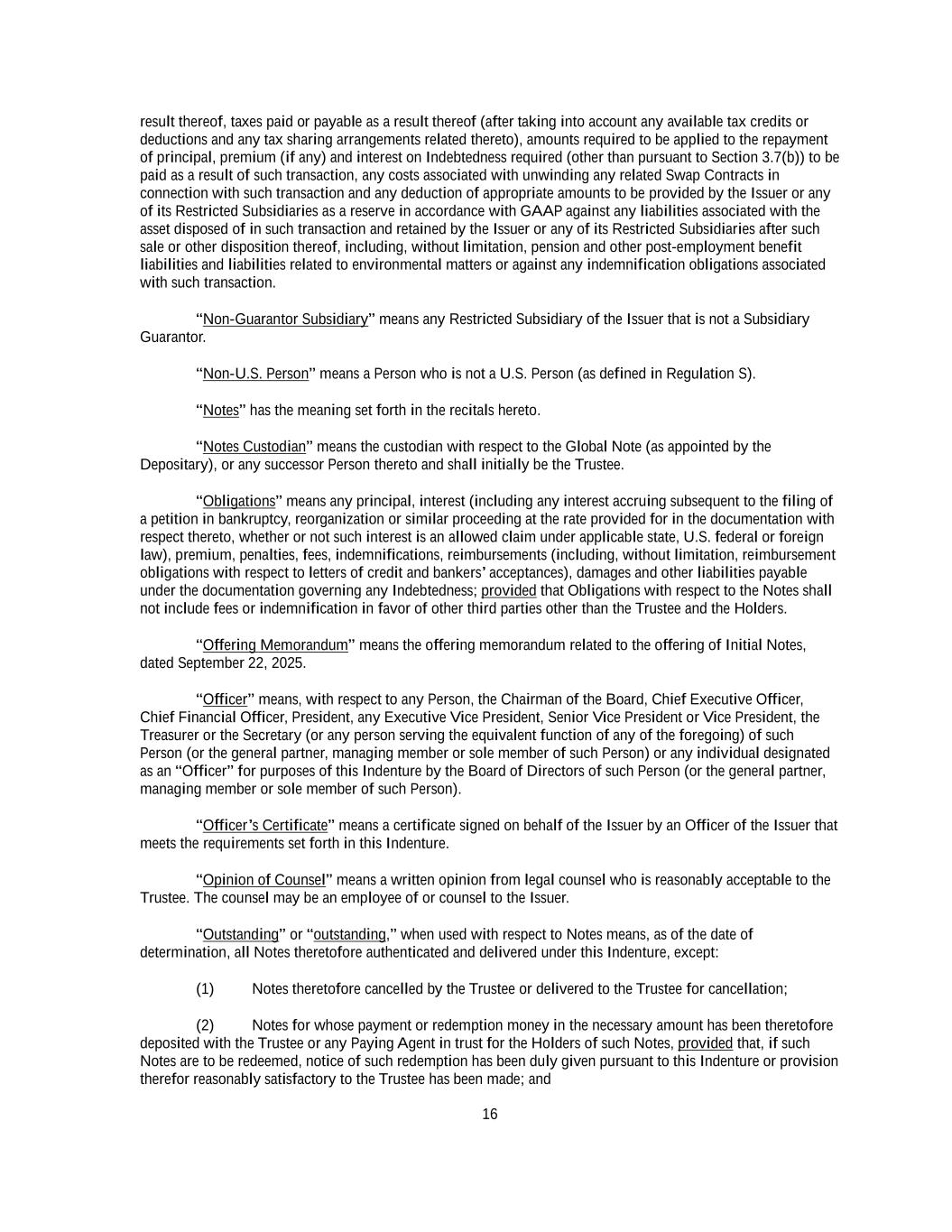 16 result thereof, taxes paid or payable as a result thereof (after taking into account any available tax credits or deductions and any tax sharing arrangements related thereto), amounts required to be applied to the repayment of principal, premium (if any) and interest on Indebtedness required (other than pursuant to Section 3.7(b)) to be paid as a result of such transaction, any costs associated with unwinding any related Swap Contracts in connection with such transaction and any deduction of appropriate amounts to be provided by the Issuer or any of its Restricted Subsidiaries as a reserve in accordance with GAAP against any liabilities associated with the asset disposed of in such transaction and retained by the Issuer or any of its Restricted Subsidiaries after such sale or other disposition thereof, including, without limitation, pension and other post-employment benefit liabilities and liabilities related to environmental matters or against any indemnification obligations associated with such transaction. “Non-Guarantor Subsidiary” means any Restricted Subsidiary of the Issuer that is not a Subsidiary Guarantor. “Non-U.S. Person” means a Person who is not a U.S. Person (as defined in Regulation S). “Notes” has the meaning set forth in the recitals hereto. “Notes Custodian” means the custodian with respect to the Global Note (as appointed by the Depositary), or any successor Person thereto and shall initially be the Trustee. “Obligations” means any principal, interest (including any interest accruing subsequent to the filing of a petition in bankruptcy, reorganization or similar proceeding at the rate provided for in the documentation with respect thereto, whether or not such interest is an allowed claim under applicable state, U.S. federal or foreign law), premium, penalties, fees, indemnifications, reimbursements (including, without limitation, reimbursement obligations with respect to letters of credit and bankers’ acceptances), damages and other liabilities payable under the documentation governing any Indebtedness; provided that Obligations with respect to the Notes shall not include fees or indemnification in favor of other third parties other than the Trustee and the Holders. “Offering Memorandum” means the offering memorandum related to the offering of Initial Notes, dated September 22, 2025. “Officer” means, with respect to any Person, the Chairman of the Board, Chief Executive Officer, Chief Financial Officer, President, any Executive Vice President, Senior Vice President or Vice President, the Treasurer or the Secretary (or any person serving the equivalent function of any of the foregoing) of such Person (or the general partner, managing member or sole member of such Person) or any individual designated as an “Officer” for purposes of this Indenture by the Board of Directors of such Person (or the general partner, managing member or sole member of such Person). “Officer’s Certificate” means a certificate signed on behalf of the Issuer by an Officer of the Issuer that meets the requirements set forth in this Indenture. “Opinion of Counsel” means a written opinion from legal counsel who is reasonably acceptable to the Trustee. The counsel may be an employee of or counsel to the Issuer. “Outstanding” or “outstanding,” when used with respect to Notes means, as of the date of determination, all Notes theretofore authenticated and delivered under this Indenture, except: (1) Notes theretofore cancelled by the Trustee or delivered to the Trustee for cancellation; (2) Notes for whose payment or redemption money in the necessary amount has been theretofore deposited with the Trustee or any Paying Agent in trust for the Holders of such Notes, provided that, if such Notes are to be redeemed, notice of such redemption has been duly given pursuant to this Indenture or provision therefor reasonably satisfactory to the Trustee has been made; and