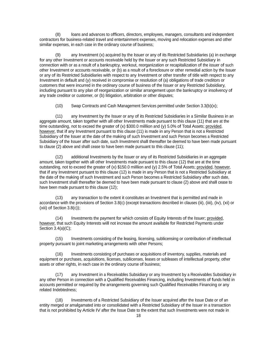 18 (8) loans and advances to officers, directors, employees, managers, consultants and independent contractors for business-related travel and entertainment expenses, moving and relocation expenses and other similar expenses, in each case in the ordinary course of business; (9) any Investment (x) acquired by the Issuer or any of its Restricted Subsidiaries (a) in exchange for any other Investment or accounts receivable held by the Issuer or any such Restricted Subsidiary in connection with or as a result of a bankruptcy, workout, reorganization or recapitalization of the issuer of such other Investment or accounts receivable, or (b) as a result of a foreclosure or other remedial action by the Issuer or any of its Restricted Subsidiaries with respect to any Investment or other transfer of title with respect to any Investment in default and (y) received in compromise or resolution of (a) obligations of trade creditors or customers that were incurred in the ordinary course of business of the Issuer or any Restricted Subsidiary, including pursuant to any plan of reorganization or similar arrangement upon the bankruptcy or insolvency of any trade creditor or customer, or (b) litigation, arbitration or other disputes; (10) Swap Contracts and Cash Management Services permitted under Section 3.3(b)(x); (11) any Investment by the Issuer or any of its Restricted Subsidiaries in a Similar Business in an aggregate amount, taken together with all other Investments made pursuant to this clause (11) that are at the time outstanding, not to exceed the greater of (x) $300.0 million and (y) 5.0% of Total Assets; provided, however, that if any Investment pursuant to this clause (11) is made in any Person that is not a Restricted Subsidiary of the Issuer at the date of the making of such Investment and such Person becomes a Restricted Subsidiary of the Issuer after such date, such Investment shall thereafter be deemed to have been made pursuant to clause (2) above and shall cease to have been made pursuant to this clause (11); (12) additional Investments by the Issuer or any of its Restricted Subsidiaries in an aggregate amount, taken together with all other Investments made pursuant to this clause (12) that are at the time outstanding, not to exceed the greater of (x) $150.0 million and (y) 2.5% of Total Assets; provided, however, that if any Investment pursuant to this clause (12) is made in any Person that is not a Restricted Subsidiary at the date of the making of such Investment and such Person becomes a Restricted Subsidiary after such date, such Investment shall thereafter be deemed to have been made pursuant to clause (2) above and shall cease to have been made pursuant to this clause (12); (13) any transaction to the extent it constitutes an Investment that is permitted and made in accordance with the provisions of Section 3.8(c) (except transactions described in clauses (ii), (iii), (iv), (xi) or (xii) of Section 3.8(c)); (14) Investments the payment for which consists of Equity Interests of the Issuer; provided, however, that such Equity Interests will not increase the amount available for Restricted Payments under Section 3.4(a)(C); (15) Investments consisting of the leasing, licensing, sublicensing or contribution of intellectual property pursuant to joint marketing arrangements with other Persons; (16) Investments consisting of purchases or acquisitions of inventory, supplies, materials and equipment or purchases, acquisitions, licenses, sublicenses, leases or subleases of intellectual property, other assets or other rights, in each case in the ordinary course of business; (17) any Investment in a Receivables Subsidiary or any Investment by a Receivables Subsidiary in any other Person in connection with a Qualified Receivables Financing, including Investments of funds held in accounts permitted or required by the arrangements governing such Qualified Receivables Financing or any related Indebtedness; (18) Investments of a Restricted Subsidiary of the Issuer acquired after the Issue Date or of an entity merged or amalgamated into or consolidated with a Restricted Subsidiary of the Issuer in a transaction that is not prohibited by Article IV after the Issue Date to the extent that such Investments were not made in