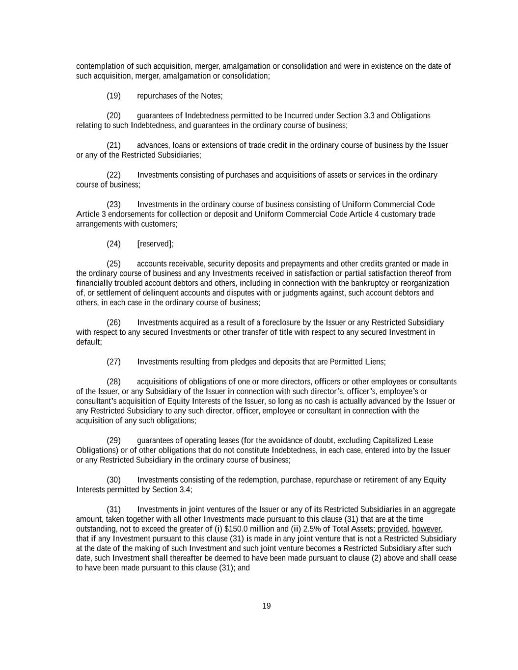 19 contemplation of such acquisition, merger, amalgamation or consolidation and were in existence on the date of such acquisition, merger, amalgamation or consolidation; (19) repurchases of the Notes; (20) guarantees of Indebtedness permitted to be Incurred under Section 3.3 and Obligations relating to such Indebtedness, and guarantees in the ordinary course of business; (21) advances, loans or extensions of trade credit in the ordinary course of business by the Issuer or any of the Restricted Subsidiaries; (22) Investments consisting of purchases and acquisitions of assets or services in the ordinary course of business; (23) Investments in the ordinary course of business consisting of Uniform Commercial Code Article 3 endorsements for collection or deposit and Uniform Commercial Code Article 4 customary trade arrangements with customers; (24) [reserved]; (25) accounts receivable, security deposits and prepayments and other credits granted or made in the ordinary course of business and any Investments received in satisfaction or partial satisfaction thereof from financially troubled account debtors and others, including in connection with the bankruptcy or reorganization of, or settlement of delinquent accounts and disputes with or judgments against, such account debtors and others, in each case in the ordinary course of business; (26) Investments acquired as a result of a foreclosure by the Issuer or any Restricted Subsidiary with respect to any secured Investments or other transfer of title with respect to any secured Investment in default; (27) Investments resulting from pledges and deposits that are Permitted Liens; (28) acquisitions of obligations of one or more directors, officers or other employees or consultants of the Issuer, or any Subsidiary of the Issuer in connection with such director’s, officer’s, employee’s or consultant’s acquisition of Equity Interests of the Issuer, so long as no cash is actually advanced by the Issuer or any Restricted Subsidiary to any such director, officer, employee or consultant in connection with the acquisition of any such obligations; (29) guarantees of operating leases (for the avoidance of doubt, excluding Capitalized Lease Obligations) or of other obligations that do not constitute Indebtedness, in each case, entered into by the Issuer or any Restricted Subsidiary in the ordinary course of business; (30) Investments consisting of the redemption, purchase, repurchase or retirement of any Equity Interests permitted by Section 3.4; (31) Investments in joint ventures of the Issuer or any of its Restricted Subsidiaries in an aggregate amount, taken together with all other Investments made pursuant to this clause (31) that are at the time outstanding, not to exceed the greater of (i) $150.0 million and (ii) 2.5% of Total Assets; provided, however, that if any Investment pursuant to this clause (31) is made in any joint venture that is not a Restricted Subsidiary at the date of the making of such Investment and such joint venture becomes a Restricted Subsidiary after such date, such Investment shall thereafter be deemed to have been made pursuant to clause (2) above and shall cease to have been made pursuant to this clause (31); and