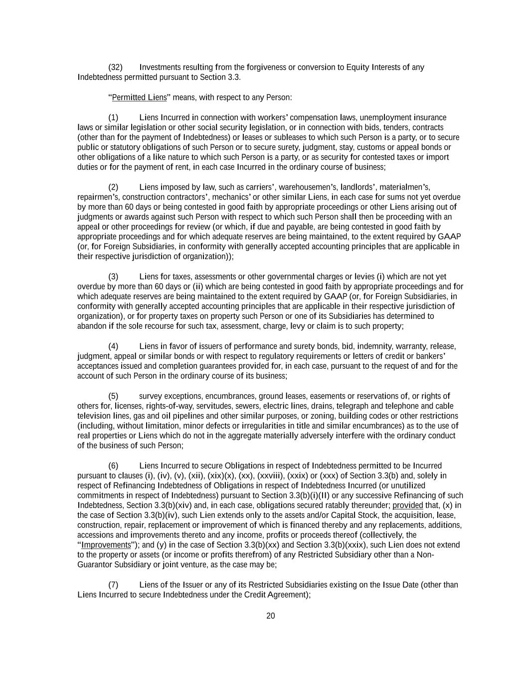 20 (32) Investments resulting from the forgiveness or conversion to Equity Interests of any Indebtedness permitted pursuant to Section 3.3. “Permitted Liens” means, with respect to any Person: (1) Liens Incurred in connection with workers’ compensation laws, unemployment insurance laws or similar legislation or other social security legislation, or in connection with bids, tenders, contracts (other than for the payment of Indebtedness) or leases or subleases to which such Person is a party, or to secure public or statutory obligations of such Person or to secure surety, judgment, stay, customs or appeal bonds or other obligations of a like nature to which such Person is a party, or as security for contested taxes or import duties or for the payment of rent, in each case Incurred in the ordinary course of business; (2) Liens imposed by law, such as carriers’, warehousemen’s, landlords’, materialmen’s, repairmen’s, construction contractors’, mechanics’ or other similar Liens, in each case for sums not yet overdue by more than 60 days or being contested in good faith by appropriate proceedings or other Liens arising out of judgments or awards against such Person with respect to which such Person shall then be proceeding with an appeal or other proceedings for review (or which, if due and payable, are being contested in good faith by appropriate proceedings and for which adequate reserves are being maintained, to the extent required by GAAP (or, for Foreign Subsidiaries, in conformity with generally accepted accounting principles that are applicable in their respective jurisdiction of organization)); (3) Liens for taxes, assessments or other governmental charges or levies (i) which are not yet overdue by more than 60 days or (ii) which are being contested in good faith by appropriate proceedings and for which adequate reserves are being maintained to the extent required by GAAP (or, for Foreign Subsidiaries, in conformity with generally accepted accounting principles that are applicable in their respective jurisdiction of organization), or for property taxes on property such Person or one of its Subsidiaries has determined to abandon if the sole recourse for such tax, assessment, charge, levy or claim is to such property; (4) Liens in favor of issuers of performance and surety bonds, bid, indemnity, warranty, release, judgment, appeal or similar bonds or with respect to regulatory requirements or letters of credit or bankers’ acceptances issued and completion guarantees provided for, in each case, pursuant to the request of and for the account of such Person in the ordinary course of its business; (5) survey exceptions, encumbrances, ground leases, easements or reservations of, or rights of others for, licenses, rights-of-way, servitudes, sewers, electric lines, drains, telegraph and telephone and cable television lines, gas and oil pipelines and other similar purposes, or zoning, building codes or other restrictions (including, without limitation, minor defects or irregularities in title and similar encumbrances) as to the use of real properties or Liens which do not in the aggregate materially adversely interfere with the ordinary conduct of the business of such Person; (6) Liens Incurred to secure Obligations in respect of Indebtedness permitted to be Incurred pursuant to clauses (i), (iv), (v), (xii), (xix)(x), (xx), (xxviii), (xxix) or (xxx) of Section 3.3(b) and, solely in respect of Refinancing Indebtedness of Obligations in respect of Indebtedness Incurred (or unutilized commitments in respect of Indebtedness) pursuant to Section 3.3(b)(i)(II) or any successive Refinancing of such Indebtedness, Section 3.3(b)(xiv) and, in each case, obligations secured ratably thereunder; provided that, (x) in the case of Section 3.3(b)(iv), such Lien extends only to the assets and/or Capital Stock, the acquisition, lease, construction, repair, replacement or improvement of which is financed thereby and any replacements, additions, accessions and improvements thereto and any income, profits or proceeds thereof (collectively, the “Improvements”); and (y) in the case of Section 3.3(b)(xx) and Section 3.3(b)(xxix), such Lien does not extend to the property or assets (or income or profits therefrom) of any Restricted Subsidiary other than a Non- Guarantor Subsidiary or joint venture, as the case may be; (7) Liens of the Issuer or any of its Restricted Subsidiaries existing on the Issue Date (other than Liens Incurred to secure Indebtedness under the Credit Agreement);
