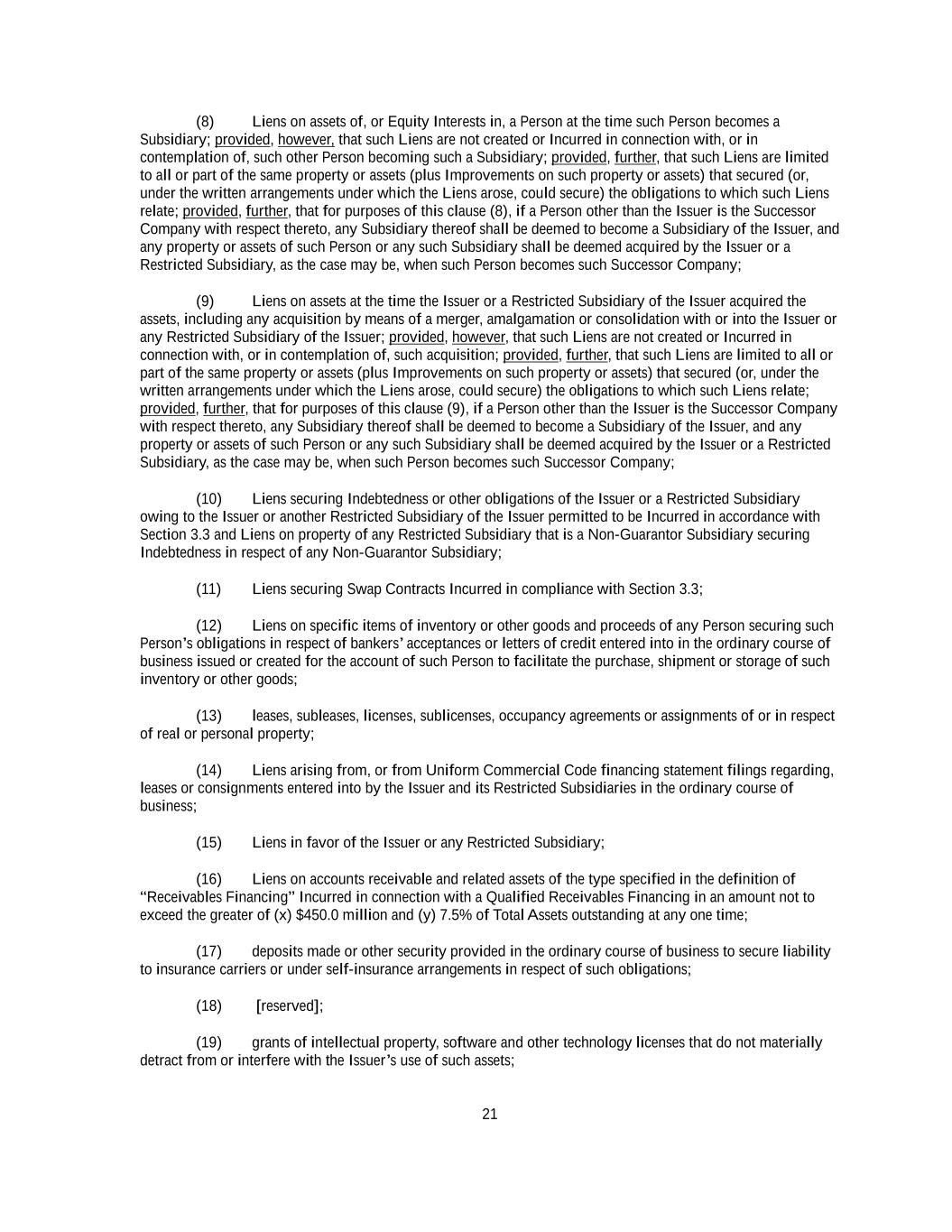 21 (8) Liens on assets of, or Equity Interests in, a Person at the time such Person becomes a Subsidiary; provided, however, that such Liens are not created or Incurred in connection with, or in contemplation of, such other Person becoming such a Subsidiary; provided, further, that such Liens are limited to all or part of the same property or assets (plus Improvements on such property or assets) that secured (or, under the written arrangements under which the Liens arose, could secure) the obligations to which such Liens relate; provided, further, that for purposes of this clause (8), if a Person other than the Issuer is the Successor Company with respect thereto, any Subsidiary thereof shall be deemed to become a Subsidiary of the Issuer, and any property or assets of such Person or any such Subsidiary shall be deemed acquired by the Issuer or a Restricted Subsidiary, as the case may be, when such Person becomes such Successor Company; (9) Liens on assets at the time the Issuer or a Restricted Subsidiary of the Issuer acquired the assets, including any acquisition by means of a merger, amalgamation or consolidation with or into the Issuer or any Restricted Subsidiary of the Issuer; provided, however, that such Liens are not created or Incurred in connection with, or in contemplation of, such acquisition; provided, further, that such Liens are limited to all or part of the same property or assets (plus Improvements on such property or assets) that secured (or, under the written arrangements under which the Liens arose, could secure) the obligations to which such Liens relate; provided, further, that for purposes of this clause (9), if a Person other than the Issuer is the Successor Company with respect thereto, any Subsidiary thereof shall be deemed to become a Subsidiary of the Issuer, and any property or assets of such Person or any such Subsidiary shall be deemed acquired by the Issuer or a Restricted Subsidiary, as the case may be, when such Person becomes such Successor Company; (10) Liens securing Indebtedness or other obligations of the Issuer or a Restricted Subsidiary owing to the Issuer or another Restricted Subsidiary of the Issuer permitted to be Incurred in accordance with Section 3.3 and Liens on property of any Restricted Subsidiary that is a Non-Guarantor Subsidiary securing Indebtedness in respect of any Non-Guarantor Subsidiary; (11) Liens securing Swap Contracts Incurred in compliance with Section 3.3; (12) Liens on specific items of inventory or other goods and proceeds of any Person securing such Person’s obligations in respect of bankers’ acceptances or letters of credit entered into in the ordinary course of business issued or created for the account of such Person to facilitate the purchase, shipment or storage of such inventory or other goods; (13) leases, subleases, licenses, sublicenses, occupancy agreements or assignments of or in respect of real or personal property; (14) Liens arising from, or from Uniform Commercial Code financing statement filings regarding, leases or consignments entered into by the Issuer and its Restricted Subsidiaries in the ordinary course of business; (15) Liens in favor of the Issuer or any Restricted Subsidiary; (16) Liens on accounts receivable and related assets of the type specified in the definition of “Receivables Financing” Incurred in connection with a Qualified Receivables Financing in an amount not to exceed the greater of (x) $450.0 million and (y) 7.5% of Total Assets outstanding at any one time; (17) deposits made or other security provided in the ordinary course of business to secure liability to insurance carriers or under self-insurance arrangements in respect of such obligations; (18) [reserved]; (19) grants of intellectual property, software and other technology licenses that do not materially detract from or interfere with the Issuer’s use of such assets;