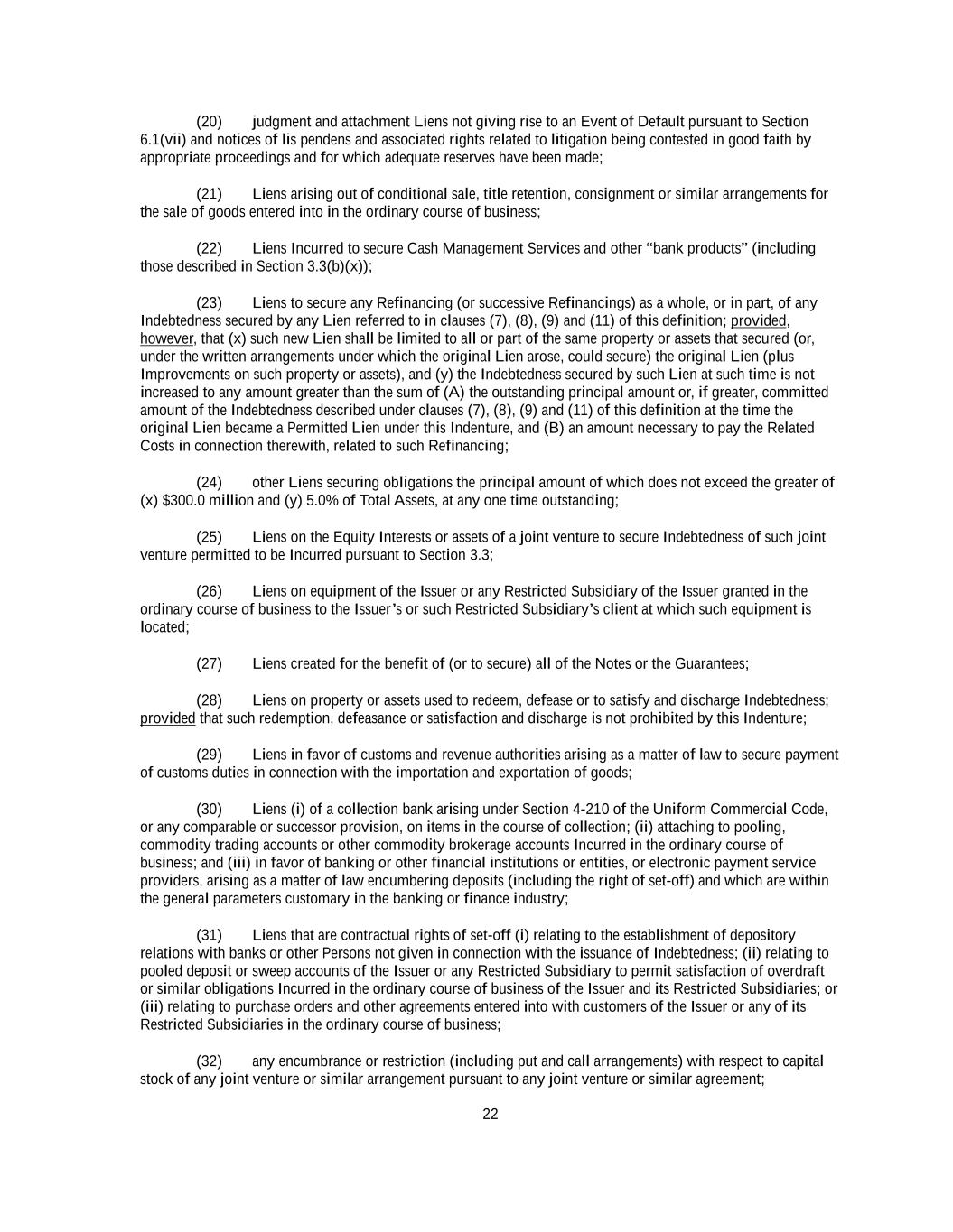 22 (20) judgment and attachment Liens not giving rise to an Event of Default pursuant to Section 6.1(vii) and notices of lis pendens and associated rights related to litigation being contested in good faith by appropriate proceedings and for which adequate reserves have been made; (21) Liens arising out of conditional sale, title retention, consignment or similar arrangements for the sale of goods entered into in the ordinary course of business; (22) Liens Incurred to secure Cash Management Services and other “bank products” (including those described in Section 3.3(b)(x)); (23) Liens to secure any Refinancing (or successive Refinancings) as a whole, or in part, of any Indebtedness secured by any Lien referred to in clauses (7), (8), (9) and (11) of this definition; provided, however, that (x) such new Lien shall be limited to all or part of the same property or assets that secured (or, under the written arrangements under which the original Lien arose, could secure) the original Lien (plus Improvements on such property or assets), and (y) the Indebtedness secured by such Lien at such time is not increased to any amount greater than the sum of (A) the outstanding principal amount or, if greater, committed amount of the Indebtedness described under clauses (7), (8), (9) and (11) of this definition at the time the original Lien became a Permitted Lien under this Indenture, and (B) an amount necessary to pay the Related Costs in connection therewith, related to such Refinancing; (24) other Liens securing obligations the principal amount of which does not exceed the greater of (x) $300.0 million and (y) 5.0% of Total Assets, at any one time outstanding; (25) Liens on the Equity Interests or assets of a joint venture to secure Indebtedness of such joint venture permitted to be Incurred pursuant to Section 3.3; (26) Liens on equipment of the Issuer or any Restricted Subsidiary of the Issuer granted in the ordinary course of business to the Issuer’s or such Restricted Subsidiary’s client at which such equipment is located; (27) Liens created for the benefit of (or to secure) all of the Notes or the Guarantees; (28) Liens on property or assets used to redeem, defease or to satisfy and discharge Indebtedness; provided that such redemption, defeasance or satisfaction and discharge is not prohibited by this Indenture; (29) Liens in favor of customs and revenue authorities arising as a matter of law to secure payment of customs duties in connection with the importation and exportation of goods; (30) Liens (i) of a collection bank arising under Section 4-210 of the Uniform Commercial Code, or any comparable or successor provision, on items in the course of collection; (ii) attaching to pooling, commodity trading accounts or other commodity brokerage accounts Incurred in the ordinary course of business; and (iii) in favor of banking or other financial institutions or entities, or electronic payment service providers, arising as a matter of law encumbering deposits (including the right of set-off) and which are within the general parameters customary in the banking or finance industry; (31) Liens that are contractual rights of set-off (i) relating to the establishment of depository relations with banks or other Persons not given in connection with the issuance of Indebtedness; (ii) relating to pooled deposit or sweep accounts of the Issuer or any Restricted Subsidiary to permit satisfaction of overdraft or similar obligations Incurred in the ordinary course of business of the Issuer and its Restricted Subsidiaries; or (iii) relating to purchase orders and other agreements entered into with customers of the Issuer or any of its Restricted Subsidiaries in the ordinary course of business; (32) any encumbrance or restriction (including put and call arrangements) with respect to capital stock of any joint venture or similar arrangement pursuant to any joint venture or similar agreement;