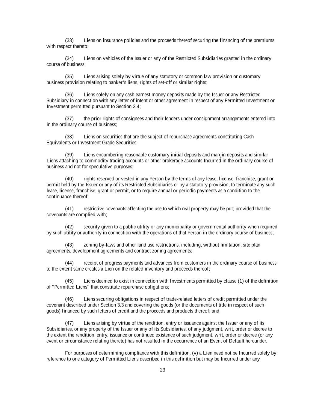 23 (33) Liens on insurance policies and the proceeds thereof securing the financing of the premiums with respect thereto; (34) Liens on vehicles of the Issuer or any of the Restricted Subsidiaries granted in the ordinary course of business; (35) Liens arising solely by virtue of any statutory or common law provision or customary business provision relating to banker’s liens, rights of set-off or similar rights; (36) Liens solely on any cash earnest money deposits made by the Issuer or any Restricted Subsidiary in connection with any letter of intent or other agreement in respect of any Permitted Investment or Investment permitted pursuant to Section 3.4; (37) the prior rights of consignees and their lenders under consignment arrangements entered into in the ordinary course of business; (38) Liens on securities that are the subject of repurchase agreements constituting Cash Equivalents or Investment Grade Securities; (39) Liens encumbering reasonable customary initial deposits and margin deposits and similar Liens attaching to commodity trading accounts or other brokerage accounts Incurred in the ordinary course of business and not for speculative purposes; (40) rights reserved or vested in any Person by the terms of any lease, license, franchise, grant or permit held by the Issuer or any of its Restricted Subsidiaries or by a statutory provision, to terminate any such lease, license, franchise, grant or permit, or to require annual or periodic payments as a condition to the continuance thereof; (41) restrictive covenants affecting the use to which real property may be put; provided that the covenants are complied with; (42) security given to a public utility or any municipality or governmental authority when required by such utility or authority in connection with the operations of that Person in the ordinary course of business; (43) zoning by-laws and other land use restrictions, including, without limitation, site plan agreements, development agreements and contract zoning agreements; (44) receipt of progress payments and advances from customers in the ordinary course of business to the extent same creates a Lien on the related inventory and proceeds thereof; (45) Liens deemed to exist in connection with Investments permitted by clause (1) of the definition of “Permitted Liens” that constitute repurchase obligations; (46) Liens securing obligations in respect of trade-related letters of credit permitted under the covenant described under Section 3.3 and covering the goods (or the documents of title in respect of such goods) financed by such letters of credit and the proceeds and products thereof; and (47) Liens arising by virtue of the rendition, entry or issuance against the Issuer or any of its Subsidiaries, or any property of the Issuer or any of its Subsidiaries, of any judgment, writ, order or decree to the extent the rendition, entry, issuance or continued existence of such judgment, writ, order or decree (or any event or circumstance relating thereto) has not resulted in the occurrence of an Event of Default hereunder. For purposes of determining compliance with this definition, (v) a Lien need not be Incurred solely by reference to one category of Permitted Liens described in this definition but may be Incurred under any