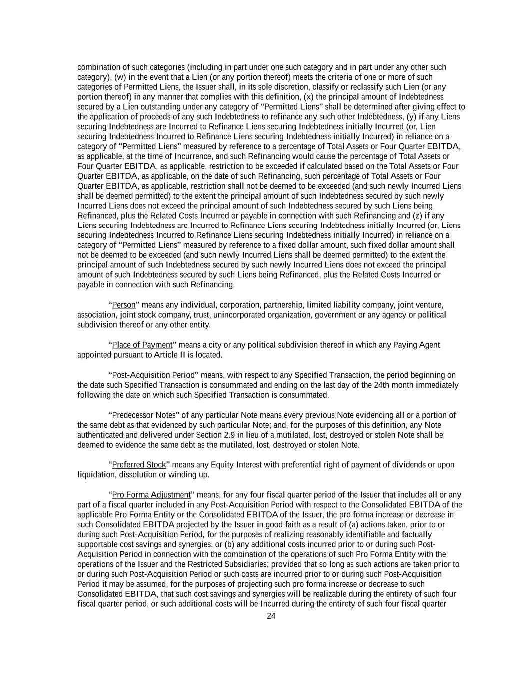 24 combination of such categories (including in part under one such category and in part under any other such category), (w) in the event that a Lien (or any portion thereof) meets the criteria of one or more of such categories of Permitted Liens, the Issuer shall, in its sole discretion, classify or reclassify such Lien (or any portion thereof) in any manner that complies with this definition, (x) the principal amount of Indebtedness secured by a Lien outstanding under any category of “Permitted Liens” shall be determined after giving effect to the application of proceeds of any such Indebtedness to refinance any such other Indebtedness, (y) if any Liens securing Indebtedness are Incurred to Refinance Liens securing Indebtedness initially Incurred (or, Lien securing Indebtedness Incurred to Refinance Liens securing Indebtedness initially Incurred) in reliance on a category of “Permitted Liens” measured by reference to a percentage of Total Assets or Four Quarter EBITDA, as applicable, at the time of Incurrence, and such Refinancing would cause the percentage of Total Assets or Four Quarter EBITDA, as applicable, restriction to be exceeded if calculated based on the Total Assets or Four Quarter EBITDA, as applicable, on the date of such Refinancing, such percentage of Total Assets or Four Quarter EBITDA, as applicable, restriction shall not be deemed to be exceeded (and such newly Incurred Liens shall be deemed permitted) to the extent the principal amount of such Indebtedness secured by such newly Incurred Liens does not exceed the principal amount of such Indebtedness secured by such Liens being Refinanced, plus the Related Costs Incurred or payable in connection with such Refinancing and (z) if any Liens securing Indebtedness are Incurred to Refinance Liens securing Indebtedness initially Incurred (or, Liens securing Indebtedness Incurred to Refinance Liens securing Indebtedness initially Incurred) in reliance on a category of “Permitted Liens” measured by reference to a fixed dollar amount, such fixed dollar amount shall not be deemed to be exceeded (and such newly Incurred Liens shall be deemed permitted) to the extent the principal amount of such Indebtedness secured by such newly Incurred Liens does not exceed the principal amount of such Indebtedness secured by such Liens being Refinanced, plus the Related Costs Incurred or payable in connection with such Refinancing. “Person” means any individual, corporation, partnership, limited liability company, joint venture, association, joint stock company, trust, unincorporated organization, government or any agency or political subdivision thereof or any other entity. “Place of Payment” means a city or any political subdivision thereof in which any Paying Agent appointed pursuant to Article II is located. “Post-Acquisition Period” means, with respect to any Specified Transaction, the period beginning on the date such Specified Transaction is consummated and ending on the last day of the 24th month immediately following the date on which such Specified Transaction is consummated. “Predecessor Notes” of any particular Note means every previous Note evidencing all or a portion of the same debt as that evidenced by such particular Note; and, for the purposes of this definition, any Note authenticated and delivered under Section 2.9 in lieu of a mutilated, lost, destroyed or stolen Note shall be deemed to evidence the same debt as the mutilated, lost, destroyed or stolen Note. “Preferred Stock” means any Equity Interest with preferential right of payment of dividends or upon liquidation, dissolution or winding up. “Pro Forma Adjustment” means, for any four fiscal quarter period of the Issuer that includes all or any part of a fiscal quarter included in any Post-Acquisition Period with respect to the Consolidated EBITDA of the applicable Pro Forma Entity or the Consolidated EBITDA of the Issuer, the pro forma increase or decrease in such Consolidated EBITDA projected by the Issuer in good faith as a result of (a) actions taken, prior to or during such Post-Acquisition Period, for the purposes of realizing reasonably identifiable and factually supportable cost savings and synergies, or (b) any additional costs incurred prior to or during such Post- Acquisition Period in connection with the combination of the operations of such Pro Forma Entity with the operations of the Issuer and the Restricted Subsidiaries; provided that so long as such actions are taken prior to or during such Post-Acquisition Period or such costs are incurred prior to or during such Post-Acquisition Period it may be assumed, for the purposes of projecting such pro forma increase or decrease to such Consolidated EBITDA, that such cost savings and synergies will be realizable during the entirety of such four fiscal quarter period, or such additional costs will be Incurred during the entirety of such four fiscal quarter