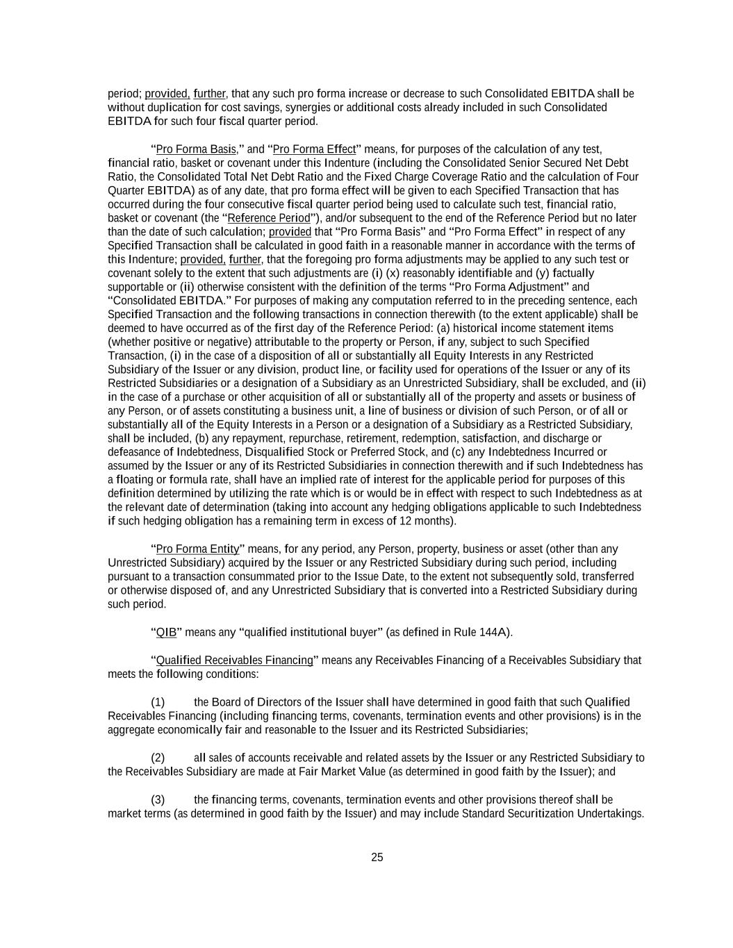 25 period; provided, further, that any such pro forma increase or decrease to such Consolidated EBITDA shall be without duplication for cost savings, synergies or additional costs already included in such Consolidated EBITDA for such four fiscal quarter period. “Pro Forma Basis,” and “Pro Forma Effect” means, for purposes of the calculation of any test, financial ratio, basket or covenant under this Indenture (including the Consolidated Senior Secured Net Debt Ratio, the Consolidated Total Net Debt Ratio and the Fixed Charge Coverage Ratio and the calculation of Four Quarter EBITDA) as of any date, that pro forma effect will be given to each Specified Transaction that has occurred during the four consecutive fiscal quarter period being used to calculate such test, financial ratio, basket or covenant (the “Reference Period”), and/or subsequent to the end of the Reference Period but no later than the date of such calculation; provided that “Pro Forma Basis” and “Pro Forma Effect” in respect of any Specified Transaction shall be calculated in good faith in a reasonable manner in accordance with the terms of this Indenture; provided, further, that the foregoing pro forma adjustments may be applied to any such test or covenant solely to the extent that such adjustments are (i) (x) reasonably identifiable and (y) factually supportable or (ii) otherwise consistent with the definition of the terms “Pro Forma Adjustment” and “Consolidated EBITDA.” For purposes of making any computation referred to in the preceding sentence, each Specified Transaction and the following transactions in connection therewith (to the extent applicable) shall be deemed to have occurred as of the first day of the Reference Period: (a) historical income statement items (whether positive or negative) attributable to the property or Person, if any, subject to such Specified Transaction, (i) in the case of a disposition of all or substantially all Equity Interests in any Restricted Subsidiary of the Issuer or any division, product line, or facility used for operations of the Issuer or any of its Restricted Subsidiaries or a designation of a Subsidiary as an Unrestricted Subsidiary, shall be excluded, and (ii) in the case of a purchase or other acquisition of all or substantially all of the property and assets or business of any Person, or of assets constituting a business unit, a line of business or division of such Person, or of all or substantially all of the Equity Interests in a Person or a designation of a Subsidiary as a Restricted Subsidiary, shall be included, (b) any repayment, repurchase, retirement, redemption, satisfaction, and discharge or defeasance of Indebtedness, Disqualified Stock or Preferred Stock, and (c) any Indebtedness Incurred or assumed by the Issuer or any of its Restricted Subsidiaries in connection therewith and if such Indebtedness has a floating or formula rate, shall have an implied rate of interest for the applicable period for purposes of this definition determined by utilizing the rate which is or would be in effect with respect to such Indebtedness as at the relevant date of determination (taking into account any hedging obligations applicable to such Indebtedness if such hedging obligation has a remaining term in excess of 12 months). “Pro Forma Entity” means, for any period, any Person, property, business or asset (other than any Unrestricted Subsidiary) acquired by the Issuer or any Restricted Subsidiary during such period, including pursuant to a transaction consummated prior to the Issue Date, to the extent not subsequently sold, transferred or otherwise disposed of, and any Unrestricted Subsidiary that is converted into a Restricted Subsidiary during such period. “QIB” means any “qualified institutional buyer” (as defined in Rule 144A). “Qualified Receivables Financing” means any Receivables Financing of a Receivables Subsidiary that meets the following conditions: (1) the Board of Directors of the Issuer shall have determined in good faith that such Qualified Receivables Financing (including financing terms, covenants, termination events and other provisions) is in the aggregate economically fair and reasonable to the Issuer and its Restricted Subsidiaries; (2) all sales of accounts receivable and related assets by the Issuer or any Restricted Subsidiary to the Receivables Subsidiary are made at Fair Market Value (as determined in good faith by the Issuer); and (3) the financing terms, covenants, termination events and other provisions thereof shall be market terms (as determined in good faith by the Issuer) and may include Standard Securitization Undertakings.