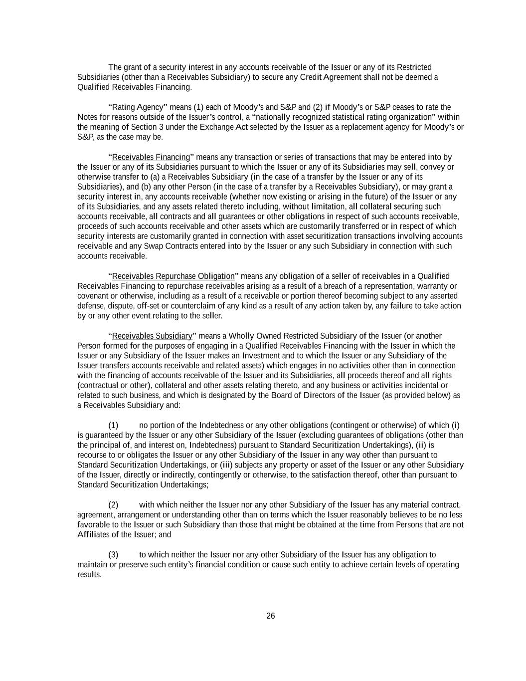 26 The grant of a security interest in any accounts receivable of the Issuer or any of its Restricted Subsidiaries (other than a Receivables Subsidiary) to secure any Credit Agreement shall not be deemed a Qualified Receivables Financing. “Rating Agency” means (1) each of Moody’s and S&P and (2) if Moody’s or S&P ceases to rate the Notes for reasons outside of the Issuer’s control, a “nationally recognized statistical rating organization” within the meaning of Section 3 under the Exchange Act selected by the Issuer as a replacement agency for Moody’s or S&P, as the case may be. “Receivables Financing” means any transaction or series of transactions that may be entered into by the Issuer or any of its Subsidiaries pursuant to which the Issuer or any of its Subsidiaries may sell, convey or otherwise transfer to (a) a Receivables Subsidiary (in the case of a transfer by the Issuer or any of its Subsidiaries), and (b) any other Person (in the case of a transfer by a Receivables Subsidiary), or may grant a security interest in, any accounts receivable (whether now existing or arising in the future) of the Issuer or any of its Subsidiaries, and any assets related thereto including, without limitation, all collateral securing such accounts receivable, all contracts and all guarantees or other obligations in respect of such accounts receivable, proceeds of such accounts receivable and other assets which are customarily transferred or in respect of which security interests are customarily granted in connection with asset securitization transactions involving accounts receivable and any Swap Contracts entered into by the Issuer or any such Subsidiary in connection with such accounts receivable. “Receivables Repurchase Obligation” means any obligation of a seller of receivables in a Qualified Receivables Financing to repurchase receivables arising as a result of a breach of a representation, warranty or covenant or otherwise, including as a result of a receivable or portion thereof becoming subject to any asserted defense, dispute, off-set or counterclaim of any kind as a result of any action taken by, any failure to take action by or any other event relating to the seller. “Receivables Subsidiary” means a Wholly Owned Restricted Subsidiary of the Issuer (or another Person formed for the purposes of engaging in a Qualified Receivables Financing with the Issuer in which the Issuer or any Subsidiary of the Issuer makes an Investment and to which the Issuer or any Subsidiary of the Issuer transfers accounts receivable and related assets) which engages in no activities other than in connection with the financing of accounts receivable of the Issuer and its Subsidiaries, all proceeds thereof and all rights (contractual or other), collateral and other assets relating thereto, and any business or activities incidental or related to such business, and which is designated by the Board of Directors of the Issuer (as provided below) as a Receivables Subsidiary and: (1) no portion of the Indebtedness or any other obligations (contingent or otherwise) of which (i) is guaranteed by the Issuer or any other Subsidiary of the Issuer (excluding guarantees of obligations (other than the principal of, and interest on, Indebtedness) pursuant to Standard Securitization Undertakings), (ii) is recourse to or obligates the Issuer or any other Subsidiary of the Issuer in any way other than pursuant to Standard Securitization Undertakings, or (iii) subjects any property or asset of the Issuer or any other Subsidiary of the Issuer, directly or indirectly, contingently or otherwise, to the satisfaction thereof, other than pursuant to Standard Securitization Undertakings; (2) with which neither the Issuer nor any other Subsidiary of the Issuer has any material contract, agreement, arrangement or understanding other than on terms which the Issuer reasonably believes to be no less favorable to the Issuer or such Subsidiary than those that might be obtained at the time from Persons that are not Affiliates of the Issuer; and (3) to which neither the Issuer nor any other Subsidiary of the Issuer has any obligation to maintain or preserve such entity’s financial condition or cause such entity to achieve certain levels of operating results.