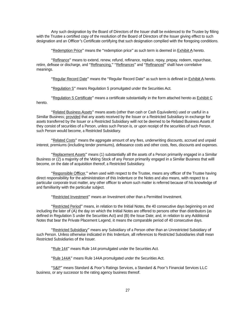 27 Any such designation by the Board of Directors of the Issuer shall be evidenced to the Trustee by filing with the Trustee a certified copy of the resolution of the Board of Directors of the Issuer giving effect to such designation and an Officer’s Certificate certifying that such designation complied with the foregoing conditions. “Redemption Price” means the “redemption price” as such term is deemed in Exhibit A hereto. “Refinance” means to extend, renew, refund, refinance, replace, repay, prepay, redeem, repurchase, retire, defease or discharge, and “Refinancing,” “Refinances” and “Refinanced” shall have correlative meanings. “Regular Record Date” means the “Regular Record Date” as such term is defined in Exhibit A hereto. “Regulation S” means Regulation S promulgated under the Securities Act. “Regulation S Certificate” means a certificate substantially in the form attached hereto as Exhibit C hereto. “Related Business Assets” means assets (other than cash or Cash Equivalents) used or useful in a Similar Business; provided that any assets received by the Issuer or a Restricted Subsidiary in exchange for assets transferred by the Issuer or a Restricted Subsidiary will not be deemed to be Related Business Assets if they consist of securities of a Person, unless such Person is, or upon receipt of the securities of such Person, such Person would become, a Restricted Subsidiary. “Related Costs” means the aggregate amount of any fees, underwriting discounts, accrued and unpaid interest, premiums (including tender premiums), defeasance costs and other costs, fees, discounts and expenses. “Replacement Assets” means (1) substantially all the assets of a Person primarily engaged in a Similar Business or (2) a majority of the Voting Stock of any Person primarily engaged in a Similar Business that will become, on the date of acquisition thereof, a Restricted Subsidiary. “Responsible Officer,” when used with respect to the Trustee, means any officer of the Trustee having direct responsibility for the administration of this Indenture or the Notes and also means, with respect to a particular corporate trust matter, any other officer to whom such matter is referred because of his knowledge of and familiarity with the particular subject. “Restricted Investment” means an Investment other than a Permitted Investment. “Restricted Period” means, in relation to the Initial Notes, the 40 consecutive days beginning on and including the later of (A) the day on which the Initial Notes are offered to persons other than distributors (as defined in Regulation S under the Securities Act) and (B) the Issue Date; and, in relation to any Additional Notes that bear the Private Placement Legend, it means the comparable period of 40 consecutive days. “Restricted Subsidiary” means any Subsidiary of a Person other than an Unrestricted Subsidiary of such Person. Unless otherwise indicated in this Indenture, all references to Restricted Subsidiaries shall mean Restricted Subsidiaries of the Issuer. “Rule 144” means Rule 144 promulgated under the Securities Act. “Rule 144A” means Rule 144A promulgated under the Securities Act. “S&P” means Standard & Poor’s Ratings Services, a Standard & Poor’s Financial Services LLC business, or any successor to the rating agency business thereof.