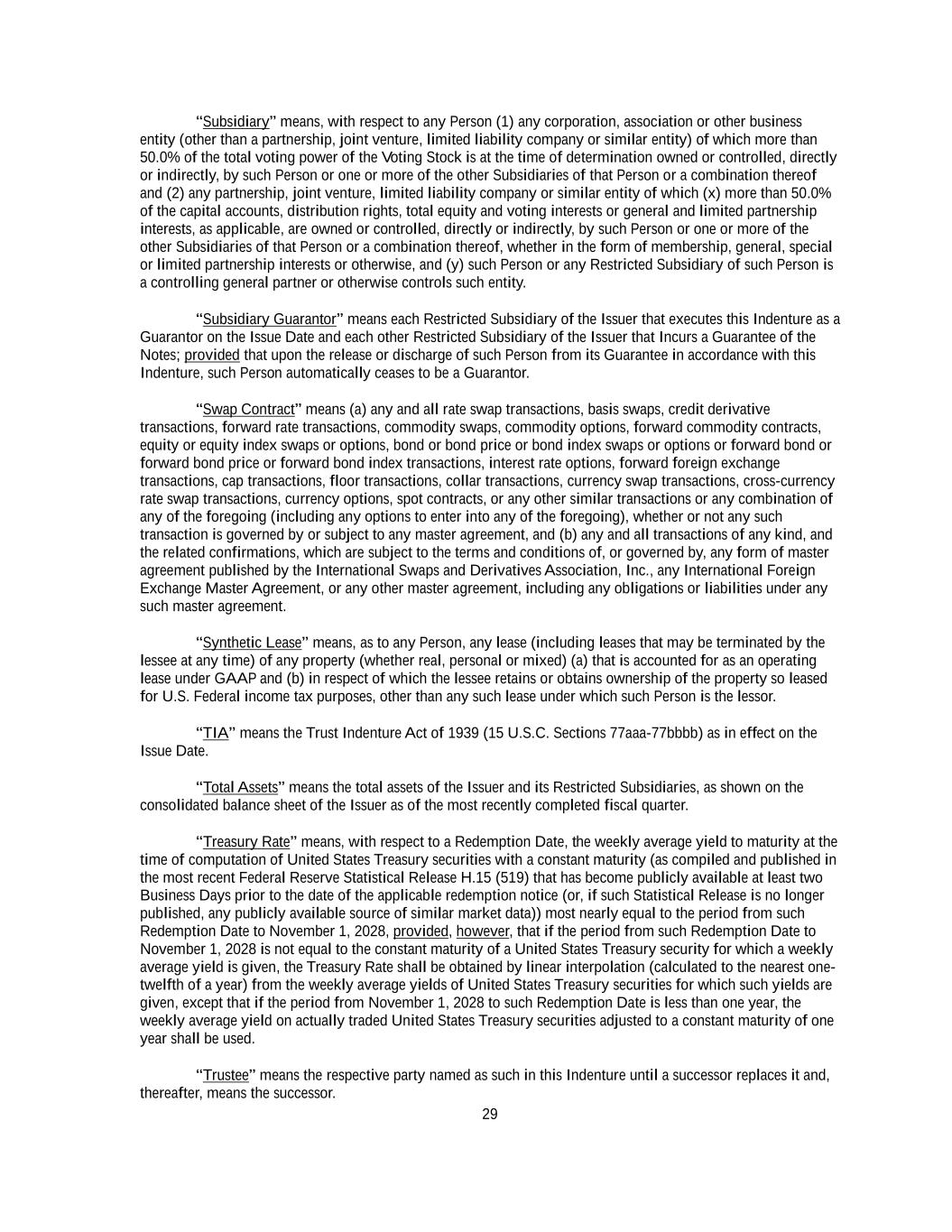 29 “Subsidiary” means, with respect to any Person (1) any corporation, association or other business entity (other than a partnership, joint venture, limited liability company or similar entity) of which more than 50.0% of the total voting power of the Voting Stock is at the time of determination owned or controlled, directly or indirectly, by such Person or one or more of the other Subsidiaries of that Person or a combination thereof and (2) any partnership, joint venture, limited liability company or similar entity of which (x) more than 50.0% of the capital accounts, distribution rights, total equity and voting interests or general and limited partnership interests, as applicable, are owned or controlled, directly or indirectly, by such Person or one or more of the other Subsidiaries of that Person or a combination thereof, whether in the form of membership, general, special or limited partnership interests or otherwise, and (y) such Person or any Restricted Subsidiary of such Person is a controlling general partner or otherwise controls such entity. “Subsidiary Guarantor” means each Restricted Subsidiary of the Issuer that executes this Indenture as a Guarantor on the Issue Date and each other Restricted Subsidiary of the Issuer that Incurs a Guarantee of the Notes; provided that upon the release or discharge of such Person from its Guarantee in accordance with this Indenture, such Person automatically ceases to be a Guarantor. “Swap Contract” means (a) any and all rate swap transactions, basis swaps, credit derivative transactions, forward rate transactions, commodity swaps, commodity options, forward commodity contracts, equity or equity index swaps or options, bond or bond price or bond index swaps or options or forward bond or forward bond price or forward bond index transactions, interest rate options, forward foreign exchange transactions, cap transactions, floor transactions, collar transactions, currency swap transactions, cross-currency rate swap transactions, currency options, spot contracts, or any other similar transactions or any combination of any of the foregoing (including any options to enter into any of the foregoing), whether or not any such transaction is governed by or subject to any master agreement, and (b) any and all transactions of any kind, and the related confirmations, which are subject to the terms and conditions of, or governed by, any form of master agreement published by the International Swaps and Derivatives Association, Inc., any International Foreign Exchange Master Agreement, or any other master agreement, including any obligations or liabilities under any such master agreement. “Synthetic Lease” means, as to any Person, any lease (including leases that may be terminated by the lessee at any time) of any property (whether real, personal or mixed) (a) that is accounted for as an operating lease under GAAP and (b) in respect of which the lessee retains or obtains ownership of the property so leased for U.S. Federal income tax purposes, other than any such lease under which such Person is the lessor. “TIA” means the Trust Indenture Act of 1939 (15 U.S.C. Sections 77aaa-77bbbb) as in effect on the Issue Date. “Total Assets” means the total assets of the Issuer and its Restricted Subsidiaries, as shown on the consolidated balance sheet of the Issuer as of the most recently completed fiscal quarter. “Treasury Rate” means, with respect to a Redemption Date, the weekly average yield to maturity at the time of computation of United States Treasury securities with a constant maturity (as compiled and published in the most recent Federal Reserve Statistical Release H.15 (519) that has become publicly available at least two Business Days prior to the date of the applicable redemption notice (or, if such Statistical Release is no longer published, any publicly available source of similar market data)) most nearly equal to the period from such Redemption Date to November 1, 2028, provided, however, that if the period from such Redemption Date to November 1, 2028 is not equal to the constant maturity of a United States Treasury security for which a weekly average yield is given, the Treasury Rate shall be obtained by linear interpolation (calculated to the nearest one- twelfth of a year) from the weekly average yields of United States Treasury securities for which such yields are given, except that if the period from November 1, 2028 to such Redemption Date is less than one year, the weekly average yield on actually traded United States Treasury securities adjusted to a constant maturity of one year shall be used. “Trustee” means the respective party named as such in this Indenture until a successor replaces it and, thereafter, means the successor.