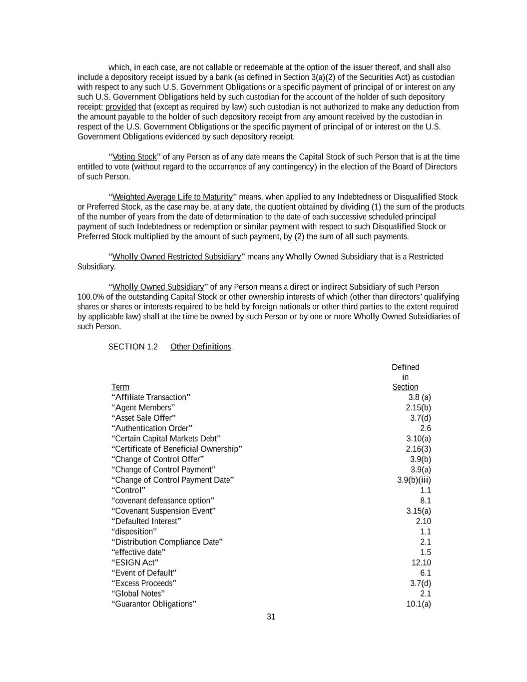 31 which, in each case, are not callable or redeemable at the option of the issuer thereof, and shall also include a depository receipt issued by a bank (as defined in Section 3(a)(2) of the Securities Act) as custodian with respect to any such U.S. Government Obligations or a specific payment of principal of or interest on any such U.S. Government Obligations held by such custodian for the account of the holder of such depository receipt; provided that (except as required by law) such custodian is not authorized to make any deduction from the amount payable to the holder of such depository receipt from any amount received by the custodian in respect of the U.S. Government Obligations or the specific payment of principal of or interest on the U.S. Government Obligations evidenced by such depository receipt. “Voting Stock” of any Person as of any date means the Capital Stock of such Person that is at the time entitled to vote (without regard to the occurrence of any contingency) in the election of the Board of Directors of such Person. “Weighted Average Life to Maturity” means, when applied to any Indebtedness or Disqualified Stock or Preferred Stock, as the case may be, at any date, the quotient obtained by dividing (1) the sum of the products of the number of years from the date of determination to the date of each successive scheduled principal payment of such Indebtedness or redemption or similar payment with respect to such Disqualified Stock or Preferred Stock multiplied by the amount of such payment, by (2) the sum of all such payments. “Wholly Owned Restricted Subsidiary” means any Wholly Owned Subsidiary that is a Restricted Subsidiary. “Wholly Owned Subsidiary” of any Person means a direct or indirect Subsidiary of such Person 100.0% of the outstanding Capital Stock or other ownership interests of which (other than directors’ qualifying shares or shares or interests required to be held by foreign nationals or other third parties to the extent required by applicable law) shall at the time be owned by such Person or by one or more Wholly Owned Subsidiaries of such Person. SECTION 1.2 Other Definitions. Term Defined in Section “Affiliate Transaction” 3.8 (a) “Agent Members” 2.15(b) “Asset Sale Offer” 3.7(d) “Authentication Order” 2.6 “Certain Capital Markets Debt” 3.10(a) “Certificate of Beneficial Ownership” 2.16(3) “Change of Control Offer” 3.9(b) “Change of Control Payment” 3.9(a) “Change of Control Payment Date” 3.9(b)(iii) “Control” 1.1 “covenant defeasance option” 8.1 “Covenant Suspension Event” 3.15(a) “Defaulted Interest” 2.10 “disposition” 1.1 “Distribution Compliance Date” 2.1 “effective date” 1.5 “ESIGN Act” 12.10 “Event of Default” 6.1 “Excess Proceeds” 3.7(d) “Global Notes” 2.1 “Guarantor Obligations” 10.1(a)