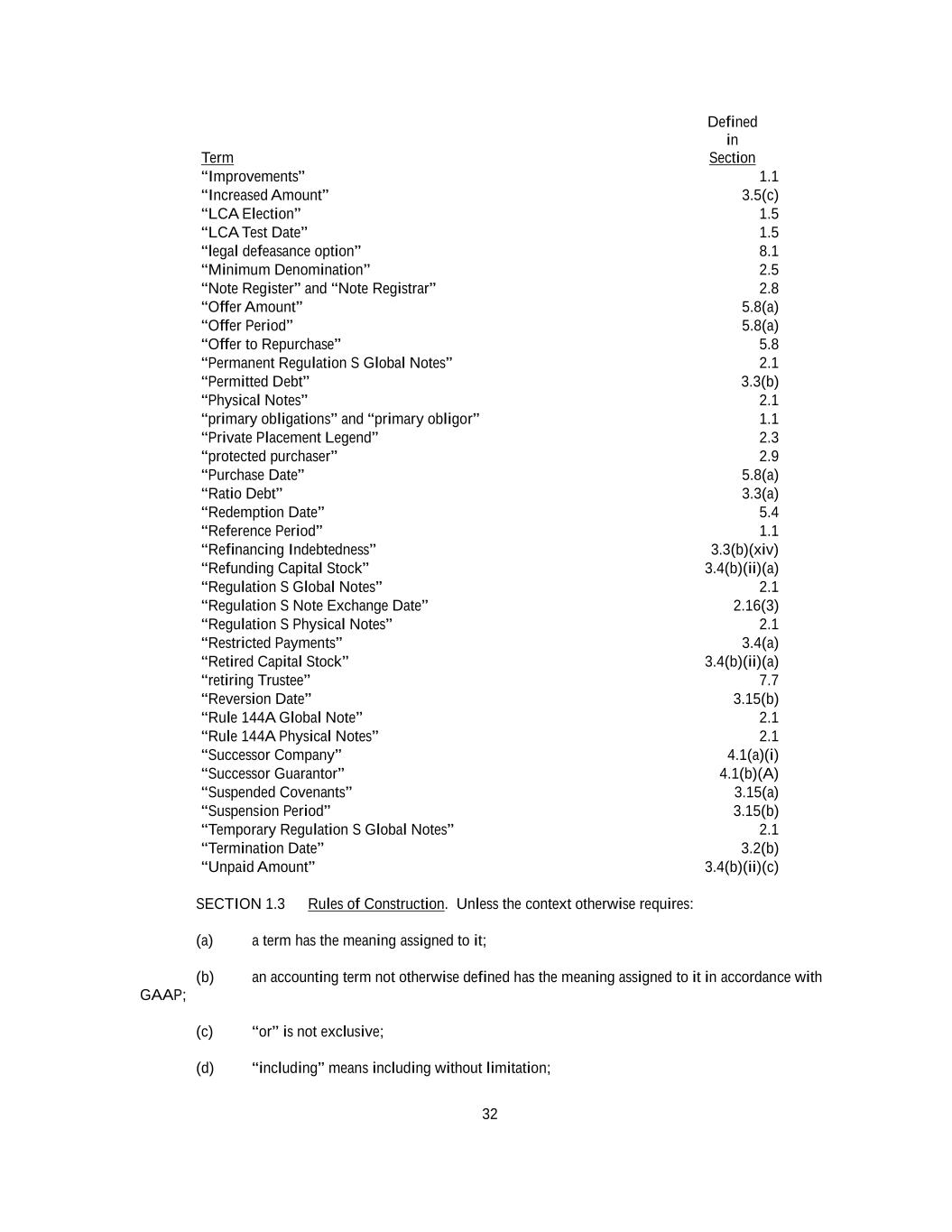 32 Term Defined in Section “Improvements” 1.1 “Increased Amount” 3.5(c) “LCA Election” 1.5 “LCA Test Date” 1.5 “legal defeasance option” 8.1 “Minimum Denomination” 2.5 “Note Register” and “Note Registrar” 2.8 “Offer Amount” 5.8(a) “Offer Period” 5.8(a) “Offer to Repurchase” 5.8 “Permanent Regulation S Global Notes” 2.1 “Permitted Debt” 3.3(b) “Physical Notes” 2.1 “primary obligations” and “primary obligor” 1.1 “Private Placement Legend” 2.3 “protected purchaser” 2.9 “Purchase Date” 5.8(a) “Ratio Debt” 3.3(a) “Redemption Date” 5.4 “Reference Period” 1.1 “Refinancing Indebtedness” 3.3(b)(xiv) “Refunding Capital Stock” 3.4(b)(ii)(a) “Regulation S Global Notes” 2.1 “Regulation S Note Exchange Date” 2.16(3) “Regulation S Physical Notes” 2.1 “Restricted Payments” 3.4(a) “Retired Capital Stock” 3.4(b)(ii)(a) “retiring Trustee” 7.7 “Reversion Date” 3.15(b) “Rule 144A Global Note” 2.1 “Rule 144A Physical Notes” 2.1 “Successor Company” 4.1(a)(i) “Successor Guarantor” 4.1(b)(A) “Suspended Covenants” 3.15(a) “Suspension Period” 3.15(b) “Temporary Regulation S Global Notes” 2.1 “Termination Date” 3.2(b) “Unpaid Amount” 3.4(b)(ii)(c) SECTION 1.3 Rules of Construction. Unless the context otherwise requires: (a) a term has the meaning assigned to it; (b) an accounting term not otherwise defined has the meaning assigned to it in accordance with GAAP; (c) “or” is not exclusive; (d) “including” means including without limitation;