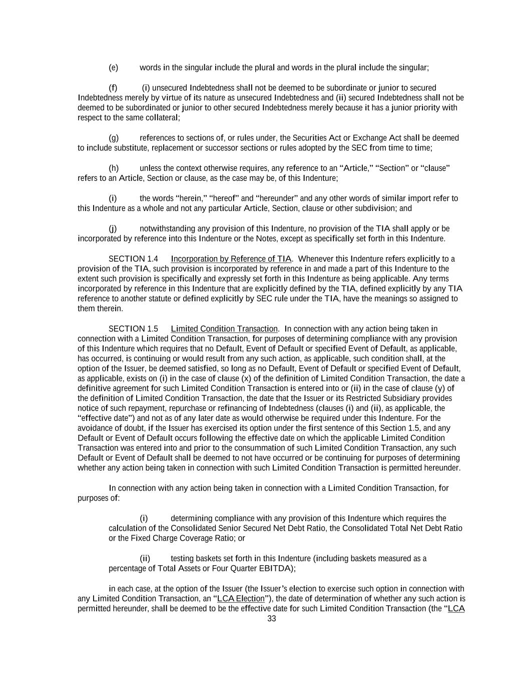 33 (e) words in the singular include the plural and words in the plural include the singular; (f) (i) unsecured Indebtedness shall not be deemed to be subordinate or junior to secured Indebtedness merely by virtue of its nature as unsecured Indebtedness and (ii) secured Indebtedness shall not be deemed to be subordinated or junior to other secured Indebtedness merely because it has a junior priority with respect to the same collateral; (g) references to sections of, or rules under, the Securities Act or Exchange Act shall be deemed to include substitute, replacement or successor sections or rules adopted by the SEC from time to time; (h) unless the context otherwise requires, any reference to an “Article,” “Section” or “clause” refers to an Article, Section or clause, as the case may be, of this Indenture; (i) the words “herein,” “hereof” and “hereunder” and any other words of similar import refer to this Indenture as a whole and not any particular Article, Section, clause or other subdivision; and (j) notwithstanding any provision of this Indenture, no provision of the TIA shall apply or be incorporated by reference into this Indenture or the Notes, except as specifically set forth in this Indenture. SECTION 1.4 Incorporation by Reference of TIA. Whenever this Indenture refers explicitly to a provision of the TIA, such provision is incorporated by reference in and made a part of this Indenture to the extent such provision is specifically and expressly set forth in this Indenture as being applicable. Any terms incorporated by reference in this Indenture that are explicitly defined by the TIA, defined explicitly by any TIA reference to another statute or defined explicitly by SEC rule under the TIA, have the meanings so assigned to them therein. SECTION 1.5 Limited Condition Transaction. In connection with any action being taken in connection with a Limited Condition Transaction, for purposes of determining compliance with any provision of this Indenture which requires that no Default, Event of Default or specified Event of Default, as applicable, has occurred, is continuing or would result from any such action, as applicable, such condition shall, at the option of the Issuer, be deemed satisfied, so long as no Default, Event of Default or specified Event of Default, as applicable, exists on (i) in the case of clause (x) of the definition of Limited Condition Transaction, the date a definitive agreement for such Limited Condition Transaction is entered into or (ii) in the case of clause (y) of the definition of Limited Condition Transaction, the date that the Issuer or its Restricted Subsidiary provides notice of such repayment, repurchase or refinancing of Indebtedness (clauses (i) and (ii), as applicable, the “effective date”) and not as of any later date as would otherwise be required under this Indenture. For the avoidance of doubt, if the Issuer has exercised its option under the first sentence of this Section 1.5, and any Default or Event of Default occurs following the effective date on which the applicable Limited Condition Transaction was entered into and prior to the consummation of such Limited Condition Transaction, any such Default or Event of Default shall be deemed to not have occurred or be continuing for purposes of determining whether any action being taken in connection with such Limited Condition Transaction is permitted hereunder. In connection with any action being taken in connection with a Limited Condition Transaction, for purposes of: (i) determining compliance with any provision of this Indenture which requires the calculation of the Consolidated Senior Secured Net Debt Ratio, the Consolidated Total Net Debt Ratio or the Fixed Charge Coverage Ratio; or (ii) testing baskets set forth in this Indenture (including baskets measured as a percentage of Total Assets or Four Quarter EBITDA); in each case, at the option of the Issuer (the Issuer’s election to exercise such option in connection with any Limited Condition Transaction, an “LCA Election”), the date of determination of whether any such action is permitted hereunder, shall be deemed to be the effective date for such Limited Condition Transaction (the “LCA