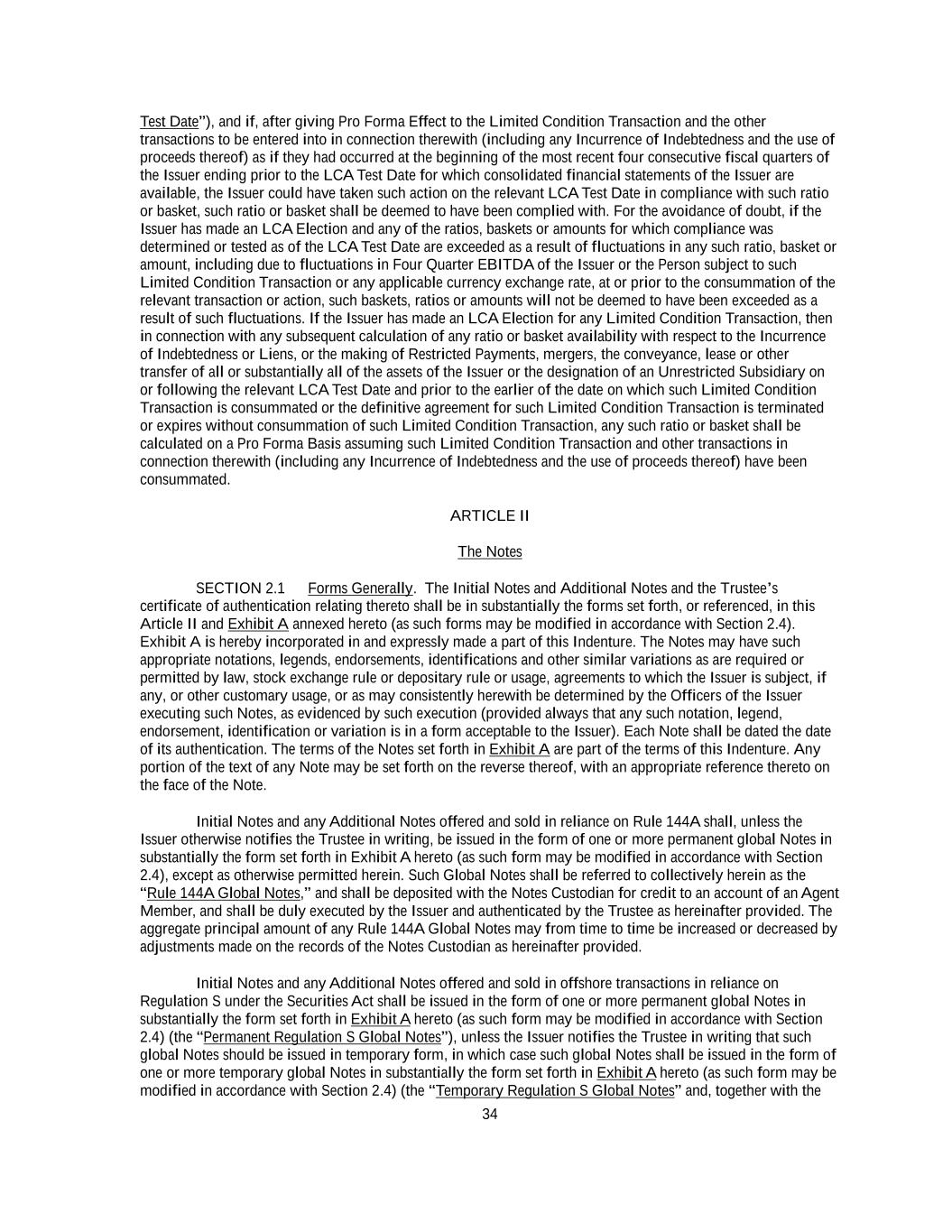 34 Test Date”), and if, after giving Pro Forma Effect to the Limited Condition Transaction and the other transactions to be entered into in connection therewith (including any Incurrence of Indebtedness and the use of proceeds thereof) as if they had occurred at the beginning of the most recent four consecutive fiscal quarters of the Issuer ending prior to the LCA Test Date for which consolidated financial statements of the Issuer are available, the Issuer could have taken such action on the relevant LCA Test Date in compliance with such ratio or basket, such ratio or basket shall be deemed to have been complied with. For the avoidance of doubt, if the Issuer has made an LCA Election and any of the ratios, baskets or amounts for which compliance was determined or tested as of the LCA Test Date are exceeded as a result of fluctuations in any such ratio, basket or amount, including due to fluctuations in Four Quarter EBITDA of the Issuer or the Person subject to such Limited Condition Transaction or any applicable currency exchange rate, at or prior to the consummation of the relevant transaction or action, such baskets, ratios or amounts will not be deemed to have been exceeded as a result of such fluctuations. If the Issuer has made an LCA Election for any Limited Condition Transaction, then in connection with any subsequent calculation of any ratio or basket availability with respect to the Incurrence of Indebtedness or Liens, or the making of Restricted Payments, mergers, the conveyance, lease or other transfer of all or substantially all of the assets of the Issuer or the designation of an Unrestricted Subsidiary on or following the relevant LCA Test Date and prior to the earlier of the date on which such Limited Condition Transaction is consummated or the definitive agreement for such Limited Condition Transaction is terminated or expires without consummation of such Limited Condition Transaction, any such ratio or basket shall be calculated on a Pro Forma Basis assuming such Limited Condition Transaction and other transactions in connection therewith (including any Incurrence of Indebtedness and the use of proceeds thereof) have been consummated. ARTICLE II The Notes SECTION 2.1 Forms Generally. The Initial Notes and Additional Notes and the Trustee’s certificate of authentication relating thereto shall be in substantially the forms set forth, or referenced, in this Article II and Exhibit A annexed hereto (as such forms may be modified in accordance with Section 2.4). Exhibit A is hereby incorporated in and expressly made a part of this Indenture. The Notes may have such appropriate notations, legends, endorsements, identifications and other similar variations as are required or permitted by law, stock exchange rule or depositary rule or usage, agreements to which the Issuer is subject, if any, or other customary usage, or as may consistently herewith be determined by the Officers of the Issuer executing such Notes, as evidenced by such execution (provided always that any such notation, legend, endorsement, identification or variation is in a form acceptable to the Issuer). Each Note shall be dated the date of its authentication. The terms of the Notes set forth in Exhibit A are part of the terms of this Indenture. Any portion of the text of any Note may be set forth on the reverse thereof, with an appropriate reference thereto on the face of the Note. Initial Notes and any Additional Notes offered and sold in reliance on Rule 144A shall, unless the Issuer otherwise notifies the Trustee in writing, be issued in the form of one or more permanent global Notes in substantially the form set forth in Exhibit A hereto (as such form may be modified in accordance with Section 2.4), except as otherwise permitted herein. Such Global Notes shall be referred to collectively herein as the “Rule 144A Global Notes,” and shall be deposited with the Notes Custodian for credit to an account of an Agent Member, and shall be duly executed by the Issuer and authenticated by the Trustee as hereinafter provided. The aggregate principal amount of any Rule 144A Global Notes may from time to time be increased or decreased by adjustments made on the records of the Notes Custodian as hereinafter provided. Initial Notes and any Additional Notes offered and sold in offshore transactions in reliance on Regulation S under the Securities Act shall be issued in the form of one or more permanent global Notes in substantially the form set forth in Exhibit A hereto (as such form may be modified in accordance with Section 2.4) (the “Permanent Regulation S Global Notes”), unless the Issuer notifies the Trustee in writing that such global Notes should be issued in temporary form, in which case such global Notes shall be issued in the form of one or more temporary global Notes in substantially the form set forth in Exhibit A hereto (as such form may be modified in accordance with Section 2.4) (the “Temporary Regulation S Global Notes” and, together with the