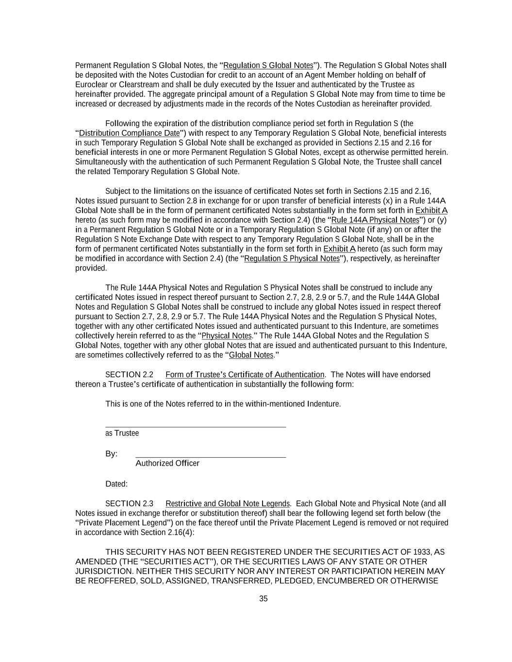 35 Permanent Regulation S Global Notes, the “Regulation S Global Notes”). The Regulation S Global Notes shall be deposited with the Notes Custodian for credit to an account of an Agent Member holding on behalf of Euroclear or Clearstream and shall be duly executed by the Issuer and authenticated by the Trustee as hereinafter provided. The aggregate principal amount of a Regulation S Global Note may from time to time be increased or decreased by adjustments made in the records of the Notes Custodian as hereinafter provided. Following the expiration of the distribution compliance period set forth in Regulation S (the “Distribution Compliance Date”) with respect to any Temporary Regulation S Global Note, beneficial interests in such Temporary Regulation S Global Note shall be exchanged as provided in Sections 2.15 and 2.16 for beneficial interests in one or more Permanent Regulation S Global Notes, except as otherwise permitted herein. Simultaneously with the authentication of such Permanent Regulation S Global Note, the Trustee shall cancel the related Temporary Regulation S Global Note. Subject to the limitations on the issuance of certificated Notes set forth in Sections 2.15 and 2.16, Notes issued pursuant to Section 2.8 in exchange for or upon transfer of beneficial interests (x) in a Rule 144A Global Note shall be in the form of permanent certificated Notes substantially in the form set forth in Exhibit A hereto (as such form may be modified in accordance with Section 2.4) (the “Rule 144A Physical Notes”) or (y) in a Permanent Regulation S Global Note or in a Temporary Regulation S Global Note (if any) on or after the Regulation S Note Exchange Date with respect to any Temporary Regulation S Global Note, shall be in the form of permanent certificated Notes substantially in the form set forth in Exhibit A hereto (as such form may be modified in accordance with Section 2.4) (the “Regulation S Physical Notes”), respectively, as hereinafter provided. The Rule 144A Physical Notes and Regulation S Physical Notes shall be construed to include any certificated Notes issued in respect thereof pursuant to Section 2.7, 2.8, 2.9 or 5.7, and the Rule 144A Global Notes and Regulation S Global Notes shall be construed to include any global Notes issued in respect thereof pursuant to Section 2.7, 2.8, 2.9 or 5.7. The Rule 144A Physical Notes and the Regulation S Physical Notes, together with any other certificated Notes issued and authenticated pursuant to this Indenture, are sometimes collectively herein referred to as the “Physical Notes.” The Rule 144A Global Notes and the Regulation S Global Notes, together with any other global Notes that are issued and authenticated pursuant to this Indenture, are sometimes collectively referred to as the “Global Notes.” SECTION 2.2 Form of Trustee’s Certificate of Authentication. The Notes will have endorsed thereon a Trustee’s certificate of authentication in substantially the following form: This is one of the Notes referred to in the within-mentioned Indenture. as Trustee By: Authorized Officer Dated: SECTION 2.3 Restrictive and Global Note Legends. Each Global Note and Physical Note (and all Notes issued in exchange therefor or substitution thereof) shall bear the following legend set forth below (the “Private Placement Legend”) on the face thereof until the Private Placement Legend is removed or not required in accordance with Section 2.16(4): THIS SECURITY HAS NOT BEEN REGISTERED UNDER THE SECURITIES ACT OF 1933, AS AMENDED (THE “SECURITIES ACT”), OR THE SECURITIES LAWS OF ANY STATE OR OTHER JURISDICTION. NEITHER THIS SECURITY NOR ANY INTEREST OR PARTICIPATION HEREIN MAY BE REOFFERED, SOLD, ASSIGNED, TRANSFERRED, PLEDGED, ENCUMBERED OR OTHERWISE