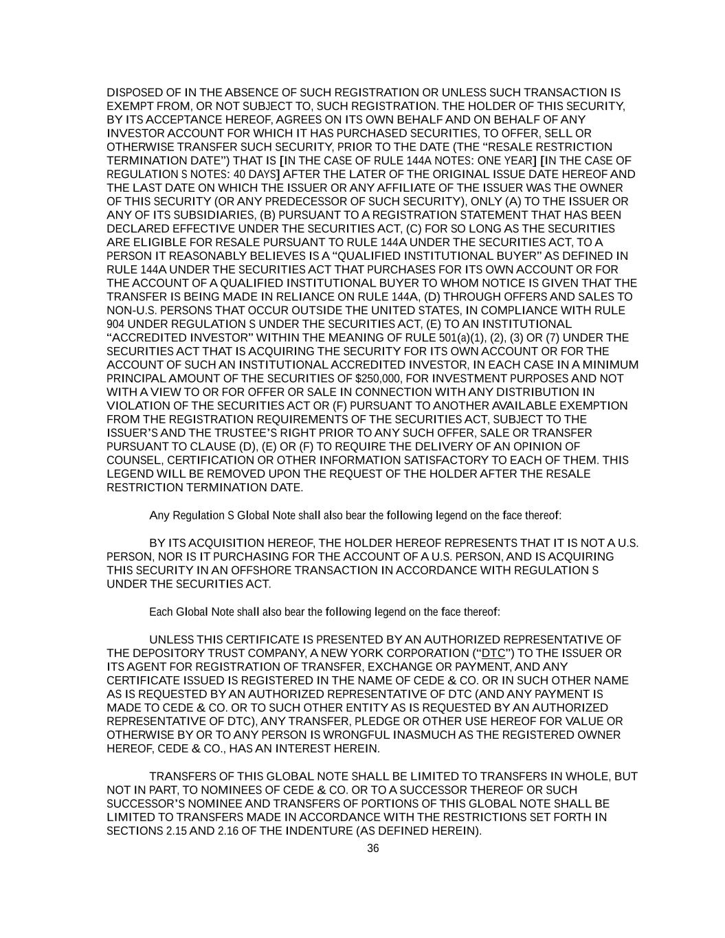36 DISPOSED OF IN THE ABSENCE OF SUCH REGISTRATION OR UNLESS SUCH TRANSACTION IS EXEMPT FROM, OR NOT SUBJECT TO, SUCH REGISTRATION. THE HOLDER OF THIS SECURITY, BY ITS ACCEPTANCE HEREOF, AGREES ON ITS OWN BEHALF AND ON BEHALF OF ANY INVESTOR ACCOUNT FOR WHICH IT HAS PURCHASED SECURITIES, TO OFFER, SELL OR OTHERWISE TRANSFER SUCH SECURITY, PRIOR TO THE DATE (THE “RESALE RESTRICTION TERMINATION DATE”) THAT IS [IN THE CASE OF RULE 144A NOTES: ONE YEAR] [IN THE CASE OF REGULATION S NOTES: 40 DAYS] AFTER THE LATER OF THE ORIGINAL ISSUE DATE HEREOF AND THE LAST DATE ON WHICH THE ISSUER OR ANY AFFILIATE OF THE ISSUER WAS THE OWNER OF THIS SECURITY (OR ANY PREDECESSOR OF SUCH SECURITY), ONLY (A) TO THE ISSUER OR ANY OF ITS SUBSIDIARIES, (B) PURSUANT TO A REGISTRATION STATEMENT THAT HAS BEEN DECLARED EFFECTIVE UNDER THE SECURITIES ACT, (C) FOR SO LONG AS THE SECURITIES ARE ELIGIBLE FOR RESALE PURSUANT TO RULE 144A UNDER THE SECURITIES ACT, TO A PERSON IT REASONABLY BELIEVES IS A “QUALIFIED INSTITUTIONAL BUYER” AS DEFINED IN RULE 144A UNDER THE SECURITIES ACT THAT PURCHASES FOR ITS OWN ACCOUNT OR FOR THE ACCOUNT OF A QUALIFIED INSTITUTIONAL BUYER TO WHOM NOTICE IS GIVEN THAT THE TRANSFER IS BEING MADE IN RELIANCE ON RULE 144A, (D) THROUGH OFFERS AND SALES TO NON-U.S. PERSONS THAT OCCUR OUTSIDE THE UNITED STATES, IN COMPLIANCE WITH RULE 904 UNDER REGULATION S UNDER THE SECURITIES ACT, (E) TO AN INSTITUTIONAL “ACCREDITED INVESTOR” WITHIN THE MEANING OF RULE 501(a)(1), (2), (3) OR (7) UNDER THE SECURITIES ACT THAT IS ACQUIRING THE SECURITY FOR ITS OWN ACCOUNT OR FOR THE ACCOUNT OF SUCH AN INSTITUTIONAL ACCREDITED INVESTOR, IN EACH CASE IN A MINIMUM PRINCIPAL AMOUNT OF THE SECURITIES OF $250,000, FOR INVESTMENT PURPOSES AND NOT WITH A VIEW TO OR FOR OFFER OR SALE IN CONNECTION WITH ANY DISTRIBUTION IN VIOLATION OF THE SECURITIES ACT OR (F) PURSUANT TO ANOTHER AVAILABLE EXEMPTION FROM THE REGISTRATION REQUIREMENTS OF THE SECURITIES ACT, SUBJECT TO THE ISSUER’S AND THE TRUSTEE’S RIGHT PRIOR TO ANY SUCH OFFER, SALE OR TRANSFER PURSUANT TO CLAUSE (D), (E) OR (F) TO REQUIRE THE DELIVERY OF AN OPINION OF COUNSEL, CERTIFICATION OR OTHER INFORMATION SATISFACTORY TO EACH OF THEM. THIS LEGEND WILL BE REMOVED UPON THE REQUEST OF THE HOLDER AFTER THE RESALE RESTRICTION TERMINATION DATE. Any Regulation S Global Note shall also bear the following legend on the face thereof: BY ITS ACQUISITION HEREOF, THE HOLDER HEREOF REPRESENTS THAT IT IS NOT A U.S. PERSON, NOR IS IT PURCHASING FOR THE ACCOUNT OF A U.S. PERSON, AND IS ACQUIRING THIS SECURITY IN AN OFFSHORE TRANSACTION IN ACCORDANCE WITH REGULATION S UNDER THE SECURITIES ACT. Each Global Note shall also bear the following legend on the face thereof: UNLESS THIS CERTIFICATE IS PRESENTED BY AN AUTHORIZED REPRESENTATIVE OF THE DEPOSITORY TRUST COMPANY, A NEW YORK CORPORATION (“DTC”) TO THE ISSUER OR ITS AGENT FOR REGISTRATION OF TRANSFER, EXCHANGE OR PAYMENT, AND ANY CERTIFICATE ISSUED IS REGISTERED IN THE NAME OF CEDE & CO. OR IN SUCH OTHER NAME AS IS REQUESTED BY AN AUTHORIZED REPRESENTATIVE OF DTC (AND ANY PAYMENT IS MADE TO CEDE & CO. OR TO SUCH OTHER ENTITY AS IS REQUESTED BY AN AUTHORIZED REPRESENTATIVE OF DTC), ANY TRANSFER, PLEDGE OR OTHER USE HEREOF FOR VALUE OR OTHERWISE BY OR TO ANY PERSON IS WRONGFUL INASMUCH AS THE REGISTERED OWNER HEREOF, CEDE & CO., HAS AN INTEREST HEREIN. TRANSFERS OF THIS GLOBAL NOTE SHALL BE LIMITED TO TRANSFERS IN WHOLE, BUT NOT IN PART, TO NOMINEES OF CEDE & CO. OR TO A SUCCESSOR THEREOF OR SUCH SUCCESSOR’S NOMINEE AND TRANSFERS OF PORTIONS OF THIS GLOBAL NOTE SHALL BE LIMITED TO TRANSFERS MADE IN ACCORDANCE WITH THE RESTRICTIONS SET FORTH IN SECTIONS 2.15 AND 2.16 OF THE INDENTURE (AS DEFINED HEREIN).