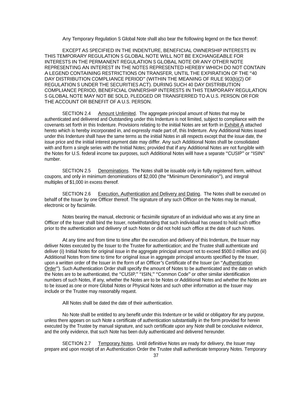 37 Any Temporary Regulation S Global Note shall also bear the following legend on the face thereof: EXCEPT AS SPECIFIED IN THE INDENTURE, BENEFICIAL OWNERSHIP INTERESTS IN THIS TEMPORARY REGULATION S GLOBAL NOTE WILL NOT BE EXCHANGEABLE FOR INTERESTS IN THE PERMANENT REGULATION S GLOBAL NOTE OR ANY OTHER NOTE REPRESENTING AN INTEREST IN THE NOTES REPRESENTED HEREBY WHICH DO NOT CONTAIN A LEGEND CONTAINING RESTRICTIONS ON TRANSFER, UNTIL THE EXPIRATION OF THE “40 DAY DISTRIBUTION COMPLIANCE PERIOD” (WITHIN THE MEANING OF RULE 903(b)(2) OF REGULATION S UNDER THE SECURITIES ACT). DURING SUCH 40 DAY DISTRIBUTION COMPLIANCE PERIOD, BENEFICIAL OWNERSHIP INTERESTS IN THIS TEMPORARY REGULATION S GLOBAL NOTE MAY NOT BE SOLD, PLEDGED OR TRANSFERRED TO A U.S. PERSON OR FOR THE ACCOUNT OR BENEFIT OF A U.S. PERSON. SECTION 2.4 Amount Unlimited. The aggregate principal amount of Notes that may be authenticated and delivered and Outstanding under this Indenture is not limited, subject to compliance with the covenants set forth in this Indenture. Provisions relating to the initial Notes are set forth in Exhibit A attached hereto which is hereby incorporated in, and expressly made part of, this Indenture. Any Additional Notes issued under this Indenture shall have the same terms as the initial Notes in all respects except that the issue date, the issue price and the initial interest payment date may differ. Any such Additional Notes shall be consolidated with and form a single series with the Initial Notes; provided that if any Additional Notes are not fungible with the Notes for U.S. federal income tax purposes, such Additional Notes will have a separate “CUSIP” or “ISIN” number. SECTION 2.5 Denominations. The Notes shall be issuable only in fully registered form, without coupons, and only in minimum denominations of $2,000 (the “Minimum Denomination”), and integral multiples of $1,000 in excess thereof. SECTION 2.6 Execution, Authentication and Delivery and Dating. The Notes shall be executed on behalf of the Issuer by one Officer thereof. The signature of any such Officer on the Notes may be manual, electronic or by facsimile. Notes bearing the manual, electronic or facsimile signature of an individual who was at any time an Officer of the Issuer shall bind the Issuer, notwithstanding that such individual has ceased to hold such office prior to the authentication and delivery of such Notes or did not hold such office at the date of such Notes. At any time and from time to time after the execution and delivery of this Indenture, the Issuer may deliver Notes executed by the Issuer to the Trustee for authentication; and the Trustee shall authenticate and deliver (i) Initial Notes for original issue in the aggregate principal amount not to exceed $500.0 million and (ii) Additional Notes from time to time for original issue in aggregate principal amounts specified by the Issuer, upon a written order of the Issuer in the form of an Officer’s Certificate of the Issuer (an “Authentication Order”). Such Authentication Order shall specify the amount of Notes to be authenticated and the date on which the Notes are to be authenticated, the “CUSIP,” “ISIN,” “Common Code” or other similar identification numbers of such Notes, if any, whether the Notes are to be Notes or Additional Notes and whether the Notes are to be issued as one or more Global Notes or Physical Notes and such other information as the Issuer may include or the Trustee may reasonably request. All Notes shall be dated the date of their authentication. No Note shall be entitled to any benefit under this Indenture or be valid or obligatory for any purpose, unless there appears on such Note a certificate of authentication substantially in the form provided for herein executed by the Trustee by manual signature, and such certificate upon any Note shall be conclusive evidence, and the only evidence, that such Note has been duly authenticated and delivered hereunder. SECTION 2.7 Temporary Notes. Until definitive Notes are ready for delivery, the Issuer may prepare and upon receipt of an Authentication Order the Trustee shall authenticate temporary Notes. Temporary