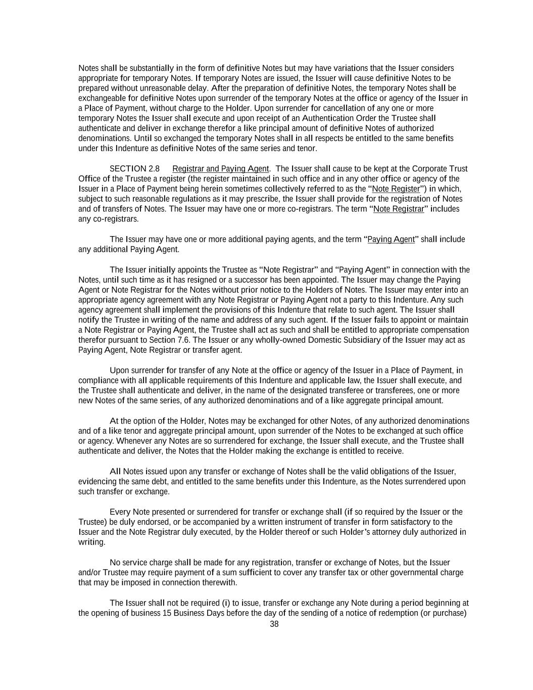 38 Notes shall be substantially in the form of definitive Notes but may have variations that the Issuer considers appropriate for temporary Notes. If temporary Notes are issued, the Issuer will cause definitive Notes to be prepared without unreasonable delay. After the preparation of definitive Notes, the temporary Notes shall be exchangeable for definitive Notes upon surrender of the temporary Notes at the office or agency of the Issuer in a Place of Payment, without charge to the Holder. Upon surrender for cancellation of any one or more temporary Notes the Issuer shall execute and upon receipt of an Authentication Order the Trustee shall authenticate and deliver in exchange therefor a like principal amount of definitive Notes of authorized denominations. Until so exchanged the temporary Notes shall in all respects be entitled to the same benefits under this Indenture as definitive Notes of the same series and tenor. SECTION 2.8 Registrar and Paying Agent. The Issuer shall cause to be kept at the Corporate Trust Office of the Trustee a register (the register maintained in such office and in any other office or agency of the Issuer in a Place of Payment being herein sometimes collectively referred to as the “Note Register”) in which, subject to such reasonable regulations as it may prescribe, the Issuer shall provide for the registration of Notes and of transfers of Notes. The Issuer may have one or more co-registrars. The term “Note Registrar” includes any co-registrars. The Issuer may have one or more additional paying agents, and the term “Paying Agent” shall include any additional Paying Agent. The Issuer initially appoints the Trustee as “Note Registrar” and “Paying Agent” in connection with the Notes, until such time as it has resigned or a successor has been appointed. The Issuer may change the Paying Agent or Note Registrar for the Notes without prior notice to the Holders of Notes. The Issuer may enter into an appropriate agency agreement with any Note Registrar or Paying Agent not a party to this Indenture. Any such agency agreement shall implement the provisions of this Indenture that relate to such agent. The Issuer shall notify the Trustee in writing of the name and address of any such agent. If the Issuer fails to appoint or maintain a Note Registrar or Paying Agent, the Trustee shall act as such and shall be entitled to appropriate compensation therefor pursuant to Section 7.6. The Issuer or any wholly-owned Domestic Subsidiary of the Issuer may act as Paying Agent, Note Registrar or transfer agent. Upon surrender for transfer of any Note at the office or agency of the Issuer in a Place of Payment, in compliance with all applicable requirements of this Indenture and applicable law, the Issuer shall execute, and the Trustee shall authenticate and deliver, in the name of the designated transferee or transferees, one or more new Notes of the same series, of any authorized denominations and of a like aggregate principal amount. At the option of the Holder, Notes may be exchanged for other Notes, of any authorized denominations and of a like tenor and aggregate principal amount, upon surrender of the Notes to be exchanged at such office or agency. Whenever any Notes are so surrendered for exchange, the Issuer shall execute, and the Trustee shall authenticate and deliver, the Notes that the Holder making the exchange is entitled to receive. All Notes issued upon any transfer or exchange of Notes shall be the valid obligations of the Issuer, evidencing the same debt, and entitled to the same benefits under this Indenture, as the Notes surrendered upon such transfer or exchange. Every Note presented or surrendered for transfer or exchange shall (if so required by the Issuer or the Trustee) be duly endorsed, or be accompanied by a written instrument of transfer in form satisfactory to the Issuer and the Note Registrar duly executed, by the Holder thereof or such Holder’s attorney duly authorized in writing. No service charge shall be made for any registration, transfer or exchange of Notes, but the Issuer and/or Trustee may require payment of a sum sufficient to cover any transfer tax or other governmental charge that may be imposed in connection therewith. The Issuer shall not be required (i) to issue, transfer or exchange any Note during a period beginning at the opening of business 15 Business Days before the day of the sending of a notice of redemption (or purchase)