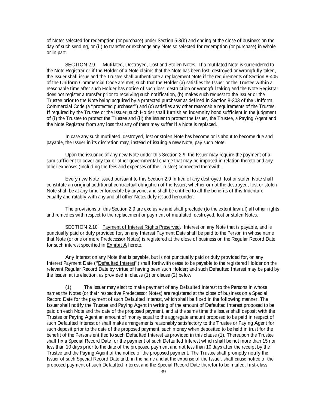 39 of Notes selected for redemption (or purchase) under Section 5.3(b) and ending at the close of business on the day of such sending, or (ii) to transfer or exchange any Note so selected for redemption (or purchase) in whole or in part. SECTION 2.9 Mutilated, Destroyed, Lost and Stolen Notes. If a mutilated Note is surrendered to the Note Registrar or if the Holder of a Note claims that the Note has been lost, destroyed or wrongfully taken, the Issuer shall issue and the Trustee shall authenticate a replacement Note if the requirements of Section 8-405 of the Uniform Commercial Code are met, such that the Holder (a) satisfies the Issuer or the Trustee within a reasonable time after such Holder has notice of such loss, destruction or wrongful taking and the Note Registrar does not register a transfer prior to receiving such notification, (b) makes such request to the Issuer or the Trustee prior to the Note being acquired by a protected purchaser as defined in Section 8-303 of the Uniform Commercial Code (a “protected purchaser”) and (c) satisfies any other reasonable requirements of the Trustee. If required by the Trustee or the Issuer, such Holder shall furnish an indemnity bond sufficient in the judgment of (i) the Trustee to protect the Trustee and (ii) the Issuer to protect the Issuer, the Trustee, a Paying Agent and the Note Registrar from any loss that any of them may suffer if a Note is replaced. In case any such mutilated, destroyed, lost or stolen Note has become or is about to become due and payable, the Issuer in its discretion may, instead of issuing a new Note, pay such Note. Upon the issuance of any new Note under this Section 2.9, the Issuer may require the payment of a sum sufficient to cover any tax or other governmental charge that may be imposed in relation thereto and any other expenses (including the fees and expenses of the Trustee) connected therewith. Every new Note issued pursuant to this Section 2.9 in lieu of any destroyed, lost or stolen Note shall constitute an original additional contractual obligation of the Issuer, whether or not the destroyed, lost or stolen Note shall be at any time enforceable by anyone, and shall be entitled to all the benefits of this Indenture equally and ratably with any and all other Notes duly issued hereunder. The provisions of this Section 2.9 are exclusive and shall preclude (to the extent lawful) all other rights and remedies with respect to the replacement or payment of mutilated, destroyed, lost or stolen Notes. SECTION 2.10 Payment of Interest Rights Preserved. Interest on any Note that is payable, and is punctually paid or duly provided for, on any Interest Payment Date shall be paid to the Person in whose name that Note (or one or more Predecessor Notes) is registered at the close of business on the Regular Record Date for such interest specified in Exhibit A hereto. Any interest on any Note that is payable, but is not punctually paid or duly provided for, on any Interest Payment Date (“Defaulted Interest”) shall forthwith cease to be payable to the registered Holder on the relevant Regular Record Date by virtue of having been such Holder; and such Defaulted Interest may be paid by the Issuer, at its election, as provided in clause (1) or clause (2) below: (1) The Issuer may elect to make payment of any Defaulted Interest to the Persons in whose names the Notes (or their respective Predecessor Notes) are registered at the close of business on a Special Record Date for the payment of such Defaulted Interest, which shall be fixed in the following manner. The Issuer shall notify the Trustee and Paying Agent in writing of the amount of Defaulted Interest proposed to be paid on each Note and the date of the proposed payment, and at the same time the Issuer shall deposit with the Trustee or Paying Agent an amount of money equal to the aggregate amount proposed to be paid in respect of such Defaulted Interest or shall make arrangements reasonably satisfactory to the Trustee or Paying Agent for such deposit prior to the date of the proposed payment, such money when deposited to be held in trust for the benefit of the Persons entitled to such Defaulted Interest as provided in this clause (1). Thereupon the Trustee shall fix a Special Record Date for the payment of such Defaulted Interest which shall be not more than 15 nor less than 10 days prior to the date of the proposed payment and not less than 10 days after the receipt by the Trustee and the Paying Agent of the notice of the proposed payment. The Trustee shall promptly notify the Issuer of such Special Record Date and, in the name and at the expense of the Issuer, shall cause notice of the proposed payment of such Defaulted Interest and the Special Record Date therefor to be mailed, first-class