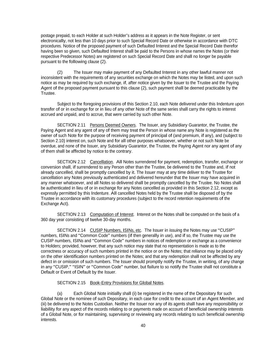 40 postage prepaid, to each Holder at such Holder’s address as it appears in the Note Register, or sent electronically, not less than 10 days prior to such Special Record Date or otherwise in accordance with DTC procedures. Notice of the proposed payment of such Defaulted Interest and the Special Record Date therefor having been so given, such Defaulted Interest shall be paid to the Persons in whose names the Notes (or their respective Predecessor Notes) are registered on such Special Record Date and shall no longer be payable pursuant to the following clause (2). (2) The Issuer may make payment of any Defaulted Interest in any other lawful manner not inconsistent with the requirements of any securities exchange on which the Notes may be listed, and upon such notice as may be required by such exchange, if, after notice given by the Issuer to the Trustee and the Paying Agent of the proposed payment pursuant to this clause (2), such payment shall be deemed practicable by the Trustee. Subject to the foregoing provisions of this Section 2.10, each Note delivered under this Indenture upon transfer of or in exchange for or in lieu of any other Note of the same series shall carry the rights to interest accrued and unpaid, and to accrue, that were carried by such other Note. SECTION 2.11 Persons Deemed Owners. The Issuer, any Subsidiary Guarantor, the Trustee, the Paying Agent and any agent of any of them may treat the Person in whose name any Note is registered as the owner of such Note for the purpose of receiving payment of principal of (and premium, if any), and (subject to Section 2.10) interest on, such Note and for all other purposes whatsoever, whether or not such Note be overdue, and none of the Issuer, any Subsidiary Guarantor, the Trustee, the Paying Agent nor any agent of any of them shall be affected by notice to the contrary. SECTION 2.12 Cancellation. All Notes surrendered for payment, redemption, transfer, exchange or conversion shall, if surrendered to any Person other than the Trustee, be delivered to the Trustee and, if not already cancelled, shall be promptly cancelled by it. The Issuer may at any time deliver to the Trustee for cancellation any Notes previously authenticated and delivered hereunder that the Issuer may have acquired in any manner whatsoever, and all Notes so delivered shall be promptly cancelled by the Trustee. No Notes shall be authenticated in lieu of or in exchange for any Notes cancelled as provided in this Section 2.12, except as expressly permitted by this Indenture. All cancelled Notes held by the Trustee shall be disposed of by the Trustee in accordance with its customary procedures (subject to the record retention requirements of the Exchange Act). SECTION 2.13 Computation of Interest. Interest on the Notes shall be computed on the basis of a 360 day year consisting of twelve 30-day months. SECTION 2.14 CUSIP Numbers, ISINs, etc. The Issuer in issuing the Notes may use “CUSIP” numbers, ISINs and “Common Code” numbers (if then generally in use), and if so, the Trustee may use the CUSIP numbers, ISINs and “Common Code” numbers in notices of redemption or exchange as a convenience to Holders; provided, however, that any such notice may state that no representation is made as to the correctness or accuracy of such numbers printed in the notice or on the Notes; that reliance may be placed only on the other identification numbers printed on the Notes; and that any redemption shall not be affected by any defect in or omission of such numbers. The Issuer should promptly notify the Trustee, in writing, of any change in any “CUSIP,” “ISIN” or “Common Code” number, but failure to so notify the Trustee shall not constitute a Default or Event of Default by the Issuer. SECTION 2.15 Book-Entry Provisions for Global Notes. (a) Each Global Note initially shall (i) be registered in the name of the Depositary for such Global Note or the nominee of such Depositary, in each case for credit to the account of an Agent Member, and (ii) be delivered to the Notes Custodian. Neither the Issuer nor any of its agents shall have any responsibility or liability for any aspect of the records relating to or payments made on account of beneficial ownership interests of a Global Note, or for maintaining, supervising or reviewing any records relating to such beneficial ownership interests.