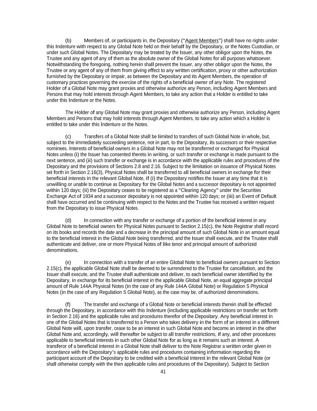 41 (b) Members of, or participants in, the Depositary (“Agent Members”) shall have no rights under this Indenture with respect to any Global Note held on their behalf by the Depositary, or the Notes Custodian, or under such Global Notes. The Depositary may be treated by the Issuer, any other obligor upon the Notes, the Trustee and any agent of any of them as the absolute owner of the Global Notes for all purposes whatsoever. Notwithstanding the foregoing, nothing herein shall prevent the Issuer, any other obligor upon the Notes, the Trustee or any agent of any of them from giving effect to any written certification, proxy or other authorization furnished by the Depositary or impair, as between the Depositary and its Agent Members, the operation of customary practices governing the exercise of the rights of a beneficial owner of any Note. The registered Holder of a Global Note may grant proxies and otherwise authorize any Person, including Agent Members and Persons that may hold interests through Agent Members, to take any action that a Holder is entitled to take under this Indenture or the Notes. The Holder of any Global Note may grant proxies and otherwise authorize any Person, including Agent Members and Persons that may hold interests through Agent Members, to take any action which a Holder is entitled to take under this Indenture or the Notes. (c) Transfers of a Global Note shall be limited to transfers of such Global Note in whole, but, subject to the immediately succeeding sentence, not in part, to the Depositary, its successors or their respective nominees. Interests of beneficial owners in a Global Note may not be transferred or exchanged for Physical Notes unless (i) the Issuer has consented thereto in writing, or such transfer or exchange is made pursuant to the next sentence, and (ii) such transfer or exchange is in accordance with the applicable rules and procedures of the Depositary and the provisions of Sections 2.8 and 2.16. Subject to the limitation on issuance of Physical Notes set forth in Section 2.16(3), Physical Notes shall be transferred to all beneficial owners in exchange for their beneficial interests in the relevant Global Note, if (i) the Depositary notifies the Issuer at any time that it is unwilling or unable to continue as Depositary for the Global Notes and a successor depositary is not appointed within 120 days; (ii) the Depositary ceases to be registered as a “Clearing Agency” under the Securities Exchange Act of 1934 and a successor depositary is not appointed within 120 days; or (iii) an Event of Default shall have occurred and be continuing with respect to the Notes and the Trustee has received a written request from the Depositary to issue Physical Notes. (d) In connection with any transfer or exchange of a portion of the beneficial interest in any Global Note to beneficial owners for Physical Notes pursuant to Section 2.15(c), the Note Registrar shall record on its books and records the date and a decrease in the principal amount of such Global Note in an amount equal to the beneficial interest in the Global Note being transferred, and the Issuer shall execute, and the Trustee shall authenticate and deliver, one or more Physical Notes of like tenor and principal amount of authorized denominations. (e) In connection with a transfer of an entire Global Note to beneficial owners pursuant to Section 2.15(c), the applicable Global Note shall be deemed to be surrendered to the Trustee for cancellation, and the Issuer shall execute, and the Trustee shall authenticate and deliver, to each beneficial owner identified by the Depositary, in exchange for its beneficial interest in the applicable Global Note, an equal aggregate principal amount of Rule 144A Physical Notes (in the case of any Rule 144A Global Note) or Regulation S Physical Notes (in the case of any Regulation S Global Note), as the case may be, of authorized denominations. (f) The transfer and exchange of a Global Note or beneficial interests therein shall be effected through the Depositary, in accordance with this Indenture (including applicable restrictions on transfer set forth in Section 2.16) and the applicable rules and procedures therefor of the Depositary. Any beneficial interest in one of the Global Notes that is transferred to a Person who takes delivery in the form of an interest in a different Global Note will, upon transfer, cease to be an interest in such Global Note and become an interest in the other Global Note and, accordingly, will thereafter be subject to all transfer restrictions, if any, and other procedures applicable to beneficial interests in such other Global Note for as long as it remains such an interest. A transferor of a beneficial interest in a Global Note shall deliver to the Note Registrar a written order given in accordance with the Depositary’s applicable rules and procedures containing information regarding the participant account of the Depositary to be credited with a beneficial interest in the relevant Global Note (or shall otherwise comply with the then applicable rules and procedures of the Depositary). Subject to Section
