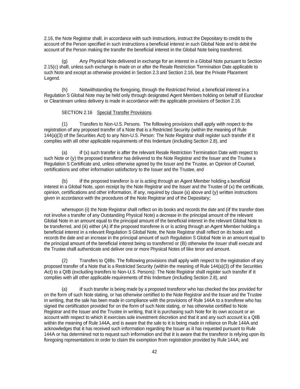 42 2.16, the Note Registrar shall, in accordance with such instructions, instruct the Depositary to credit to the account of the Person specified in such instructions a beneficial interest in such Global Note and to debit the account of the Person making the transfer the beneficial interest in the Global Note being transferred. (g) Any Physical Note delivered in exchange for an interest in a Global Note pursuant to Section 2.15(c) shall, unless such exchange is made on or after the Resale Restriction Termination Date applicable to such Note and except as otherwise provided in Section 2.3 and Section 2.16, bear the Private Placement Legend. (h) Notwithstanding the foregoing, through the Restricted Period, a beneficial interest in a Regulation S Global Note may be held only through designated Agent Members holding on behalf of Euroclear or Clearstream unless delivery is made in accordance with the applicable provisions of Section 2.16. SECTION 2.16 Special Transfer Provisions. (1) Transfers to Non-U.S. Persons. The following provisions shall apply with respect to the registration of any proposed transfer of a Note that is a Restricted Security (within the meaning of Rule 144(a)(3) of the Securities Act) to any Non-U.S. Person: The Note Registrar shall register such transfer if it complies with all other applicable requirements of this Indenture (including Section 2.8), and (a) if (x) such transfer is after the relevant Resale Restriction Termination Date with respect to such Note or (y) the proposed transferor has delivered to the Note Registrar and the Issuer and the Trustee a Regulation S Certificate and, unless otherwise agreed by the Issuer and the Trustee, an Opinion of Counsel, certifications and other information satisfactory to the Issuer and the Trustee, and (b) if the proposed transferor is or is acting through an Agent Member holding a beneficial interest in a Global Note, upon receipt by the Note Registrar and the Issuer and the Trustee of (x) the certificate, opinion, certifications and other information, if any, required by clause (a) above and (y) written instructions given in accordance with the procedures of the Note Registrar and of the Depositary; whereupon (i) the Note Registrar shall reflect on its books and records the date and (if the transfer does not involve a transfer of any Outstanding Physical Note) a decrease in the principal amount of the relevant Global Note in an amount equal to the principal amount of the beneficial interest in the relevant Global Note to be transferred, and (ii) either (A) if the proposed transferee is or is acting through an Agent Member holding a beneficial interest in a relevant Regulation S Global Note, the Note Registrar shall reflect on its books and records the date and an increase in the principal amount of such Regulation S Global Note in an amount equal to the principal amount of the beneficial interest being so transferred or (B) otherwise the Issuer shall execute and the Trustee shall authenticate and deliver one or more Physical Notes of like tenor and amount. (2) Transfers to QIBs. The following provisions shall apply with respect to the registration of any proposed transfer of a Note that is a Restricted Security (within the meaning of Rule 144(a)(3) of the Securities Act) to a QIB (excluding transfers to Non-U.S. Persons): The Note Registrar shall register such transfer if it complies with all other applicable requirements of this Indenture (including Section 2.8), and (a) if such transfer is being made by a proposed transferor who has checked the box provided for on the form of such Note stating, or has otherwise certified to the Note Registrar and the Issuer and the Trustee in writing, that the sale has been made in compliance with the provisions of Rule 144A to a transferee who has signed the certification provided for on the form of such Note stating, or has otherwise certified to Note Registrar and the Issuer and the Trustee in writing, that it is purchasing such Note for its own account or an account with respect to which it exercises sole investment discretion and that it and any such account is a QIB within the meaning of Rule 144A, and is aware that the sale to it is being made in reliance on Rule 144A and acknowledges that it has received such information regarding the Issuer as it has requested pursuant to Rule 144A or has determined not to request such information and that it is aware that the transferor is relying upon its foregoing representations in order to claim the exemption from registration provided by Rule 144A; and