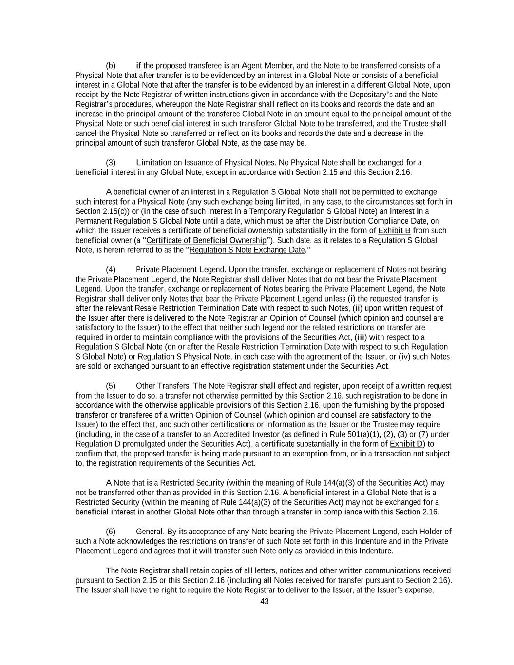 43 (b) if the proposed transferee is an Agent Member, and the Note to be transferred consists of a Physical Note that after transfer is to be evidenced by an interest in a Global Note or consists of a beneficial interest in a Global Note that after the transfer is to be evidenced by an interest in a different Global Note, upon receipt by the Note Registrar of written instructions given in accordance with the Depositary’s and the Note Registrar’s procedures, whereupon the Note Registrar shall reflect on its books and records the date and an increase in the principal amount of the transferee Global Note in an amount equal to the principal amount of the Physical Note or such beneficial interest in such transferor Global Note to be transferred, and the Trustee shall cancel the Physical Note so transferred or reflect on its books and records the date and a decrease in the principal amount of such transferor Global Note, as the case may be. (3) Limitation on Issuance of Physical Notes. No Physical Note shall be exchanged for a beneficial interest in any Global Note, except in accordance with Section 2.15 and this Section 2.16. A beneficial owner of an interest in a Regulation S Global Note shall not be permitted to exchange such interest for a Physical Note (any such exchange being limited, in any case, to the circumstances set forth in Section 2.15(c)) or (in the case of such interest in a Temporary Regulation S Global Note) an interest in a Permanent Regulation S Global Note until a date, which must be after the Distribution Compliance Date, on which the Issuer receives a certificate of beneficial ownership substantially in the form of Exhibit B from such beneficial owner (a “Certificate of Beneficial Ownership”). Such date, as it relates to a Regulation S Global Note, is herein referred to as the “Regulation S Note Exchange Date.” (4) Private Placement Legend. Upon the transfer, exchange or replacement of Notes not bearing the Private Placement Legend, the Note Registrar shall deliver Notes that do not bear the Private Placement Legend. Upon the transfer, exchange or replacement of Notes bearing the Private Placement Legend, the Note Registrar shall deliver only Notes that bear the Private Placement Legend unless (i) the requested transfer is after the relevant Resale Restriction Termination Date with respect to such Notes, (ii) upon written request of the Issuer after there is delivered to the Note Registrar an Opinion of Counsel (which opinion and counsel are satisfactory to the Issuer) to the effect that neither such legend nor the related restrictions on transfer are required in order to maintain compliance with the provisions of the Securities Act, (iii) with respect to a Regulation S Global Note (on or after the Resale Restriction Termination Date with respect to such Regulation S Global Note) or Regulation S Physical Note, in each case with the agreement of the Issuer, or (iv) such Notes are sold or exchanged pursuant to an effective registration statement under the Securities Act. (5) Other Transfers. The Note Registrar shall effect and register, upon receipt of a written request from the Issuer to do so, a transfer not otherwise permitted by this Section 2.16, such registration to be done in accordance with the otherwise applicable provisions of this Section 2.16, upon the furnishing by the proposed transferor or transferee of a written Opinion of Counsel (which opinion and counsel are satisfactory to the Issuer) to the effect that, and such other certifications or information as the Issuer or the Trustee may require (including, in the case of a transfer to an Accredited Investor (as defined in Rule 501(a)(1), (2), (3) or (7) under Regulation D promulgated under the Securities Act), a certificate substantially in the form of Exhibit D) to confirm that, the proposed transfer is being made pursuant to an exemption from, or in a transaction not subject to, the registration requirements of the Securities Act. A Note that is a Restricted Security (within the meaning of Rule 144(a)(3) of the Securities Act) may not be transferred other than as provided in this Section 2.16. A beneficial interest in a Global Note that is a Restricted Security (within the meaning of Rule 144(a)(3) of the Securities Act) may not be exchanged for a beneficial interest in another Global Note other than through a transfer in compliance with this Section 2.16. (6) General. By its acceptance of any Note bearing the Private Placement Legend, each Holder of such a Note acknowledges the restrictions on transfer of such Note set forth in this Indenture and in the Private Placement Legend and agrees that it will transfer such Note only as provided in this Indenture. The Note Registrar shall retain copies of all letters, notices and other written communications received pursuant to Section 2.15 or this Section 2.16 (including all Notes received for transfer pursuant to Section 2.16). The Issuer shall have the right to require the Note Registrar to deliver to the Issuer, at the Issuer’s expense,
