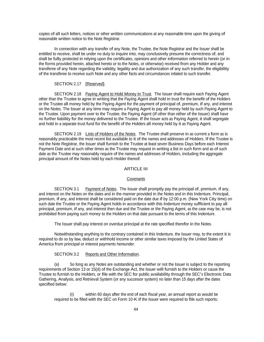 44 copies of all such letters, notices or other written communications at any reasonable time upon the giving of reasonable written notice to the Note Registrar. In connection with any transfer of any Note, the Trustee, the Note Registrar and the Issuer shall be entitled to receive, shall be under no duty to inquire into, may conclusively presume the correctness of, and shall be fully protected in relying upon the certificates, opinions and other information referred to herein (or in the forms provided herein, attached hereto or to the Notes, or otherwise) received from any Holder and any transferee of any Note regarding the validity, legality and due authorization of any such transfer, the eligibility of the transferee to receive such Note and any other facts and circumstances related to such transfer. SECTION 2.17 [Reserved]. SECTION 2.18 Paying Agent to Hold Money in Trust. The Issuer shall require each Paying Agent other than the Trustee to agree in writing that the Paying Agent shall hold in trust for the benefit of the Holders or the Trustee all money held by the Paying Agent for the payment of principal of, premium, if any, and interest on the Notes. The Issuer at any time may require a Paying Agent to pay all money held by such Paying Agent to the Trustee. Upon payment over to the Trustee, the Paying Agent (if other than either of the Issuer) shall have no further liability for the money delivered to the Trustee. If the Issuer acts as Paying Agent, it shall segregate and hold in a separate trust fund for the benefit of the Holders all money held by it as Paying Agent. SECTION 2.19 Lists of Holders of the Notes. The Trustee shall preserve in as current a form as is reasonably practicable the most recent list available to it of the names and addresses of Holders. If the Trustee is not the Note Registrar, the Issuer shall furnish to the Trustee at least seven Business Days before each Interest Payment Date and at such other times as the Trustee may request in writing a list in such form and as of such date as the Trustee may reasonably require of the names and addresses of Holders, including the aggregate principal amount of the Notes held by each Holder thereof. ARTICLE III Covenants SECTION 3.1 Payment of Notes. The Issuer shall promptly pay the principal of, premium, if any, and interest on the Notes on the dates and in the manner provided in the Notes and in this Indenture. Principal, premium, if any, and interest shall be considered paid on the date due if by 12:00 p.m. (New York City time) on such date the Trustee or the Paying Agent holds in accordance with this Indenture money sufficient to pay all principal, premium, if any, and interest then due and the Trustee or the Paying Agent, as the case may be, is not prohibited from paying such money to the Holders on that date pursuant to the terms of this Indenture. The Issuer shall pay interest on overdue principal at the rate specified therefor in the Notes. Notwithstanding anything to the contrary contained in this Indenture, the Issuer may, to the extent it is required to do so by law, deduct or withhold income or other similar taxes imposed by the United States of America from principal or interest payments hereunder. SECTION 3.2 Reports and Other Information. (a) So long as any Notes are outstanding and whether or not the Issuer is subject to the reporting requirements of Section 13 or 15(d) of the Exchange Act, the Issuer will furnish to the Holders or cause the Trustee to furnish to the Holders, or file with the SEC for public availability through the SEC’s Electronic Data Gathering, Analysis, and Retrieval System (or any successor system) no later than 15 days after the dates specified below: (i) within 60 days after the end of each fiscal year, an annual report as would be required to be filed with the SEC on Form 10-K if the Issuer were required to file such reports;
