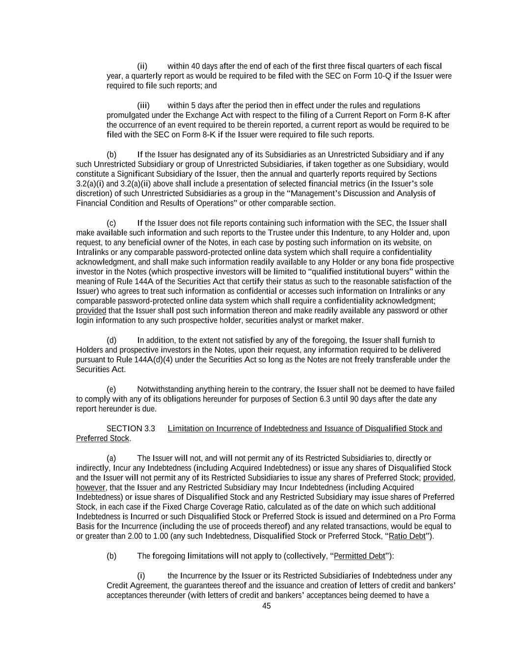 45 (ii) within 40 days after the end of each of the first three fiscal quarters of each fiscal year, a quarterly report as would be required to be filed with the SEC on Form 10-Q if the Issuer were required to file such reports; and (iii) within 5 days after the period then in effect under the rules and regulations promulgated under the Exchange Act with respect to the filing of a Current Report on Form 8-K after the occurrence of an event required to be therein reported, a current report as would be required to be filed with the SEC on Form 8-K if the Issuer were required to file such reports. (b) If the Issuer has designated any of its Subsidiaries as an Unrestricted Subsidiary and if any such Unrestricted Subsidiary or group of Unrestricted Subsidiaries, if taken together as one Subsidiary, would constitute a Significant Subsidiary of the Issuer, then the annual and quarterly reports required by Sections 3.2(a)(i) and 3.2(a)(ii) above shall include a presentation of selected financial metrics (in the Issuer’s sole discretion) of such Unrestricted Subsidiaries as a group in the “Management’s Discussion and Analysis of Financial Condition and Results of Operations” or other comparable section. (c) If the Issuer does not file reports containing such information with the SEC, the Issuer shall make available such information and such reports to the Trustee under this Indenture, to any Holder and, upon request, to any beneficial owner of the Notes, in each case by posting such information on its website, on Intralinks or any comparable password-protected online data system which shall require a confidentiality acknowledgment, and shall make such information readily available to any Holder or any bona fide prospective investor in the Notes (which prospective investors will be limited to “qualified institutional buyers” within the meaning of Rule 144A of the Securities Act that certify their status as such to the reasonable satisfaction of the Issuer) who agrees to treat such information as confidential or accesses such information on Intralinks or any comparable password-protected online data system which shall require a confidentiality acknowledgment; provided that the Issuer shall post such information thereon and make readily available any password or other login information to any such prospective holder, securities analyst or market maker. (d) In addition, to the extent not satisfied by any of the foregoing, the Issuer shall furnish to Holders and prospective investors in the Notes, upon their request, any information required to be delivered pursuant to Rule 144A(d)(4) under the Securities Act so long as the Notes are not freely transferable under the Securities Act. (e) Notwithstanding anything herein to the contrary, the Issuer shall not be deemed to have failed to comply with any of its obligations hereunder for purposes of Section 6.3 until 90 days after the date any report hereunder is due. SECTION 3.3 Limitation on Incurrence of Indebtedness and Issuance of Disqualified Stock and Preferred Stock. (a) The Issuer will not, and will not permit any of its Restricted Subsidiaries to, directly or indirectly, Incur any Indebtedness (including Acquired Indebtedness) or issue any shares of Disqualified Stock and the Issuer will not permit any of its Restricted Subsidiaries to issue any shares of Preferred Stock; provided, however, that the Issuer and any Restricted Subsidiary may Incur Indebtedness (including Acquired Indebtedness) or issue shares of Disqualified Stock and any Restricted Subsidiary may issue shares of Preferred Stock, in each case if the Fixed Charge Coverage Ratio, calculated as of the date on which such additional Indebtedness is Incurred or such Disqualified Stock or Preferred Stock is issued and determined on a Pro Forma Basis for the Incurrence (including the use of proceeds thereof) and any related transactions, would be equal to or greater than 2.00 to 1.00 (any such Indebtedness, Disqualified Stock or Preferred Stock, “Ratio Debt”). (b) The foregoing limitations will not apply to (collectively, “Permitted Debt”): (i) the Incurrence by the Issuer or its Restricted Subsidiaries of Indebtedness under any Credit Agreement, the guarantees thereof and the issuance and creation of letters of credit and bankers’ acceptances thereunder (with letters of credit and bankers’ acceptances being deemed to have a
