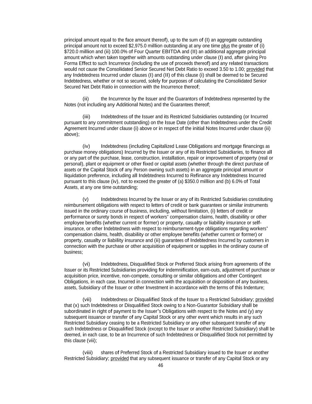 46 principal amount equal to the face amount thereof), up to the sum of (I) an aggregate outstanding principal amount not to exceed $2,975.0 million outstanding at any one time plus the greater of (i) $720.0 million and (ii) 100.0% of Four Quarter EBITDA and (II) an additional aggregate principal amount which when taken together with amounts outstanding under clause (I) and, after giving Pro Forma Effect to such Incurrence (including the use of proceeds thereof) and any related transactions would not cause the Consolidated Senior Secured Net Debt Ratio to exceed 3.50 to 1.00; provided that any Indebtedness Incurred under clauses (I) and (II) of this clause (i) shall be deemed to be Secured Indebtedness, whether or not so secured, solely for purposes of calculating the Consolidated Senior Secured Net Debt Ratio in connection with the Incurrence thereof; (ii) the Incurrence by the Issuer and the Guarantors of Indebtedness represented by the Notes (not including any Additional Notes) and the Guarantees thereof; (iii) Indebtedness of the Issuer and its Restricted Subsidiaries outstanding (or Incurred pursuant to any commitment outstanding) on the Issue Date (other than Indebtedness under the Credit Agreement Incurred under clause (i) above or in respect of the initial Notes Incurred under clause (ii) above); (iv) Indebtedness (including Capitalized Lease Obligations and mortgage financings as purchase money obligations) Incurred by the Issuer or any of its Restricted Subsidiaries, to finance all or any part of the purchase, lease, construction, installation, repair or improvement of property (real or personal), plant or equipment or other fixed or capital assets (whether through the direct purchase of assets or the Capital Stock of any Person owning such assets) in an aggregate principal amount or liquidation preference, including all Indebtedness Incurred to Refinance any Indebtedness Incurred pursuant to this clause (iv), not to exceed the greater of (a) $350.0 million and (b) 6.0% of Total Assets, at any one time outstanding; (v) Indebtedness Incurred by the Issuer or any of its Restricted Subsidiaries constituting reimbursement obligations with respect to letters of credit or bank guarantees or similar instruments issued in the ordinary course of business, including, without limitation, (i) letters of credit or performance or surety bonds in respect of workers’ compensation claims, health, disability or other employee benefits (whether current or former) or property, casualty or liability insurance or self- insurance, or other Indebtedness with respect to reimbursement-type obligations regarding workers’ compensation claims, health, disability or other employee benefits (whether current or former) or property, casualty or liability insurance and (ii) guarantees of Indebtedness Incurred by customers in connection with the purchase or other acquisition of equipment or supplies in the ordinary course of business; (vi) Indebtedness, Disqualified Stock or Preferred Stock arising from agreements of the Issuer or its Restricted Subsidiaries providing for indemnification, earn-outs, adjustment of purchase or acquisition price, incentive, non-compete, consulting or similar obligations and other Contingent Obligations, in each case, Incurred in connection with the acquisition or disposition of any business, assets, Subsidiary of the Issuer or other Investment in accordance with the terms of this Indenture; (vii) Indebtedness or Disqualified Stock of the Issuer to a Restricted Subsidiary; provided that (x) such Indebtedness or Disqualified Stock owing to a Non-Guarantor Subsidiary shall be subordinated in right of payment to the Issuer’s Obligations with respect to the Notes and (y) any subsequent issuance or transfer of any Capital Stock or any other event which results in any such Restricted Subsidiary ceasing to be a Restricted Subsidiary or any other subsequent transfer of any such Indebtedness or Disqualified Stock (except to the Issuer or another Restricted Subsidiary) shall be deemed, in each case, to be an Incurrence of such Indebtedness or Disqualified Stock not permitted by this clause (vii); (viii) shares of Preferred Stock of a Restricted Subsidiary issued to the Issuer or another Restricted Subsidiary; provided that any subsequent issuance or transfer of any Capital Stock or any