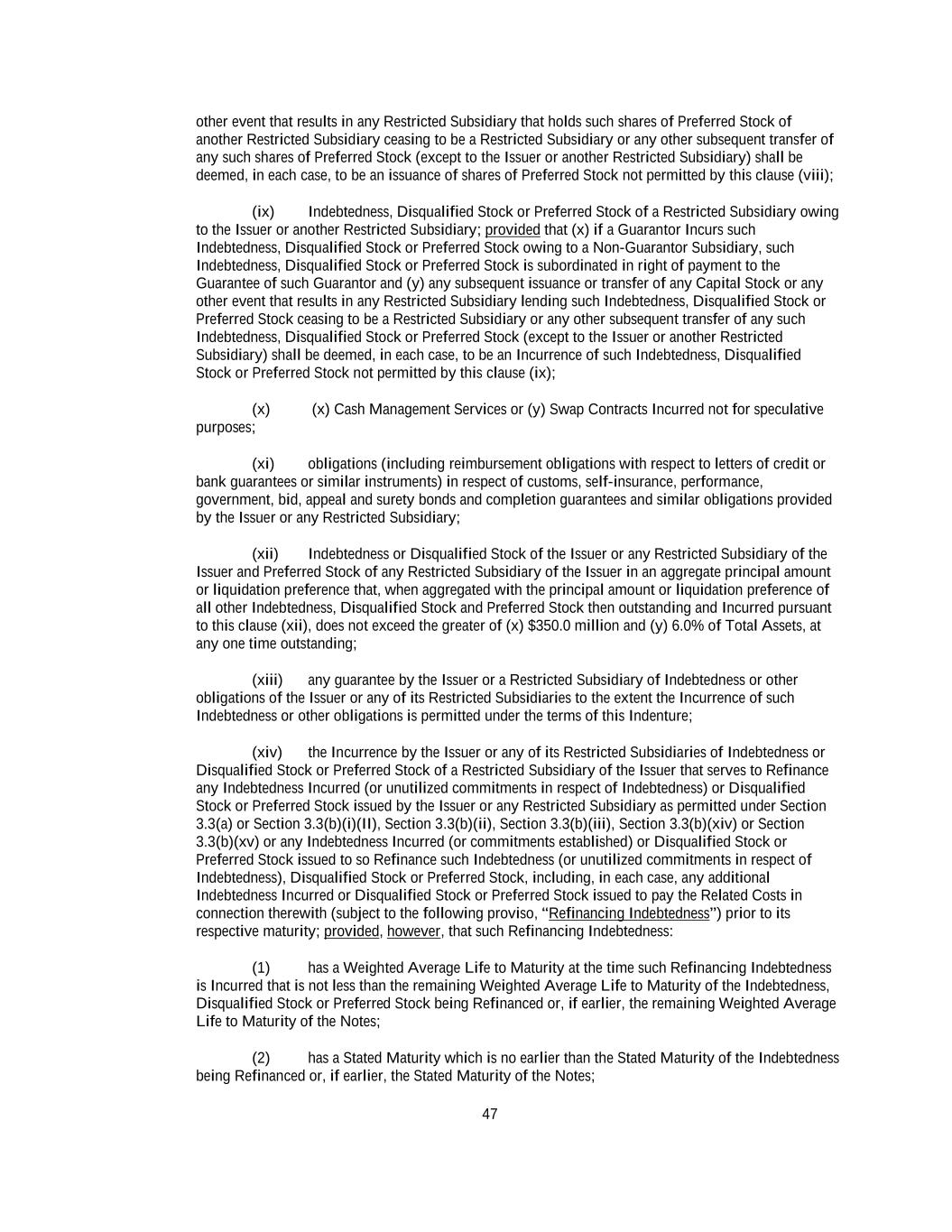 47 other event that results in any Restricted Subsidiary that holds such shares of Preferred Stock of another Restricted Subsidiary ceasing to be a Restricted Subsidiary or any other subsequent transfer of any such shares of Preferred Stock (except to the Issuer or another Restricted Subsidiary) shall be deemed, in each case, to be an issuance of shares of Preferred Stock not permitted by this clause (viii); (ix) Indebtedness, Disqualified Stock or Preferred Stock of a Restricted Subsidiary owing to the Issuer or another Restricted Subsidiary; provided that (x) if a Guarantor Incurs such Indebtedness, Disqualified Stock or Preferred Stock owing to a Non-Guarantor Subsidiary, such Indebtedness, Disqualified Stock or Preferred Stock is subordinated in right of payment to the Guarantee of such Guarantor and (y) any subsequent issuance or transfer of any Capital Stock or any other event that results in any Restricted Subsidiary lending such Indebtedness, Disqualified Stock or Preferred Stock ceasing to be a Restricted Subsidiary or any other subsequent transfer of any such Indebtedness, Disqualified Stock or Preferred Stock (except to the Issuer or another Restricted Subsidiary) shall be deemed, in each case, to be an Incurrence of such Indebtedness, Disqualified Stock or Preferred Stock not permitted by this clause (ix); (x) (x) Cash Management Services or (y) Swap Contracts Incurred not for speculative purposes; (xi) obligations (including reimbursement obligations with respect to letters of credit or bank guarantees or similar instruments) in respect of customs, self-insurance, performance, government, bid, appeal and surety bonds and completion guarantees and similar obligations provided by the Issuer or any Restricted Subsidiary; (xii) Indebtedness or Disqualified Stock of the Issuer or any Restricted Subsidiary of the Issuer and Preferred Stock of any Restricted Subsidiary of the Issuer in an aggregate principal amount or liquidation preference that, when aggregated with the principal amount or liquidation preference of all other Indebtedness, Disqualified Stock and Preferred Stock then outstanding and Incurred pursuant to this clause (xii), does not exceed the greater of (x) $350.0 million and (y) 6.0% of Total Assets, at any one time outstanding; (xiii) any guarantee by the Issuer or a Restricted Subsidiary of Indebtedness or other obligations of the Issuer or any of its Restricted Subsidiaries to the extent the Incurrence of such Indebtedness or other obligations is permitted under the terms of this Indenture; (xiv) the Incurrence by the Issuer or any of its Restricted Subsidiaries of Indebtedness or Disqualified Stock or Preferred Stock of a Restricted Subsidiary of the Issuer that serves to Refinance any Indebtedness Incurred (or unutilized commitments in respect of Indebtedness) or Disqualified Stock or Preferred Stock issued by the Issuer or any Restricted Subsidiary as permitted under Section 3.3(a) or Section 3.3(b)(i)(II), Section 3.3(b)(ii), Section 3.3(b)(iii), Section 3.3(b)(xiv) or Section 3.3(b)(xv) or any Indebtedness Incurred (or commitments established) or Disqualified Stock or Preferred Stock issued to so Refinance such Indebtedness (or unutilized commitments in respect of Indebtedness), Disqualified Stock or Preferred Stock, including, in each case, any additional Indebtedness Incurred or Disqualified Stock or Preferred Stock issued to pay the Related Costs in connection therewith (subject to the following proviso, “Refinancing Indebtedness”) prior to its respective maturity; provided, however, that such Refinancing Indebtedness: (1) has a Weighted Average Life to Maturity at the time such Refinancing Indebtedness is Incurred that is not less than the remaining Weighted Average Life to Maturity of the Indebtedness, Disqualified Stock or Preferred Stock being Refinanced or, if earlier, the remaining Weighted Average Life to Maturity of the Notes; (2) has a Stated Maturity which is no earlier than the Stated Maturity of the Indebtedness being Refinanced or, if earlier, the Stated Maturity of the Notes;