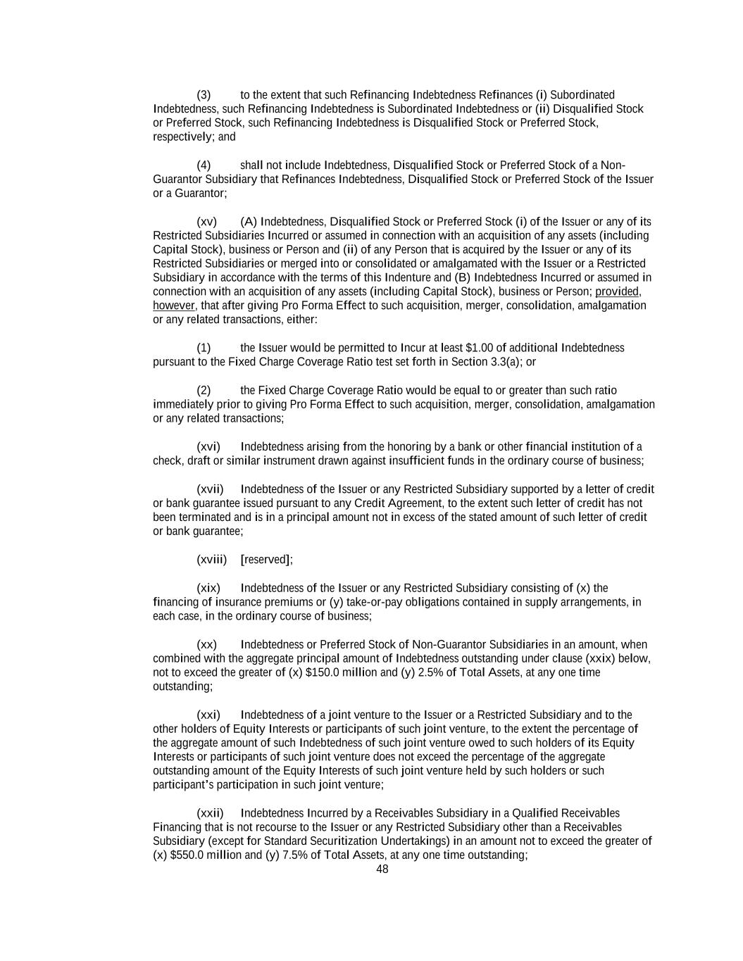 48 (3) to the extent that such Refinancing Indebtedness Refinances (i) Subordinated Indebtedness, such Refinancing Indebtedness is Subordinated Indebtedness or (ii) Disqualified Stock or Preferred Stock, such Refinancing Indebtedness is Disqualified Stock or Preferred Stock, respectively; and (4) shall not include Indebtedness, Disqualified Stock or Preferred Stock of a Non- Guarantor Subsidiary that Refinances Indebtedness, Disqualified Stock or Preferred Stock of the Issuer or a Guarantor; (xv) (A) Indebtedness, Disqualified Stock or Preferred Stock (i) of the Issuer or any of its Restricted Subsidiaries Incurred or assumed in connection with an acquisition of any assets (including Capital Stock), business or Person and (ii) of any Person that is acquired by the Issuer or any of its Restricted Subsidiaries or merged into or consolidated or amalgamated with the Issuer or a Restricted Subsidiary in accordance with the terms of this Indenture and (B) Indebtedness Incurred or assumed in connection with an acquisition of any assets (including Capital Stock), business or Person; provided, however, that after giving Pro Forma Effect to such acquisition, merger, consolidation, amalgamation or any related transactions, either: (1) the Issuer would be permitted to Incur at least $1.00 of additional Indebtedness pursuant to the Fixed Charge Coverage Ratio test set forth in Section 3.3(a); or (2) the Fixed Charge Coverage Ratio would be equal to or greater than such ratio immediately prior to giving Pro Forma Effect to such acquisition, merger, consolidation, amalgamation or any related transactions; (xvi) Indebtedness arising from the honoring by a bank or other financial institution of a check, draft or similar instrument drawn against insufficient funds in the ordinary course of business; (xvii) Indebtedness of the Issuer or any Restricted Subsidiary supported by a letter of credit or bank guarantee issued pursuant to any Credit Agreement, to the extent such letter of credit has not been terminated and is in a principal amount not in excess of the stated amount of such letter of credit or bank guarantee; (xviii) [reserved]; (xix) Indebtedness of the Issuer or any Restricted Subsidiary consisting of (x) the financing of insurance premiums or (y) take-or-pay obligations contained in supply arrangements, in each case, in the ordinary course of business; (xx) Indebtedness or Preferred Stock of Non-Guarantor Subsidiaries in an amount, when combined with the aggregate principal amount of Indebtedness outstanding under clause (xxix) below, not to exceed the greater of (x) $150.0 million and (y) 2.5% of Total Assets, at any one time outstanding; (xxi) Indebtedness of a joint venture to the Issuer or a Restricted Subsidiary and to the other holders of Equity Interests or participants of such joint venture, to the extent the percentage of the aggregate amount of such Indebtedness of such joint venture owed to such holders of its Equity Interests or participants of such joint venture does not exceed the percentage of the aggregate outstanding amount of the Equity Interests of such joint venture held by such holders or such participant’s participation in such joint venture; (xxii) Indebtedness Incurred by a Receivables Subsidiary in a Qualified Receivables Financing that is not recourse to the Issuer or any Restricted Subsidiary other than a Receivables Subsidiary (except for Standard Securitization Undertakings) in an amount not to exceed the greater of (x) $550.0 million and (y) 7.5% of Total Assets, at any one time outstanding;