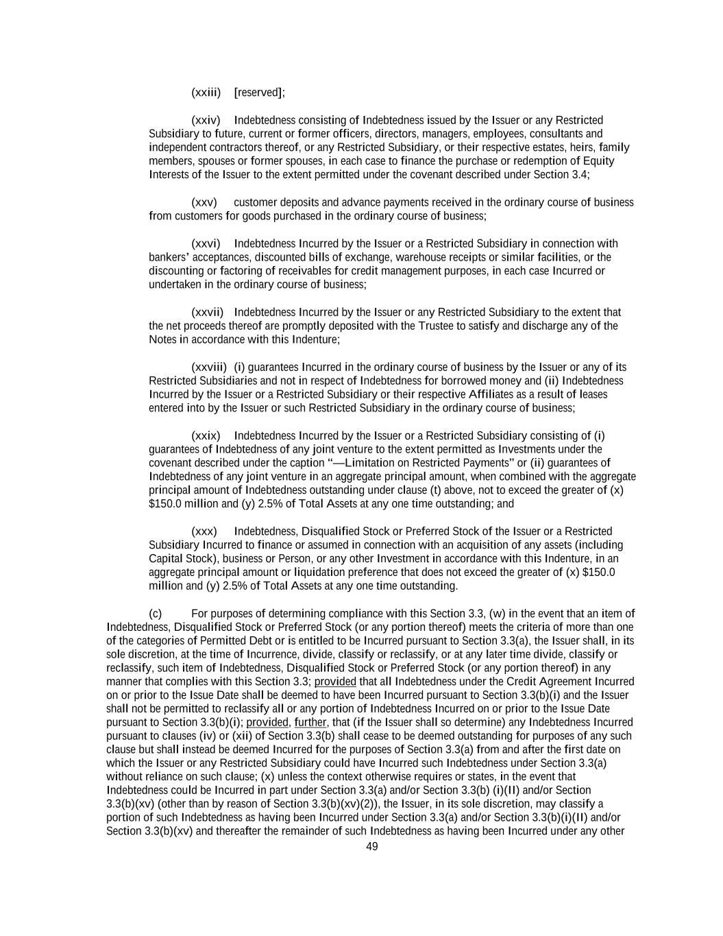 49 (xxiii) [reserved]; (xxiv) Indebtedness consisting of Indebtedness issued by the Issuer or any Restricted Subsidiary to future, current or former officers, directors, managers, employees, consultants and independent contractors thereof, or any Restricted Subsidiary, or their respective estates, heirs, family members, spouses or former spouses, in each case to finance the purchase or redemption of Equity Interests of the Issuer to the extent permitted under the covenant described under Section 3.4; (xxv) customer deposits and advance payments received in the ordinary course of business from customers for goods purchased in the ordinary course of business; (xxvi) Indebtedness Incurred by the Issuer or a Restricted Subsidiary in connection with bankers’ acceptances, discounted bills of exchange, warehouse receipts or similar facilities, or the discounting or factoring of receivables for credit management purposes, in each case Incurred or undertaken in the ordinary course of business; (xxvii) Indebtedness Incurred by the Issuer or any Restricted Subsidiary to the extent that the net proceeds thereof are promptly deposited with the Trustee to satisfy and discharge any of the Notes in accordance with this Indenture; (xxviii) (i) guarantees Incurred in the ordinary course of business by the Issuer or any of its Restricted Subsidiaries and not in respect of Indebtedness for borrowed money and (ii) Indebtedness Incurred by the Issuer or a Restricted Subsidiary or their respective Affiliates as a result of leases entered into by the Issuer or such Restricted Subsidiary in the ordinary course of business; (xxix) Indebtedness Incurred by the Issuer or a Restricted Subsidiary consisting of (i) guarantees of Indebtedness of any joint venture to the extent permitted as Investments under the covenant described under the caption “—Limitation on Restricted Payments” or (ii) guarantees of Indebtedness of any joint venture in an aggregate principal amount, when combined with the aggregate principal amount of Indebtedness outstanding under clause (t) above, not to exceed the greater of (x) $150.0 million and (y) 2.5% of Total Assets at any one time outstanding; and (xxx) Indebtedness, Disqualified Stock or Preferred Stock of the Issuer or a Restricted Subsidiary Incurred to finance or assumed in connection with an acquisition of any assets (including Capital Stock), business or Person, or any other Investment in accordance with this Indenture, in an aggregate principal amount or liquidation preference that does not exceed the greater of (x) $150.0 million and (y) 2.5% of Total Assets at any one time outstanding. (c) For purposes of determining compliance with this Section 3.3, (w) in the event that an item of Indebtedness, Disqualified Stock or Preferred Stock (or any portion thereof) meets the criteria of more than one of the categories of Permitted Debt or is entitled to be Incurred pursuant to Section 3.3(a), the Issuer shall, in its sole discretion, at the time of Incurrence, divide, classify or reclassify, or at any later time divide, classify or reclassify, such item of Indebtedness, Disqualified Stock or Preferred Stock (or any portion thereof) in any manner that complies with this Section 3.3; provided that all Indebtedness under the Credit Agreement Incurred on or prior to the Issue Date shall be deemed to have been Incurred pursuant to Section 3.3(b)(i) and the Issuer shall not be permitted to reclassify all or any portion of Indebtedness Incurred on or prior to the Issue Date pursuant to Section 3.3(b)(i); provided, further, that (if the Issuer shall so determine) any Indebtedness Incurred pursuant to clauses (iv) or (xii) of Section 3.3(b) shall cease to be deemed outstanding for purposes of any such clause but shall instead be deemed Incurred for the purposes of Section 3.3(a) from and after the first date on which the Issuer or any Restricted Subsidiary could have Incurred such Indebtedness under Section 3.3(a) without reliance on such clause; (x) unless the context otherwise requires or states, in the event that Indebtedness could be Incurred in part under Section 3.3(a) and/or Section 3.3(b) (i)(II) and/or Section 3.3(b)(xv) (other than by reason of Section 3.3(b)(xv)(2)), the Issuer, in its sole discretion, may classify a portion of such Indebtedness as having been Incurred under Section 3.3(a) and/or Section 3.3(b)(i)(II) and/or Section 3.3(b)(xv) and thereafter the remainder of such Indebtedness as having been Incurred under any other
