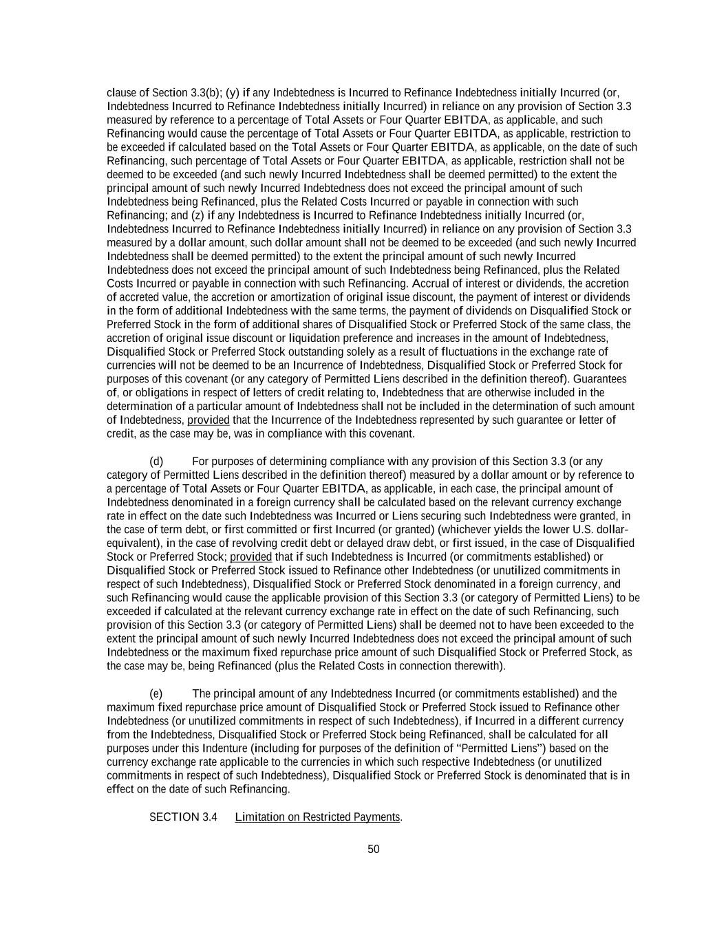 50 clause of Section 3.3(b); (y) if any Indebtedness is Incurred to Refinance Indebtedness initially Incurred (or, Indebtedness Incurred to Refinance Indebtedness initially Incurred) in reliance on any provision of Section 3.3 measured by reference to a percentage of Total Assets or Four Quarter EBITDA, as applicable, and such Refinancing would cause the percentage of Total Assets or Four Quarter EBITDA, as applicable, restriction to be exceeded if calculated based on the Total Assets or Four Quarter EBITDA, as applicable, on the date of such Refinancing, such percentage of Total Assets or Four Quarter EBITDA, as applicable, restriction shall not be deemed to be exceeded (and such newly Incurred Indebtedness shall be deemed permitted) to the extent the principal amount of such newly Incurred Indebtedness does not exceed the principal amount of such Indebtedness being Refinanced, plus the Related Costs Incurred or payable in connection with such Refinancing; and (z) if any Indebtedness is Incurred to Refinance Indebtedness initially Incurred (or, Indebtedness Incurred to Refinance Indebtedness initially Incurred) in reliance on any provision of Section 3.3 measured by a dollar amount, such dollar amount shall not be deemed to be exceeded (and such newly Incurred Indebtedness shall be deemed permitted) to the extent the principal amount of such newly Incurred Indebtedness does not exceed the principal amount of such Indebtedness being Refinanced, plus the Related Costs Incurred or payable in connection with such Refinancing. Accrual of interest or dividends, the accretion of accreted value, the accretion or amortization of original issue discount, the payment of interest or dividends in the form of additional Indebtedness with the same terms, the payment of dividends on Disqualified Stock or Preferred Stock in the form of additional shares of Disqualified Stock or Preferred Stock of the same class, the accretion of original issue discount or liquidation preference and increases in the amount of Indebtedness, Disqualified Stock or Preferred Stock outstanding solely as a result of fluctuations in the exchange rate of currencies will not be deemed to be an Incurrence of Indebtedness, Disqualified Stock or Preferred Stock for purposes of this covenant (or any category of Permitted Liens described in the definition thereof). Guarantees of, or obligations in respect of letters of credit relating to, Indebtedness that are otherwise included in the determination of a particular amount of Indebtedness shall not be included in the determination of such amount of Indebtedness, provided that the Incurrence of the Indebtedness represented by such guarantee or letter of credit, as the case may be, was in compliance with this covenant. (d) For purposes of determining compliance with any provision of this Section 3.3 (or any category of Permitted Liens described in the definition thereof) measured by a dollar amount or by reference to a percentage of Total Assets or Four Quarter EBITDA, as applicable, in each case, the principal amount of Indebtedness denominated in a foreign currency shall be calculated based on the relevant currency exchange rate in effect on the date such Indebtedness was Incurred or Liens securing such Indebtedness were granted, in the case of term debt, or first committed or first Incurred (or granted) (whichever yields the lower U.S. dollar- equivalent), in the case of revolving credit debt or delayed draw debt, or first issued, in the case of Disqualified Stock or Preferred Stock; provided that if such Indebtedness is Incurred (or commitments established) or Disqualified Stock or Preferred Stock issued to Refinance other Indebtedness (or unutilized commitments in respect of such Indebtedness), Disqualified Stock or Preferred Stock denominated in a foreign currency, and such Refinancing would cause the applicable provision of this Section 3.3 (or category of Permitted Liens) to be exceeded if calculated at the relevant currency exchange rate in effect on the date of such Refinancing, such provision of this Section 3.3 (or category of Permitted Liens) shall be deemed not to have been exceeded to the extent the principal amount of such newly Incurred Indebtedness does not exceed the principal amount of such Indebtedness or the maximum fixed repurchase price amount of such Disqualified Stock or Preferred Stock, as the case may be, being Refinanced (plus the Related Costs in connection therewith). (e) The principal amount of any Indebtedness Incurred (or commitments established) and the maximum fixed repurchase price amount of Disqualified Stock or Preferred Stock issued to Refinance other Indebtedness (or unutilized commitments in respect of such Indebtedness), if Incurred in a different currency from the Indebtedness, Disqualified Stock or Preferred Stock being Refinanced, shall be calculated for all purposes under this Indenture (including for purposes of the definition of “Permitted Liens”) based on the currency exchange rate applicable to the currencies in which such respective Indebtedness (or unutilized commitments in respect of such Indebtedness), Disqualified Stock or Preferred Stock is denominated that is in effect on the date of such Refinancing. SECTION 3.4 Limitation on Restricted Payments.