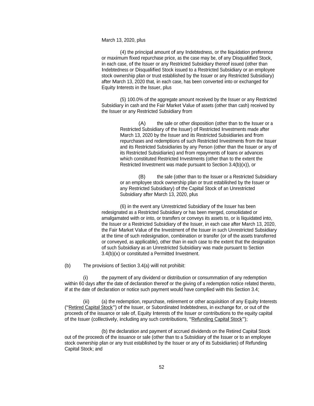 52 March 13, 2020, plus (4) the principal amount of any Indebtedness, or the liquidation preference or maximum fixed repurchase price, as the case may be, of any Disqualified Stock, in each case, of the Issuer or any Restricted Subsidiary thereof issued (other than Indebtedness or Disqualified Stock issued to a Restricted Subsidiary or an employee stock ownership plan or trust established by the Issuer or any Restricted Subsidiary) after March 13, 2020 that, in each case, has been converted into or exchanged for Equity Interests in the Issuer, plus (5) 100.0% of the aggregate amount received by the Issuer or any Restricted Subsidiary in cash and the Fair Market Value of assets (other than cash) received by the Issuer or any Restricted Subsidiary from (A) the sale or other disposition (other than to the Issuer or a Restricted Subsidiary of the Issuer) of Restricted Investments made after March 13, 2020 by the Issuer and its Restricted Subsidiaries and from repurchases and redemptions of such Restricted Investments from the Issuer and its Restricted Subsidiaries by any Person (other than the Issuer or any of its Restricted Subsidiaries) and from repayments of loans or advances which constituted Restricted Investments (other than to the extent the Restricted Investment was made pursuant to Section 3.4(b)(x)), or (B) the sale (other than to the Issuer or a Restricted Subsidiary or an employee stock ownership plan or trust established by the Issuer or any Restricted Subsidiary) of the Capital Stock of an Unrestricted Subsidiary after March 13, 2020, plus (6) in the event any Unrestricted Subsidiary of the Issuer has been redesignated as a Restricted Subsidiary or has been merged, consolidated or amalgamated with or into, or transfers or conveys its assets to, or is liquidated into, the Issuer or a Restricted Subsidiary of the Issuer, in each case after March 13, 2020, the Fair Market Value of the Investment of the Issuer in such Unrestricted Subsidiary at the time of such redesignation, combination or transfer (or of the assets transferred or conveyed, as applicable), other than in each case to the extent that the designation of such Subsidiary as an Unrestricted Subsidiary was made pursuant to Section 3.4(b)(x) or constituted a Permitted Investment. (b) The provisions of Section 3.4(a) will not prohibit: (i) the payment of any dividend or distribution or consummation of any redemption within 60 days after the date of declaration thereof or the giving of a redemption notice related thereto, if at the date of declaration or notice such payment would have complied with this Section 3.4; (ii) (a) the redemption, repurchase, retirement or other acquisition of any Equity Interests (“Retired Capital Stock”) of the Issuer, or Subordinated Indebtedness, in exchange for, or out of the proceeds of the issuance or sale of, Equity Interests of the Issuer or contributions to the equity capital of the Issuer (collectively, including any such contributions, “Refunding Capital Stock”); (b) the declaration and payment of accrued dividends on the Retired Capital Stock out of the proceeds of the issuance or sale (other than to a Subsidiary of the Issuer or to an employee stock ownership plan or any trust established by the Issuer or any of its Subsidiaries) of Refunding Capital Stock; and
