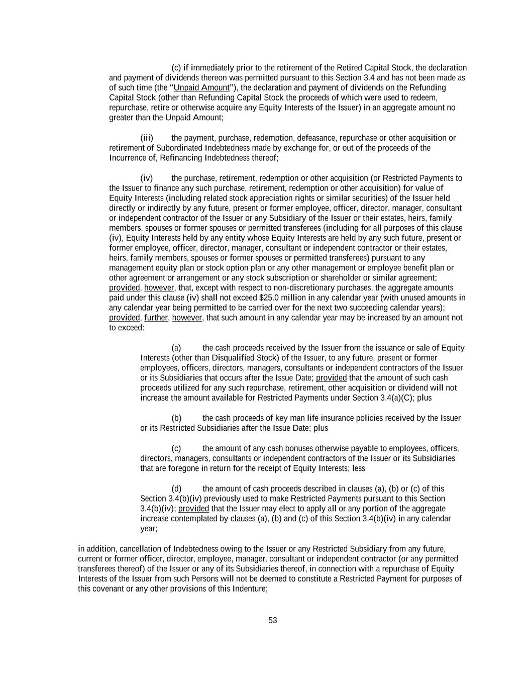 53 (c) if immediately prior to the retirement of the Retired Capital Stock, the declaration and payment of dividends thereon was permitted pursuant to this Section 3.4 and has not been made as of such time (the “Unpaid Amount”), the declaration and payment of dividends on the Refunding Capital Stock (other than Refunding Capital Stock the proceeds of which were used to redeem, repurchase, retire or otherwise acquire any Equity Interests of the Issuer) in an aggregate amount no greater than the Unpaid Amount; (iii) the payment, purchase, redemption, defeasance, repurchase or other acquisition or retirement of Subordinated Indebtedness made by exchange for, or out of the proceeds of the Incurrence of, Refinancing Indebtedness thereof; (iv) the purchase, retirement, redemption or other acquisition (or Restricted Payments to the Issuer to finance any such purchase, retirement, redemption or other acquisition) for value of Equity Interests (including related stock appreciation rights or similar securities) of the Issuer held directly or indirectly by any future, present or former employee, officer, director, manager, consultant or independent contractor of the Issuer or any Subsidiary of the Issuer or their estates, heirs, family members, spouses or former spouses or permitted transferees (including for all purposes of this clause (iv), Equity Interests held by any entity whose Equity Interests are held by any such future, present or former employee, officer, director, manager, consultant or independent contractor or their estates, heirs, family members, spouses or former spouses or permitted transferees) pursuant to any management equity plan or stock option plan or any other management or employee benefit plan or other agreement or arrangement or any stock subscription or shareholder or similar agreement; provided, however, that, except with respect to non-discretionary purchases, the aggregate amounts paid under this clause (iv) shall not exceed $25.0 million in any calendar year (with unused amounts in any calendar year being permitted to be carried over for the next two succeeding calendar years); provided, further, however, that such amount in any calendar year may be increased by an amount not to exceed: (a) the cash proceeds received by the Issuer from the issuance or sale of Equity Interests (other than Disqualified Stock) of the Issuer, to any future, present or former employees, officers, directors, managers, consultants or independent contractors of the Issuer or its Subsidiaries that occurs after the Issue Date; provided that the amount of such cash proceeds utilized for any such repurchase, retirement, other acquisition or dividend will not increase the amount available for Restricted Payments under Section 3.4(a)(C); plus (b) the cash proceeds of key man life insurance policies received by the Issuer or its Restricted Subsidiaries after the Issue Date; plus (c) the amount of any cash bonuses otherwise payable to employees, officers, directors, managers, consultants or independent contractors of the Issuer or its Subsidiaries that are foregone in return for the receipt of Equity Interests; less (d) the amount of cash proceeds described in clauses (a), (b) or (c) of this Section 3.4(b)(iv) previously used to make Restricted Payments pursuant to this Section 3.4(b)(iv); provided that the Issuer may elect to apply all or any portion of the aggregate increase contemplated by clauses (a), (b) and (c) of this Section 3.4(b)(iv) in any calendar year; in addition, cancellation of Indebtedness owing to the Issuer or any Restricted Subsidiary from any future, current or former officer, director, employee, manager, consultant or independent contractor (or any permitted transferees thereof) of the Issuer or any of its Subsidiaries thereof, in connection with a repurchase of Equity Interests of the Issuer from such Persons will not be deemed to constitute a Restricted Payment for purposes of this covenant or any other provisions of this Indenture;